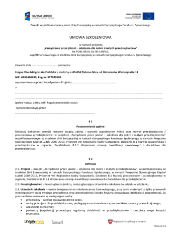 Projekt współfinansowany przez Unię Europejską w ramach Europejskiego Funduszu Społecznego UMOWA SZKOLENIOWA w ramach projektu „Zarządzanie przez jakośd – szkolenia dla mikro i małych przedsiębiorców” Nr POKL.08.01.01-30-149/10, współfinansowanego ze środków Unii Europejskiej w ramach Europejskiego Funduszu Społecznego Zawarta dnia ................................. pomiędzy: Lingua Viva Małgorzata Zielioska z siedzibą w 65-034 Zielona Góra, ul. Bohaterów Westerplatte 11 NIP: 6991460650, Regon: 977989106 reprezentowaną przez Koordynatora Projektu ……………………………………………………… a …………………………………………………………………………………………………………………………………………………………………………………………. …………………………………………………………………………………………………………………………………………………………………………………………. (pełna nazwa, adres, NIP, Regon przedsiębiorstwa) reprezentowanym przez ………………………………………………………………………………………………….. §1 Postanowienia ogólne Niniejszy dokument określa ramowe zasady, zakres i warunki uczestnictwa mikro oraz małych przedsiębiorstw / pracowników przedsiębiorstw, w projekcie „Zarządzanie przez jakośd – szkolenia dla mikro i małych przedsiębiorców” współfinansowanym ze środków Unii Europejskiej w ramach Europejskiego Funduszu Społecznego w ramach Programu Operacyjnego Kapitał Ludzki 2007-2013, Priorytet VIII Regionalne Kadry Gospodarki, Działanie 8.1 Rozwój pracowników i przedsiębiorstw w regionie, Poddziałanie 8.1.1 Wspieranie rozwoju kwalifikacji zawodowych i doradztwo dla przedsiębiorstw. §2 Definicje 2.1. Projekt – projekt „Zarządzanie przez jakośd – szkolenia dla mikro i małych przedsiębiorców”, współfinansowany ze środków Unii Europejskiej w ramach Europejskiego Funduszu Społecznego, w ramach Programu Operacyjnego Kapitał Ludzki 2007-2013, Priorytet VIII Regionalne Kadry Gospodarki, Działanie 8.1 Rozwój pracowników i przedsiębiorstw w regionie, Poddziałanie 8.1.1 Wspieranie rozwoju kwalifikacji zawodowych i doradztwo dla przedsiębiorstw. 2.2. Przedsiębiorstwo - Przedsiębiorca (mikro, mały) zgłaszający Uczestnika szkolenia do udziału w szkoleniu. 2.3. Uczestnik szkolenia – osoba delegowana na szkolenie przez Zamawiającego, przy czym może byd to tylko pracownik wydelegowany przez swojego pracodawcę oraz przedsiębiorca (osoba fizyczna prowadząca działalnośd gospodarczą). Za pracowników uznawane są następujące osoby: pracownicy – według krajowego prawa pracy, osoby pracujące dla przedsiębiorstwa, podlegające mu i uważane za pracowników na mocy prawa krajowego, właściciele-kierownicy, partnerzy (wspólnicy) prowadzący regularną działalnośd w przedsiębiorstwie i czerpiący niego korzyści finansowe. Strona 1 z 5 Projekt współfinansowany przez Unię Europejską w ramach Europejskiego Funduszu Społecznego 2.4. Organizator szkolenia - Lingua Viva Małgorzata Zielioska z siedzibą w Zielonej Górze, ul. Boh. Westerplatte 11, NIP: 6991460650, Regon: 977989106 §3 Terytorialny i czasowy zakres Projektu Projekt jest realizowany od 31.03.2011 do 31.08.2012. Obszarem realizacji projektu jest województwo wielkopolskie (powiat gostyoski, krotoszyoski, leszczyoski i miasto Leszno). Odbędą się 3 edycje szkoleo: I od 06.2011 do 10.2011, II od 11.2011 do 03.2012, III od 04.2012 do 08.2012 §4 Cel Projektu Celem głównym Projektu jest podniesienie wiedzy i zdobycie nowych kwalifikacji z zakresu zarządzania pracowników oraz przedstawicieli kadry zarządzającej zatrudnionych w mikro i małych przedsiębiorstwach z terenu powiatu wolsztyoskiego, poznaoskiego oraz miasta Poznania. Cele szczegółowe: stworzenie warunków do podniesienia jakości zarządzania mikro i małymi przedsiębiorstwami poprzez realizację szkoleo z zakresu Total Quality Management; zdobycie nowych kwalifikacji zawodowych z zakresu zarządzania jakością przez Uczestników szkolenia, co przyczyni się do zwiększenia elastyczności ich funkcjonowania na rynku pracy; podniesienie poziomu wiedzy i umiejętności Uczestników szkolenia w zakresie wykorzystania języka angielskiego w kontaktach biznesowych oraz zarządzaniu firmą; wsparcie Przedsiębiorstw poprzez dostarczenie szkoleo, które zwiększą kompetencje ich pracowników. §5 Zakres usług oferowanych w projekcie Każdy z Uczestników szkolenia skorzysta z 2 rodzajów szkoleo ogólnych: 1. szkolenie z zakresu Total Quality Managamnet (56x45min) „Moje miejsce w TQM” (14x45min) „Poczucie własnej wartości i pozytywna komunikacja” (14x45min) „Zasady pracy w zespole” (14x45min) „Motywowanie siebie i innych” (14x45min) 2. szkolenie z zakresu języka angielskiego biznesowego na różnych poziomach zaawansowania z zastosowaniem multimedialnej platformy e-learningowej (60x45min) Zajęcia z zakresu TQM będą realizowane w systemie weekendowym (1 blok w 1 weekend – raz w miesiącu), natomiast zajęcia z zakresu języka angielskiego będą realizowane w trybie tygodniowym (2 dni w tygodniu po 2x45min zajęd) lub weekendowym (1 dzieo po 4x45min zajęd). Szkolenia będą realizowane w średnio 10 osobowych grupach. Uczestnicy szkolenia otrzymają bezpłatny komplet materiałów do każdego ze szkoleo oraz poczęstunek. W procesie nauczania języka wykorzystywana będzie platforma e-learningowa. Uczestnicy szkolenia, którzy nie posiadają dostępu do internetu, będą mogli skorzystad ze specjalnie przygotowanych stanowisk komputerowych w miejscach realizacji szkoleo. Warunkiem ukooczenia udziału w projekcie będzie 80% frekwencja na zajęciach. Po zakooczeniu szkolenia Uczestnik szkolenia uzyska certyfikat uwzględniający uzyskaną oc