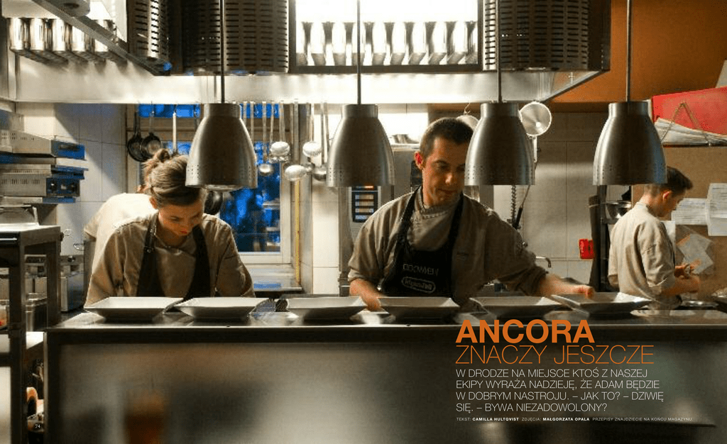 ANCORA ZNACZY JESZCZE W drodZE NA miEJSCE ktoś Z NASZEJ EkipY WYrAżA NAdZiEJę, żE AdAm będZiE W dobrYm NAStroJu. – JAk to? – dZiWię Się. – bYWA NiEZAdoWoloNY? T e k s T: C A M I L L A H U LT Q V I S T Z d j ę c i a : M A Ł G O R Z ATA O PA L A P r Z e P i s y Z n a j d Z i e c i e n a k o ń c u m a g a Z y n u . 74 ANCORA Filet z sANDACzA zApiekANy pod suszonymi borowikami DzWONek jest jednym z ulubionych przedmiotów adama w jego kuchni. W odpowiedzi słyszę, jak to Adam w którymś wywiadzie stwierdził, iż gdy jest szczęśliwy, przygotowywane przez niego jedzenie jest lżejsze, puszyste i odwrotnie. Tym bardziej więc liczymy na to, że zastaniemy go w radosnym nastroju. Po pierwsze, wtedy przyjemniej się rozmawia, a po drugie, jedzenie będzie wyśmienite. Adam Chrząstowski kwituje śmiechem cytat z wywiadu. – To żadna tajemnica. Dobry nastrój sprawia, że wszystko lepiej smakuje. Zapewnia nas jednak, że różnica między wyczynem kulinarnym a mniej udaną potrawą nie musi być wyraźna. – Kucharze zauważają takie rzeczy, ale nie goście, przynajmniej taką mam nadzieję. Adam przyznaje, że ma nieco „głośny” styl pracy. I to nie tylko dlatego, że kuchnia jest otwarta na salę restauracyjną. Niektórzy goście to lubią, inni nie. – Przed kilkoma dniami kilka osób usadowiło się tuż obok nas. Akurat mieliśmy duży ruch, kiedy trzeba szybko podejmować decyzje. Krzyczałem na kelnerów, a do tego próbowałem zrobić kilka rzeczy naraz. Nagle w samym środku wrzawy ktoś z towarzystwa przy stole skomentował, że to kuchenne show jest lepsze od jedzenia. „Trafiliśmy do Hells Kitchen. To drugi Gordon Ramsay!” 76 Dzięki otwartej kuchni goście widzą i słyszą wszystko. Niektórzy myślą, że za tymi drzwiami mieści się druga, większa, ale tam mamy tylko zmywak i strefę do przechowywania produktów. – Ile osób pracuje jednocześnie w kuchni? – Około pięciu na każdej zmianie, trzech kucharzy, ja oraz nasz sous-chef, czyli prawa ręka szefa kuchni, a prywatnie moja dziewczyna. Wszyscy w zespole Adama to Polacy, z wyjątkiem sommeliera, który pochodzi z Francji i pracował wcześniej w trzygwiazdkowej restauracji Gordona Ramsaya. – Od 2008 roku rekomenduje was przewodnik Michelin. Jak opisałbyś podawane przez was jedzenie? – Jako moje własne! – odpowiada Adam bez zastanowienia. Nie chce dać się zaszufladkować. – Określenie naszej kuchni jako new polish cuisine uznałbym za satysfakcjonujące – dodaje jednak po chwili. W karcie około jedną trzecią stanowią miejscowe specjały, reszta to menu międzynarodowe, dla którego mniej lub bardziej trafną nazwą będzie fusion. Adam mówi, że nie może zbyt często zmieniać karty, ponieważ wtedy otrzymuje skargi od gości rozczarowanych brakiem ich ulubionych potraw. – Musimy zachować nasze klasyczne propozycje, takie jak zupa rybna czy dania z jagnięciny. Może się zdarzyć, że przy- ANCORA kReWetki z imbirowym musem i sałatką z kiełków WęDzONe gRuszki oczekują na połączenie z jelenim combrem z przygotowywanego na wieczór menu degustacyjnego. doskonale łączą się również z inną dziczyzną bądź bigosem. pŁAtki mARyNOWANej gęsi podane z sałatką z gruszek i ziół „ Goście często pytają mnie, jak robię jagnięcinę, czy marynuję ją w szczególny sposób. A ja po prostu otwieram opakowanie, smażę mięso, po czym wkładam je do piekarnika. Smak bierze się z jakości samej jagnięciny. Niczego więcej nie potrzeba” . rządzam je trochę inaczej, ale podstawowe składniki są zawsze takie same. Adam lubi aromatyczne warzywa korzeniowe i przyprawy. Przed wiekami imbir, szafran, cynamon i pieprz, używane w kuchniach arystokratów, świadczyły o statusie. Z czasem stały się naturalną częścią polskiej tradycji kulinarnej. Początkowo korzystano z przypraw suszonych, obecnie dostępne są również świeże, na przykład kłącza imbiru – jeden z ulubionych dodatków Adama. – Niewielu kucharzy w kraju stara się, oprócz kontynuowania dobrze znanej nam tradycji, spojrzeć szerzej na polską kulturę kulinarną. W każdym przewodniku opisuje się kiszoną kapustę, kiełbasę i żurek, lecz to tylko jedna „noga” owej kultury, mianowicie tradycja chłopska. Zapominamy o drugiej, jaką jest kuchnia arystokracji albo, szerzej, jedzenie, które przed wojną pojawiało się na stołach w każdym bogatym domu. Znajdziemy tu dziczyznę, gęś, kaczkę, owoce leśne, grzyby i przyprawy, o których wcześniej wspomniałem. Powinniśmy zadbać również o tę drugą „nogę”, bo na razie skaczemy tylko na jednej. Jeśli chcemy, żeby nasza kultura kulinarna zyskała uznanie na świecie, musimy mieć dwie równie sprawne nogi. Tylko wtedy będziemy mogli dogonić innych. Mam wrażenie, że ludzie trochę boją się tych składników i nie znają owej drugiej „nogi”. Zmiana sposobu myślenia musi potrwać. 78 Adam kształcił się na kucharza w trudnych czasach. Jego zawód nie cieszył się wtedy szacunkiem. – W szkole nie mieliśmy dostępu do mięsa, właściwie do żadnych dobrych produktów. Wszystko było na kartki. Nie inaczej wyglądało to w restauracjach, gdzie Adam odbywał praktyki. – Uczyliśmy się oszukiwać klientów, a nie przyrządzać jedzenie. Najgorzej Adam wspomina kucharza, który pokazywał im, jak przygotować sos holenderski. Woda, ocet, przyprawy, żółtka, masło. Wtedy kucharz przypomniał sobie, że sos powinien mieć posmak wina. Wypił kieliszek, chuchnął i gotowe. Adam nie mógł się pogodzić z takimi metodami. Perspektywa obowiązkowej wówczas dwuletniej służby wojskowej sprawiła, że trochę przez przypadek wybrał studia filozoficzne. – Co się stało, że znów jesteś w branży? – Na szczęście podczas studiów miałem okazję podróżować. Tak trafiłem początkowo „na zmywak” w dobrej restauracji w Szwajcarii. Właściciel przychodził wieczorami doglądać in