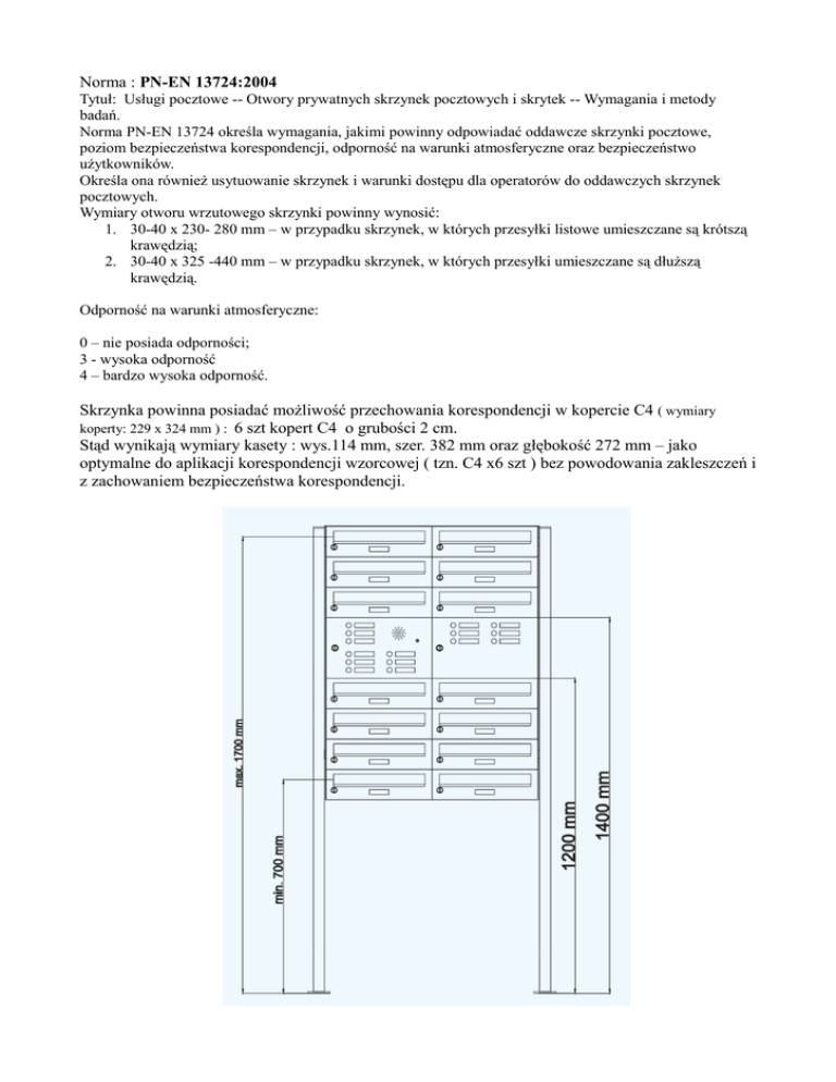 Norma : PN-EN 13724:2004 Tytuł: Usługi pocztowe -- Otwory prywatnych skrzynek pocztowych i skrytek -- Wymagania i metody badań. Norma PN-EN 13724 określa wymagania, jakimi powinny odpowiadać oddawcze skrzynki pocztowe, poziom bezpieczeństwa korespondencji, odporność na warunki atmosferyczne oraz bezpieczeństwo użytkowników. Określa ona również usytuowanie skrzynek i warunki dostępu dla operatorów do oddawczych skrzynek pocztowych. Wymiary otworu wrzutowego skrzynki powinny wynosić: 1. 30-40 x 230- 280 mm – w przypadku skrzynek, w których przesyłki listowe umieszczane są krótszą krawędzią; 2. 30-40 x 325 -440 mm – w przypadku skrzynek, w których przesyłki umieszczane są dłuższą krawędzią. Odporność na warunki atmosferyczne: 0 – nie posiada odporności; 3 - wysoka odporność 4 – bardzo wysoka odporność. Skrzynka powinna posiadać możliwość przechowania korespondencji w kopercie C4 ( wymiary koperty: 229 x 324 mm ) : 6 szt kopert C4 o grubości 2 cm. Stąd wynikają wymiary kasety : wys.114 mm, szer. 382 mm oraz głębokość 272 mm – jako optymalne do aplikacji korespondencji wzorcowej ( tzn. C4 x6 szt ) bez powodowania zakleszczeń i z zachowaniem bezpieczeństwa korespondencji. Rozporządzenie Ministra Infrastruktury Dz. U. Nr 177 /2003 poz. 1731: wyciąg : w załączeniu: pełny tekst w .pdf