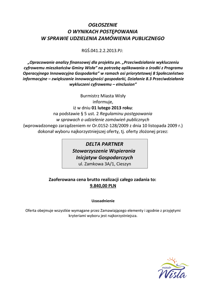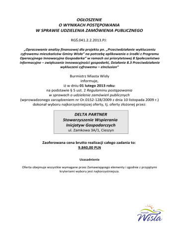 OGŁOSZENIE O WYNIKACH POSTĘPOWANIA W SPRAWIE UDZIELENIA ZAMÓWIENIA PUBLICZNEGO RGŚ.041.2.2.2013.PJ: „Opracowanie analizy finansowej dla projektu pn. „Przeciwdziałanie wykluczeniu cyfrowemu mieszkańców Gminy Wisła” na potrzebę aplikowania o środki z Programu Operacyjnego Innowacyjna Gospodarka” w ramach osi priorytetowej 8 Społeczeństwo informacyjne – zwiększanie innowacyjności gospodarki, Działanie 8.3 Przeciwdziałanie wykluczeni cyfrowemu – eInclusion” Burmistrz Miasta Wisły informuje, iż w dniu 01 lutego 2013 roku: na podstawie § 5 ust. 2 Regulaminu postępowania w sprawach o udzielenie zamówień publicznych (wprowadzonego zarządzeniem nr Or.0152-128/2009 z dnia 10 listopada 2009 r.) dokonał wyboru najkorzystniejszej oferty, tj. oferty złożonej przez: DELTA PARTNER Stowarzyszenie Wspierania Inicjatyw Gospodarczych ul. Zamkowa 3A/1, Cieszyn Zaoferowana cena brutto realizacji całego zadania to: 9.840,00 PLN Uzasadnienie Oferta obejmuje wszystkie wymagane przez Zamawiającego elementy i zgodnie z przyjętymi kryteriami wyboru jest najkorzystniejsza.