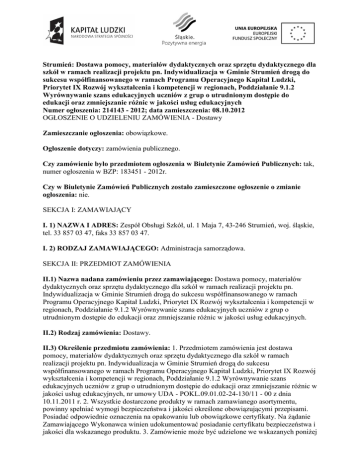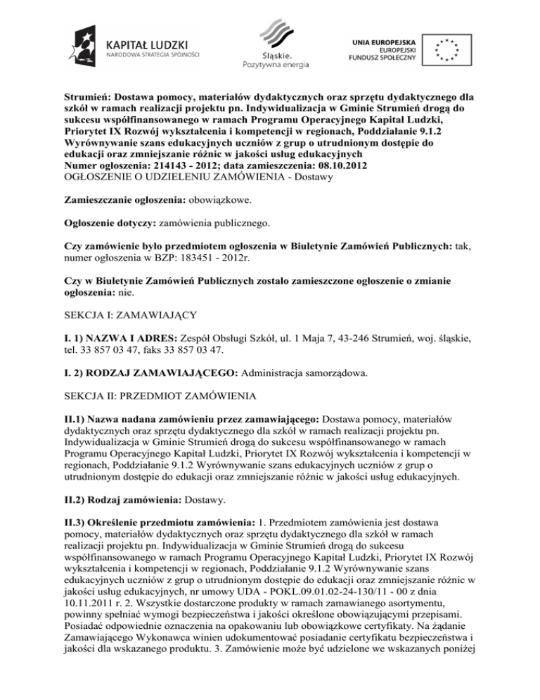 Strumień: Dostawa pomocy, materiałów dydaktycznych oraz sprzętu dydaktycznego dla szkół w ramach realizacji projektu pn. Indywidualizacja w Gminie Strumień drogą do sukcesu współfinansowanego w ramach Programu Operacyjnego Kapitał Ludzki, Priorytet IX Rozwój wykształcenia i kompetencji w regionach, Poddziałanie 9.1.2 Wyrównywanie szans edukacyjnych uczniów z grup o utrudnionym dostępie do edukacji oraz zmniejszanie różnic w jakości usług edukacyjnych Numer ogłoszenia: 214143 - 2012; data zamieszczenia: 08.10.2012 OGŁOSZENIE O UDZIELENIU ZAMÓWIENIA - Dostawy Zamieszczanie ogłoszenia: obowiązkowe. Ogłoszenie dotyczy: zamówienia publicznego. Czy zamówienie było przedmiotem ogłoszenia w Biuletynie Zamówień Publicznych: tak, numer ogłoszenia w BZP: 183451 - 2012r. Czy w Biuletynie Zamówień Publicznych zostało zamieszczone ogłoszenie o zmianie ogłoszenia: nie. SEKCJA I: ZAMAWIAJĄCY I. 1) NAZWA I ADRES: Zespół Obsługi Szkół, ul. 1 Maja 7, 43-246 Strumień, woj. śląskie, tel. 33 857 03 47, faks 33 857 03 47. I. 2) RODZAJ ZAMAWIAJĄCEGO: Administracja samorządowa. SEKCJA II: PRZEDMIOT ZAMÓWIENIA II.1) Nazwa nadana zamówieniu przez zamawiającego: Dostawa pomocy, materiałów dydaktycznych oraz sprzętu dydaktycznego dla szkół w ramach realizacji projektu pn. Indywidualizacja w Gminie Strumień drogą do sukcesu współfinansowanego w ramach Programu Operacyjnego Kapitał Ludzki, Priorytet IX Rozwój wykształcenia i kompetencji w regionach, Poddziałanie 9.1.2 Wyrównywanie szans edukacyjnych uczniów z grup o utrudnionym dostępie do edukacji oraz zmniejszanie różnic w jakości usług edukacyjnych. II.2) Rodzaj zamówienia: Dostawy. II.3) Określenie przedmiotu zamówienia: 1. Przedmiotem zamówienia jest dostawa pomocy, materiałów dydaktycznych oraz sprzętu dydaktycznego dla szkół w ramach realizacji projektu pn. Indywidualizacja w Gminie Strumień drogą do sukcesu współfinansowanego w ramach Programu Operacyjnego Kapitał Ludzki, Priorytet IX Rozwój wykształcenia i kompetencji w regionach, Poddziałanie 9.1.2 Wyrównywanie szans edukacyjnych uczniów z grup o utrudnionym dostępie do edukacji oraz zmniejszanie różnic w jakości usług edukacyjnych, nr umowy UDA - POKL.09.01.02-24-130/11 - 00 z dnia 10.11.2011 r. 2. Wszystkie dostarczone produkty w ramach zamawianego asortymentu, powinny spełniać wymogi bezpieczeństwa i jakości określone obowiązującymi przepisami. Posiadać odpowiednie oznaczenia na opakowaniu lub obowiązkowe certyfikaty. Na żądanie Zamawiającego Wykonawca winien udokumentować posiadanie certyfikatu bezpieczeństwa i jakości dla wskazanego produktu. 3. Zamówienie może być udzielone we wskazanych poniżej 8 częściach 4. Pomoce, materiały dydaktyczne oraz sprzęt dydaktyczny należy dostarczyć zgodnie z załącznikiem nr 5 do niniejszej SIWZ do odpowiedniej placówki oświatowej, w następujących częściach.: a) Część nr 1: Pomoce i materiały dydaktyczne do realizacji zajęć dla dzieci ze specyficznymi trudnościami w czytaniu i pisaniu oraz zagrożonych dysleksją, b) Część nr 2: Pomoce i materiały dydaktyczne do realizacji zajęć gimnastyki korekcyjnej dla dzieci z wadami postawy, c) Część nr 3: Pomoce i materiały dydaktyczne do realizacji zajęć rozwijających zainteresowania uczniów szczególnie uzdolnionych, d) Część nr 4: Pomoce i materiały dydaktyczne do realizacji zajęć logopedycznych dla dzieci z zaburzeniami rozwoju mowy, e) Część nr 5: Pomoce i materiały dydaktyczne do realizacji zajęć dla dzieci z trudnościami w zdobywaniu umiejętności matematycznych, f) Część nr 6: Pomoce i materiały dydaktyczne do realizacji zajęć socjoterapeutycznych i psychoedukacyjnych dla dzieci z zaburzeniami komunikacji społecznej, g) Część nr 7: Pomoce i materiały dydaktyczne do realizacji specjalistycznych zajęć terapeutycznych dla dzieci niepełnosprawnych, h) Część nr 8: Sprzęt dydaktyczny. 5. Szczegółowy opis przedmiotu zamówienia zawiera: a) Wykaz pomocy, materiałów dydaktycznych oraz sprzętu dydaktycznego dla szkół stanowiący załącznik nr 5 do niniejszej SIWZ, b) wzór umowy stanowiący załącznik nr 6 do niniejszej specyfikacji. 6. W sytuacji, gdy w trakcie realizacji zamówienia stanie się niemożliwe dostarczenie danej części przedmiotu umowy np. ze względu na brak pomocy lub materiału dydaktycznego na rynku i brak możliwości zaproponowania równoważnej pomocy lub materiału dydaktycznego, Zamawiający dopuszcza możliwość rezygnacji z tej części przedmiotu zamówienia, a tym samym stosowne obniżenie wynagrodzenia za przedmiot umowy dokonane na podstawie cen jednostkowych brutto i ilości z oferty Wykonawcy. 7. Zamawiający dopuszcza składanie ofert równoważnych. W przypadku, gdy pomoce i materiały dydaktyczne odnoszą się do określonego katalogu lub sklepu internetowego Zamawiający dopuszcza ujęcie w ofercie, a następnie dostarczenie innych równoważnych pomocy i materiałów dydaktycznych pod warunkiem posiadania przez nie parametrów nie gorszych niż pomoce i materiały dydaktyczne, które one zastępują. Wykazanie równoważności przedmiotu zamówienia (zgodnie z art. 30 ust. 5 Ustawy Pzp) spoczywa na Wykonawcy. II.4) Wspólny Słownik Zamówień (CPV): 39.16.21.00-6, 39.16.21.10-9. SEKCJA III: PROCEDURA III.1) TRYB UDZIELENIA ZAMÓWIENIA: Przetarg nieograniczony III.2) INFORMACJE ADMINISTRACYJNE • Zamówienie dotyczy projektu/programu finansowanego ze środków Unii Europejskiej: tak, projekt/program: Projekt pn. Indywidualizacja w Gminie Strumień drogą do sukcesu współfinansowany w ramach Programu Operacyjnego Kapitał Ludzki, Priorytet IX Rozwój wykształcenia i kompetencji w regionach, Poddziałanie 9.1.2 Wyrównywanie szans edukacyjnych uczniów z grup o utrudnionym dostępie do edukacji oraz zmniejszanie różnic w jakości usług edukacyjnych. SEKCJA IV: UDZIELENIE ZAMÓWIENIA Część NR: 1 Naz