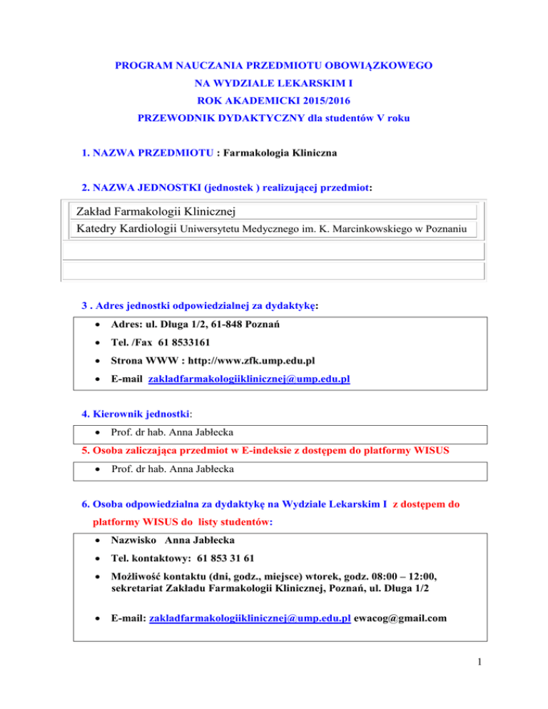 PROGRAM NAUCZANIA PRZEDMIOTU OBOWIĄZKOWEGO NA WYDZIALE LEKARSKIM I ROK AKADEMICKI 2015/2016 PRZEWODNIK DYDAKTYCZNY dla studentów V roku 1. NAZWA PRZEDMIOTU : Farmakologia Kliniczna 2. NAZWA JEDNOSTKI (jednostek ) realizującej przedmiot: Zakład Farmakologii Klinicznej Katedry Kardiologii Uniwersytetu Medycznego im. K. Marcinkowskiego w Poznaniu 3 . Adres jednostki odpowiedzialnej za dydaktykę: Adres: ul. Długa 1/2, 61-848 Poznań Tel. /Fax 61 8533161 Strona WWW : http://www.zfk.ump.edu.pl E-mail [email protected] 4. Kierownik jednostki: Prof. dr hab. Anna Jabłecka 5. Osoba zaliczająca przedmiot w E-indeksie z dostępem do platformy WISUS Prof. dr hab. Anna Jabłecka 6. Osoba odpowiedzialna za dydaktykę na Wydziale Lekarskim I z dostępem do platformy WISUS do listy studentów: Nazwisko Anna Jabłecka Tel. kontaktowy: 61 853 31 61 Możliwość kontaktu (dni, godz., miejsce) wtorek, godz. 08:00 – 12:00, sekretariat Zakładu Farmakologii Klinicznej, Poznań, ul. Długa 1/2 E-mail: [email protected] [email protected] 1 Osoba zastępująca dr med. Iwona Smolarek Kontakt 61 853 31 61 7. Miejsce przedmiotu w programie studiów: Rok: V Semestr: zimowy 8. Liczba godzin ogółem : 30 Jednostki uczestniczące w nauczaniu przedmiotu Zakład Farmakologii Klinicznej liczba pkt.ECTS: 2 Semestr zimowy liczba godzin W Ć Ćwiczenia kategoria 9 21 B Razem: Jednostki uczestniczące w nauczaniu przedmiotu S 30 Semestr letni liczba godzin W Ć Ćwiczenia kategoria S Razem: 9 . Cel nauczania przedmiotu Zgodnie z treścią zawartą w Rozporządzeniu Ministra Nauki i Szkolnictwa Wyższego z dnia 12 lipca 2007 roku w sprawie standardów kształcenia dla poszczególnych kierunków oraz poziomów kształcenia, załącznik 54 1. Poznanie uwarunkowań środowiskowych i epidemiologicznych , a także przyczyn, objawów, zasad diagnozowania i postepowania farmakologicznego w wybranych chorobach układu sercowo-naczyniowego, diabetologii, pulmonologii 2. Poznanie możliwości wykorzystania terapii monitorowanej, podstawowych parametrów farmakokinetycznych leków oraz metod farmakogenetycznych dla zwiększenia skuteczności i bezpieczeństwa stosowanych leków u ludzi. 2 3. Nabycie umiejętności profesjonalnej interpretacji danych zawartych w charakterystyce produktów leczniczych oraz danych z analiz farmakoekonomicznych. 4. Nabycie umiejętności rozpoznawania polekowych działań niepożądanych oraz interakcji między lekami. 5. Nabycie umiejętności indywidualizacji farmakoterapii wobec nieskuteczności bądź przeciwwskazań do terapii standardowej. 6. zasady farmakogenetyki, terapii genowej, terapii celowanej w onkologii, informacje o chorobach genetycznych/RNAi Efekt kształcenia – umiejętności i kompetencje: Zgodnie z treścią zawartą w Rozporządzeniu Ministra Nauki i Szkolnictwa Wyższego z dnia 12 lipca 2007 roku w sprawie standardów kształcenia dla poszczególnych kierunków oraz poziomów kształcenia, załącznik 54) W zakresie umiejętności student: 5.u12. przeprowadza diagnostykę różnicową najczęstszych chorób osób dorosłych 5.u14. rozpoznaje stany bezpośredniego zagrożenia życia; 5.u16. planuje postępowanie diagnostyczne, terapeutyczne i profilaktyczne; 5.u17. przeprowadza analizę ewentualnych działań niepożądanych poszczególnych leków oraz interakcji między nimi; 5.u18. proponuje indywidualizację obowiązujących wytycznych terapeutycznych oraz inne metody leczenia wobec nieskuteczności bądź przeciwwskazań do terapii standardowej; 5.u19. rozpoznaje objawy lekozależności i proponuje postępowanie lecznicze; 5.u31. interpretuje charakterystyki farmaceutyczne produktów leczniczych oraz krytycznie ocenia materiały reklamowe dotyczące leków; W zakresie kompetencji personalno-społecznych K1 Posiada świadomość ograniczeń własnej wiedzy w zakresie farmakologii klinicznej i uznaje potrzebę ciągłego doszkalania się. K2 Umiejętność pracy zespołowej przy planowaniu terapii K3Aktywne poszukiwanie informacji o lekach z wykorzystaniem dodatkowych pomocy dydaktycznych K4 Rzetelne przygotowywanie się do ćwiczeń K5 Posiada świadomość ograniczeń własnej wiedzy w zakresie farmakologii klinicznej i uznaje potrzebę ciągłego doszkalania się. 3 10.SYLABUS SYLABUS Nazwa przedmiotu/modułu Wydział Nazwa kierunku studiów Poziom kształcenia Forma studiów Język przedmiotu Farmakologia Kliniczna Wydział Lekarski I Lekarski Jednolite magisterskie stacjonarne polski obowiązkowy Rodzaj przedmiotu Rok studiów/semestr Liczba godzin zajęć dydaktycznych z podziałem na formy prowadzenia zajęć V 9 10 30 godzin 9 godzin – wykłady 21 godzin – ćwiczenia Celem nauczania przedmiotu „Farmakologia kliniczna” jest nabycie wiedzy o możliwościach terapeutycznych w odniesieniu do określonych jednostek chorobowych i sytuacji klinicznych. Podczas zajęć student powinien zdobyć wiedzę na temat właściwego stosowania leków w najczęściej spotykanych schorzeniach. Dodatkowo zapoznaje się z etiopatogenezą, objawami i elementami diagnostyki wybranych schorzeń. Założenia i cele przedmiotu Ćwiczenia mają na celu powiązanie zachodzących w organizmie procesów patologicznych i ich objawów z możliwościami terapeutycznymi, wynikającymi z mechanizmów działania leków. Dzięki temu student powinien rozumieć zasadność stosowania określonych grup leków w jednostkach chorobowych. Student znając efekty działania leków, powinien potrafić dobrać odpowiednie dawkowanie, przewidzieć działania niepożądane oraz wykazać się znajomością interakcji lekowych w określonej symulowanej sytuacji klinicznej. Student powinien potrafić zaplanować leczenie chorego zgodnie z obowiązującymi standardami. Szczególny nacisk kładzie się na postępowanie lecznicze u osób w podeszłym wieku, leczenie chorób układu sercowo-naczyniowego, chorób cywilizacyjnych oraz na zagrożenia związane z polipragmazją i interakcjami leków. 4 Symbol efekt