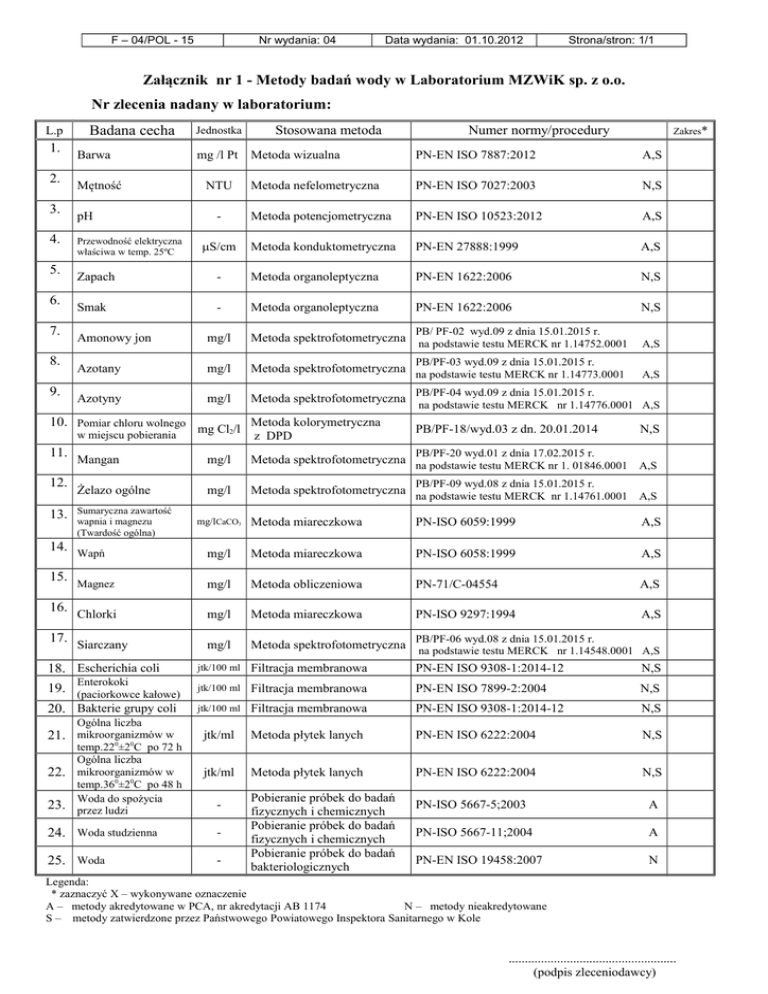 F – 04/POL - 15 Nr wydania: 04 Data wydania: 01.10.2012 Strona/stron: 1/1 Załącznik nr 1 - Metody badań wody w Laboratorium MZWiK sp. z o.o. Nr zlecenia nadany w laboratorium: L.p 1. 2. 3. 4. 5. 6. 7. 8. 9. Badana cecha Barwa Mętność pH Przewodność elektryczna właściwa w temp. 25ºC Jednostka mg /l Pt Stosowana metoda Numer normy/procedury Metoda wizualna PN-EN ISO 7887:2012 A,S Metoda nefelometryczna PN-EN ISO 7027:2003 N,S - Metoda potencjometryczna PN-EN ISO 10523:2012 A,S S/cm Metoda konduktometryczna PN-EN 27888:1999 A,S NTU Zapach - Metoda organoleptyczna PN-EN 1622:2006 N,S Smak - Metoda organoleptyczna PN-EN 1622:2006 N,S PB/ PF-02 wyd.09 z dnia 15.01.2015 r. Amonowy jon mg/l Metoda spektrofotometryczna na podstawie testu MERCK nr 1.14752.0001 Azotany mg/l Metoda spektrofotometryczna na podstawie testu MERCK nr 1.14773.0001 mg/l PB/PF-04 wyd.09 z dnia 15.01.2015 r. Metoda spektrofotometryczna na podstawie testu MERCK nr 1.14776.0001 A,S Azotyny PB/PF-18/wyd.03 z dn. 20.01.2014 11. PB/PF-20 wyd.01 z dnia 17.02.2015 r. z DPD 13. A,S PB/PF-03 wyd.09 z dnia 15.01.2015 r. 10. Pomiar chloru wolnego Metoda kolorymetryczna mg Cl2/l w miejscu pobierania 12. Zakres* A,S N,S Mangan mg/l Metoda spektrofotometryczna na podstawie testu MERCK nr 1. 01846.0001 A,S Żelazo ogólne mg/l Metoda spektrofotometryczna na podstawie testu MERCK nr 1.14761.0001 A,S Sumaryczna zawartość wapnia i magnezu (Twardość ogólna) PB/PF-09 wyd.08 z dnia 15.01.2015 r. mg/lCaCO3 Metoda miareczkowa PN-ISO 6059:1999 A,S Wapń mg/l Metoda miareczkowa PN-ISO 6058:1999 A,S Magnez mg/l Metoda obliczeniowa PN-71/C-04554 A,S Chlorki mg/l Metoda miareczkowa PN-ISO 9297:1994 A,S Siarczany mg/l 18. Escherichia coli jtk/100 ml Metoda spektrofotometryczna na podstawie testu MERCK nr 1.14548.0001 A,S Filtracja membranowa PN-EN ISO 9308-1:2014-12 N,S jtk/100 ml Filtracja membranowa PN-EN ISO 7899-2:2004 N,S jtk/100 ml Filtracja membranowa PN-EN ISO 9308-1:2014-12 N,S jtk/ml Metoda płytek lanych PN-EN ISO 6222:2004 N,S jtk/ml Metoda płytek lanych PN-EN ISO 6222:2004 N,S 14. 15. 16. 17. 19. Enterokoki (paciorkowce kałowe) 20. Bakterie grupy coli 21. 22. 23. Ogólna liczba mikroorganizmów w temp.220±20C po 72 h Ogólna liczba mikroorganizmów w temp.360±20C po 48 h Woda do spożycia przez ludzi - 24. Woda studzienna - 25. Woda - PB/PF-06 wyd.08 z dnia 15.01.2015 r. Pobieranie próbek do badań fizycznych i chemicznych Pobieranie próbek do badań fizycznych i chemicznych Pobieranie próbek do badań bakteriologicznych PN-ISO 5667-5;2003 A PN-ISO 5667-11;2004 A PN-EN ISO 19458:2007 N Legenda: * zaznaczyć X – wykonywane oznaczenie A – metody akredytowane w PCA, nr akredytacji AB 1174 N – metody nieakredytowane S – metody zatwierdzone przez Państwowego Powiatowego Inspektora Sanitarnego w Kole .................................................... (podpis zleceniodawcy)
