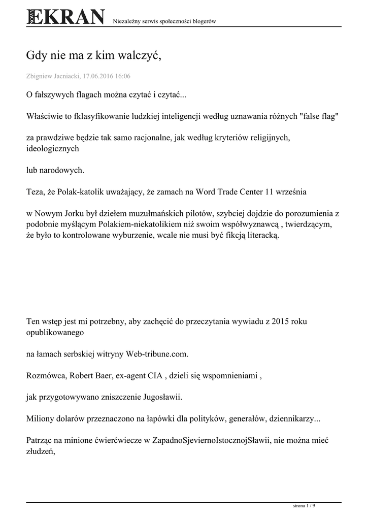 Niezależny serwis społeczności blogerów Gdy nie ma z kim walczyć, Zbigniew Jacniacki, 17.06.2016 16:06 O fałszywych flagach można czytać i czytać... Właściwie to fklasyfikowanie ludzkiej inteligencji według uznawania różnych "false flag" za prawdziwe będzie tak samo racjonalne, jak według kryteriów religijnych, ideologicznych lub narodowych. Teza, że Polak-katolik uważający, że zamach na Word Trade Center 11 września w Nowym Jorku był dziełem muzułmańskich pilotów, szybciej dojdzie do porozumienia z podobnie myślącym Polakiem-niekatolikiem niż swoim współwyznawcą , twierdzącym, że było to kontrolowane wyburzenie, wcale nie musi być fikcją literacką. Ten wstęp jest mi potrzebny, aby zachęcić do przeczytania wywiadu z 2015 roku opublikowanego na łamach serbskiej witryny Web-tribune.com. Rozmówca, Robert Baer, ex-agent CIA , dzieli się wspomnieniami , jak przygotowywano zniszczenie Jugosławii. Miliony dolarów przeznaczono na łapówki dla polityków, generałów, dziennikarzy... Patrząc na minione ćwierćwiecze w ZapadnoSjeviernoIstocznojSławii, nie można mieć złudzeń, strona 1 / 9 Niezależny serwis społeczności blogerów że nie zastosowano podobnych procedur. Cóż, ludzie czerpiący korzyści z podbojów, mają inną wizję funkcjonowania świata, niż "miejscowi". To rozróżnienie jest potrzebne, aby młodzi rodacy zastanawiający się nad uczestniczeniem w "misjach pokojowych" , zauważali, że najważniejszy w nich jest cudzysłów. A teraz danie główne -jak to się robi-Robert Baer, ex-agent CIA Tłumaczenie treborok.wordpress.com Wyznanie agenta CIA: dostaliśmy miliony na rozbicie Jugosławii „Przekupiliśmy partie i polityków, którzy szerzyli nienawiści wśród narodów. Naszym końcowym celem było ujarzmienie was!” strona 2 / 9 Niezależny serwis społeczności blogerów WebTribune publikuje wywiad byłego agenta CIA Roberta Baera w czasie podróży w poprzednim tygodniu do Quebec promującej jego książkę „Tajemnice Białego Domu”. Mój szef, który był wcześniej amerykańskim senatorem, często podkreślał, że w Bośni będzie miała miejsce jakaś machinacja. Na miesiąc przed rzekomym ludobójstwem w Srebrenicy, powiedział mi, że miasto znajdzie się na czołówkach światowych wiadomości, i kazał nam zebrać media. Robert Baer były oficer CIA napisał mnóstwo książek, które uchylają tajemnice Centralnej Agencji Wywiadowczej i administracji Billa Clintona oraz George’a W. Busha. Był kilka razy aresztowany i zatrzymywany. Jego przyjaciel Mit Jasper pracujący w Senacie i dzielący się z nim informacjami został zabity. Jako wysoko postawiony agent CIA, Baer pracował w Jugosławii w latach 1991-94 i na Bliskim Wschodzie. strona 3 / 9 Niezależny serwis społeczności blogerów Brał udział w tworzeniu kilku filmów dokumentalnych dla „National Geographic” oskarżając administrację Busha o prowadzenie wojny o ropę naftową. Wywiad został przeprowadzony na żywo w Kanadzie podczas mojej podróży kilka dni temu. Robert Baer reklamuje swoją książkę „Tajemnice Białego Domu” w Quebec, gdzie rozmawialiśmy. W wywiadzie mówi on o tle wojny w Jugosławii. Gdzie i kiedy miała miejsce pana pierwsza praca w Jugosławii? Przyleciałem helikopterem z trzema agentami. Wylądowaliśmy 12 stycznia 1991 roku w Sarajewie. Naszym zadaniem było monitorowanie domniemanych terrorystów narodowości serbskiej, którzy zgodnie z oczekiwaniami mieli atakować Sarajewo. Kim byli ci terroryści i dlaczego mieli wykonywać te ataki? Dostaliśmy dokumenty dotyczące grupy zwanej „Wielka Serbia” ze szczegółami planów przeprowadzenia ataków bombowych na ważne budynki w Sarajewie w celu zapobieżenia wyjścia przez Bośnię ze składu byłej Jugosławii. strona 4 / 9 Niezależny serwis społeczności blogerów Czy istniała w ogóle taka grupa i co robiliście w Sarajewie pod nadzorem CIA? Taka grupa nigdy nie istniała! Nasi szefowie nas okłamali. Naszym zadaniem było podniesienie alarmu i szerzenie paniki wśród polityków w Bośni, po prostu zasugerować im, że Serbowie mają zamiar zaatakować. Na początku przyjęliśmy tę historię jako prawdziwą, ale po pewnym czasie zaczęliśmy zadawać pytania. Po co podsycać taką histerię skoro grupa nie istnieje? Jak i kiedy zakończyła się ta operacja i czy miała jakąś nazwę? Dla mnie skończyła się dwa tygodnie później, gdy otrzymałem nowe zadanie w Słowenii. Operacja trwała miesiąc i miała nazwę „Istina” (tzn. „prawda”), chociaż wszystko było kłamstwem! W jakim celu udał się pan do Słowenii? Otrzymałem instrukcje, że Słowenia gotowa jest ogłosić niepodległość. Dostaliśmy pieniądze, kilka milionów dolarów na sfinansowanie różnych organizacji pozarządowych, partii opozycyjnych i różnych polityków, którzy podżegali do nienawiści. Czy miał pan wiedzę o propagandzie CIA i co o tym myśleli pańscy koledzy? Oczywiście, nikt nie odmawiał wykonania zadań dla CIA, szczególnie kiedy wszyscy denerwowaliśmy się i mieliśmy skłonności do paranoi! Wielu naszych agentów oraz starsi oficerowie po prostu znikali ponieważ nie chcieli uprawiać propagandy przeciwko Serbom w strona 5 / 9 Niezależny serwis społeczności blogerów Jugosławii. Sam byłem zaszokowany ilością kłamstw podawanych dla naszych agencji i polityków! Wielu agentów CIA kierowało propagandą nie zdając sobie sprawy z tego co robią. Wszyscy znali tylko część historii, tylko ci którzy tworzy całą historię znali prawdę – to politycy. To znaczy, że propaganda była tylko przeciwko Serbom? Tak i nie. Celem propagandy było oddzielenie republiki od ojczystej Jugosławii. Musieliśmy wybrać kozła ofiarnego, na którego można by było wszystko zrzucić. Ktoś, kto będzie odpowiedzialny za wojnę i przemoc. Wybrano Serbię ponieważ była ona następczynią Jugosławii. Czy może pan wymienić politykó