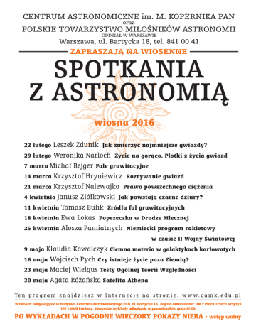 wiosna 2016 22 lutego Leszek Zdunik Jak zmierzyć najmniejsze gwiazdy? 29 lutego Weronika Narloch Życie na gorąco. Plotki z życia gwiazd 7 marca Michał Bejger Fale grawitacyjne 14 marca Krzysztof Hryniewicz Rozrywanie gwiazd 21 marca Krzysztof Nalewajko Prawo powszechnego ciążenia 4 kwietnia Janusz Ziółkowski Jak powstają czarne dziury? 11 kwietnia Tomasz Bulik Źródła fal grawitacyjnych 18 kwietnia Ewa Łokas Poprzeczka w Drodze Mlecznej 25 kwietnia Alosza Pamiatnych Niemiecki program rakietowy w czasie II Wojny Światowej 9 maja Klaudia Kowalczyk Ciemna materia w galaktykach karłowatych 16 maja Wojciech Pych Czy istnieje życie poza Ziemią? 23 maja Maciej Wielgus Testy Ogólnej Teorii Względności 30 maja Agata Różańska Satelita Athena