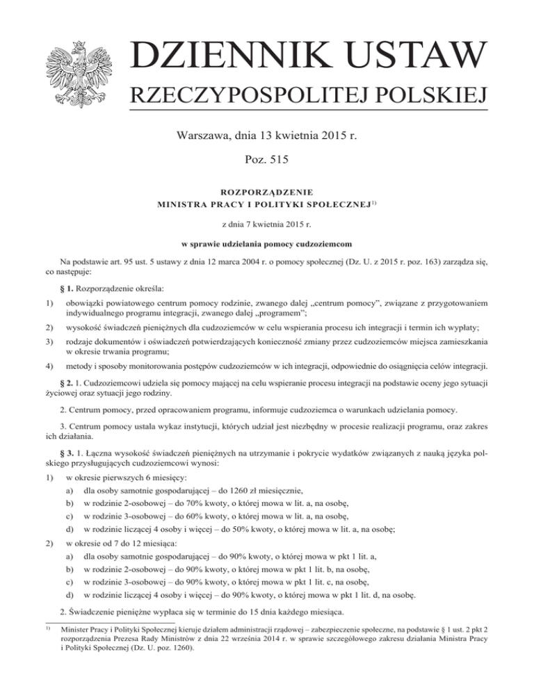 DZIENNIK USTAW RZECZYPOSPOLITEJ POLSKIEJ Warszawa, dnia 13 kwietnia 2015 r. Poz. 515 ROZPORZĄDZENIE MINISTRA PRACY I POLITYKI SPOŁECZNEJ 1) z dnia 7 kwietnia 2015 r. w sprawie udzielania pomocy cudzoziemcom Na podstawie art. 95 ust. 5 ustawy z dnia 12 marca 2004 r. o pomocy społecznej (Dz. U. z 2015 r. poz. 163) zarządza się, co następuje: § 1. Rozporządzenie określa: 1) obowiązki powiatowego centrum pomocy rodzinie, zwanego dalej „centrum pomocy”, związane z przygotowaniem indywidualnego programu integracji, zwanego dalej „programem”; 2) wysokość świadczeń pieniężnych dla cudzoziemców w celu wspierania procesu ich integracji i termin ich wypłaty; 3) rodzaje dokumentów i oświadczeń potwierdzających konieczność zmiany przez cudzoziemców miejsca zamieszkania w okresie trwania programu; 4) metody i sposoby monitorowania postępów cudzoziemców w ich integracji, odpowiednie do osiągnięcia celów integracji. § 2. 1. Cudzoziemcowi udziela się pomocy mającej na celu wspieranie procesu integracji na podstawie oceny jego sytuacji życiowej oraz sytuacji jego rodziny. 2. Centrum pomocy, przed opracowaniem programu, informuje cudzoziemca o warunkach udzielania pomocy. 3. Centrum pomocy ustala wykaz instytucji, których udział jest niezbędny w procesie realizacji programu, oraz zakres ich działania. § 3. 1. Łączna wysokość świadczeń pieniężnych na utrzymanie i pokrycie wydatków związanych z nauką języka polskiego przysługujących cudzoziemcowi wynosi: 1) w okresie pierwszych 6 miesięcy: a) dla osoby samotnie gospodarującej – do 1260 zł miesięcznie, b) w rodzinie 2-osobowej – do 70% kwoty, o której mowa w lit. a, na osobę, c) w rodzinie 3-osobowej – do 60% kwoty, o której mowa w lit. a, na osobę, d) w rodzinie liczącej 4 osoby i więcej – do 50% kwoty, o której mowa w lit. a, na osobę; 2) w okresie od 7 do 12 miesiąca: a) dla osoby samotnie gospodarującej – do 90% kwoty, o której mowa w pkt 1 lit. a, b) w rodzinie 2-osobowej – do 90% kwoty, o której mowa w pkt 1 lit. b, na osobę, c) w rodzinie 3-osobowej – do 90% kwoty, o której mowa w pkt 1 lit. c, na osobę, d) w rodzinie liczącej 4 osoby i więcej – do 90% kwoty, o której mowa w pkt 1 lit. d, na osobę. 2. Świadczenie pieniężne wypłaca się w terminie do 15 dnia każdego miesiąca. 1) Minister Pracy i Polityki Społecznej kieruje działem administracji rządowej – zabezpieczenie społeczne, na podstawie § 1 ust. 2 pkt 2 rozporządzenia Prezesa Rady Ministrów z dnia 22 września 2014 r. w sprawie szczegółowego zakresu działania Ministra Pracy i Polityki Społecznej (Dz. U. poz. 1260). Dziennik Ustaw –2– Poz. 515 § 4. 1. W przypadkach, o których mowa w art. 94 ust. 4 pkt 1 i 2 ustawy z dnia 12 marca 2004 r. o pomocy społecznej, zwanej dalej „ustawą”, cudzoziemiec składa w centrum pomocy realizującym program oświadczenie potwierdzające te okoliczności oraz przedkłada dokumenty potwierdzające zaistniałą sytuację, którymi mogą być w szczególności umowa o pracę albo dokument potwierdzający uzyskanie tytułu prawnego do lokalu. 2. W przypadku, o którym mowa w art. 94 ust. 4 pkt 3 ustawy, cudzoziemiec i pełnoletni członkowie jego rodziny składają w centrum pomocy realizującym program oświadczenie o gotowości wspólnego zamieszkania. 3. W przypadku, o którym mowa w art. 94 ust. 4 pkt 4 ustawy, cudzoziemiec składa w centrum pomocy realizującym program zaświadczenie lekarza udzielającego świadczeń specjalistycznych o konieczności leczenia wymagającego zmiany miejsca zamieszkania. § 5. 1. Postępy cudzoziemca w procesie integracji w ramach realizowanego przez niego programu są monitorowane przez pracownika socjalnego centrum pomocy, zwanego dalej „realizatorem programu”, co najmniej raz na 3 miesiące, licząc od dnia rozpoczęcia realizacji programu. 2. Postępy w integracji ocenia się w zakresie stopnia i efektywności procesu integracji w szczególności w następujących obszarach, stosownie do celów integracji określonych w programie: 1) edukacji językowej, w tym w zakresie stopnia przyswojenia podstawowego zasobu słownictwa języka polskiego umożliwiającego komunikowanie się; 2) funkcjonowania zawodowego, w zakresie postępów w poszukiwaniu zatrudnienia i innych form aktywności zawodowej umożliwiającej ekonomiczne usamodzielnienie się cudzoziemca; 3) funkcjonowania społecznego, zwłaszcza w zakresie nawiązania kontaktów ze środowiskiem lokalnym oraz stopnia udziału w życiu społecznym, kulturalnym i publicznym. 3. W celu ustalenia postępów cudzoziemca w procesie integracji realizator programu stosuje metody obserwacji, rozmowy bezpośredniej z cudzoziemcem oraz członkami jego rodziny. 4. Realizator programu może również zasięgać opinii innych instytucji i organizacji uczestniczących w procesie integracji. 5. Oceny postępów w procesie integracji są dokonywane w formie notatek służbowych. 6. W przypadku stwierdzenia braków lub niewystarczających postępów w którymkolwiek z obszarów integracji, o których mowa w ust. 2, strony modyfikują program tak, aby dostosować go do specyficznych potrzeb cudzoziemca i usunąć problemy występujące w realizacji programu. § 6. Rozporządzenie wchodzi w życie z dniem następującym po dniu ogłoszenia.2) Minister Pracy i Polityki Społecznej: W. Kosiniak-Kamysz 2) Niniejsze rozporządzenie było poprzedzone rozporządzeniem Ministra Pracy i Polityki Społecznej z dnia 9 marca 2009 r. w sprawie udzielania pomocy cudzoziemcom, którzy uzyskali w Rzeczypospolitej Polskiej status uchodźcy lub ochronę uzupełniającą (Dz. U. Nr 45, poz. 366 oraz z 2013 r. poz. 1056), które na podstawie art. 16 ust. 1 ustawy z dnia 26 czerwca 2014 r. o zmianie ustawy o udzielaniu cudzoziemcom ochrony na terytorium Rzeczypospolitej Polskiej oraz niektórych innych ustaw (Dz. U. poz. 1004) utraciło moc z dniem 1 marca 2015 r.