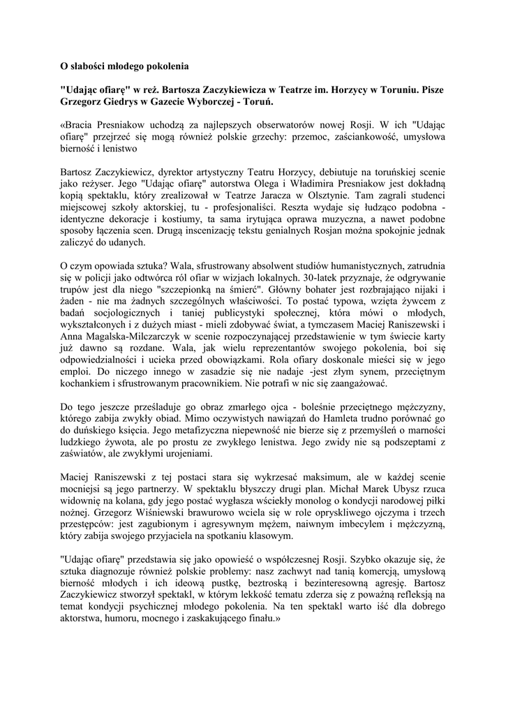 O słabości młodego pokolenia "Udając ofiarę" w reż. Bartosza Zaczykiewicza w Teatrze im. Horzycy w Toruniu. Pisze Grzegorz Giedrys w Gazecie Wyborczej - Toruń. «Bracia Presniakow uchodzą za najlepszych obserwatorów nowej Rosji. W ich "Udając ofiarę" przejrzeć się mogą również polskie grzechy: przemoc, zaściankowość, umysłowa bierność i lenistwo Bartosz Zaczykiewicz, dyrektor artystyczny Teatru Horzycy, debiutuje na toruńskiej scenie jako reżyser. Jego "Udając ofiarę" autorstwa Olega i Władimira Presniakow jest dokładną kopią spektaklu, który zrealizował w Teatrze Jaracza w Olsztynie. Tam zagrali studenci miejscowej szkoły aktorskiej, tu - profesjonaliści. Reszta wydaje się łudząco podobna identyczne dekoracje i kostiumy, ta sama irytująca oprawa muzyczna, a nawet podobne sposoby łączenia scen. Drugą inscenizację tekstu genialnych Rosjan można spokojnie jednak zaliczyć do udanych. O czym opowiada sztuka? Wala, sfrustrowany absolwent studiów humanistycznych, zatrudnia się w policji jako odtwórca ról ofiar w wizjach lokalnych. 30-latek przyznaje, że odgrywanie trupów jest dla niego "szczepionką na śmierć". Główny bohater jest rozbrajająco nijaki i żaden - nie ma żadnych szczególnych właściwości. To postać typowa, wzięta żywcem z badań socjologicznych i taniej publicystyki społecznej, która mówi o młodych, wykształconych i z dużych miast - mieli zdobywać świat, a tymczasem Maciej Raniszewski i Anna Magalska-Milczarczyk w scenie rozpoczynającej przedstawienie w tym świecie karty już dawno są rozdane. Wala, jak wielu reprezentantów swojego pokolenia, boi się odpowiedzialności i ucieka przed obowiązkami. Rola ofiary doskonale mieści się w jego emploi. Do niczego innego w zasadzie się nie nadaje -jest złym synem, przeciętnym kochankiem i sfrustrowanym pracownikiem. Nie potrafi w nic się zaangażować. Do tego jeszcze prześladuje go obraz zmarłego ojca - boleśnie przeciętnego mężczyzny, którego zabija zwykły obiad. Mimo oczywistych nawiązań do Hamleta trudno porównać go do duńskiego księcia. Jego metafizyczna niepewność nie bierze się z przemyśleń o marności ludzkiego żywota, ale po prostu ze zwykłego lenistwa. Jego zwidy nie są podszeptami z zaświatów, ale zwykłymi urojeniami. Maciej Raniszewski z tej postaci stara się wykrzesać maksimum, ale w każdej scenie mocniejsi są jego partnerzy. W spektaklu błyszczy drugi plan. Michał Marek Ubysz rzuca widownię na kolana, gdy jego postać wygłasza wściekły monolog o kondycji narodowej piłki nożnej. Grzegorz Wiśniewski brawurowo wciela się w role opryskliwego ojczyma i trzech przestępców: jest zagubionym i agresywnym mężem, naiwnym imbecylem i mężczyzną, który zabija swojego przyjaciela na spotkaniu klasowym. "Udając ofiarę" przedstawia się jako opowieść o współczesnej Rosji. Szybko okazuje się, że sztuka diagnozuje również polskie problemy: nasz zachwyt nad tanią komercją, umysłową bierność młodych i ich ideową pustkę, beztroską i bezinteresowną agresję. Bartosz Zaczykiewicz stworzył spektakl, w którym lekkość tematu zderza się z poważną refleksją na temat kondycji psychicznej młodego pokolenia. Na ten spektakl warto iść dla dobrego aktorstwa, humoru, mocnego i zaskakującego finału.» "O słabości młodego pokolenia" Grzegorz Giedrys Gazeta Wyborcza - Toruń nr 250 25-10-2013