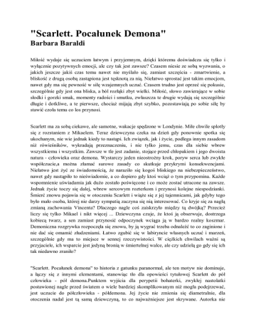 "Scarlett. Pocałunek Demona" Barbara Baraldi Miłość wydaje się uczuciem łatwym i przyjemnym, dzięki któremu doświadcza się tylko i wyłącznie pozytywnych emocji, ale czy tak jest zawsze? Czasem niesie ze sobą wyzwania, o jakich jeszcze jakiś czas temu nawet nie myślało się, zamiast szczęścia - zmartwienie, a bliskość z drugą osobą zastąpiona jest tęsknotą za nią. Niełatwo sprostać jest takim emocjom, nawet gdy ma się pewność w siłę wzajemnych uczuć. Czasem trudno jest oprzeć się pokusie, szczególnie gdy jest ona bliska, a ból rozłąki zbyt wielki. Miłość, słowo zawierające w sobie słodki i gorzki smak, momenty radości i smutku, zwłaszcza te drugie wydają się szczególnie długie i dotkliwe, a te pierwsze, chociaż mijają zbyt szybko, pozostawiają po sobie siłę by stawić czoła temu co los przynosi. Scarlett ma za sobą ciekawe, ale samotne, wakacje spędzone w Londynie. Miłe chwile splotły się z rozstaniem z Mikaelem. Teraz dziewczyna czeka na dzień gdy ponownie spotka się ukochanym, nie wie jednak kiedy to nastąpi. Ich związek, jak i życie, podlega innym zasadom niż rówieśników, wykradają przeznaczeniu, i nie tylko jemu, czas dla siebie wbrew wszystkiemu i wszystkim. Zawsze w tle jest zadanie, stojące przed chłopakiem i jego dwoista natura - człowieka oraz demona. Wystarczy jeden nieostrożny krok, poryw serca lub zwykłe współczucie,a można złamać surowe zasady co skutkuje przykrymi konsekwencjami. Niełatwo jest żyć ze świadomością, że naraziło się kogoś bliskiego na niebezpieczeństwo, nawet gdy nastąpiło to nieświadomie, a co dopiero gdy ktoś wciąż o tym przypomina. Każde wspomnienie uświadamia jak dużo zostało poświęcone i co może zostać utracone na zawsze. Jednak życie toczy się dalej, wbrew sercowym rozterkom i przynosi kolejne niespodzianki. Śmierć znowu pojawia się w otoczeniu Scarlett i wiąże się z jej tajemnicami, jak gdyby tego było mało osoba, której nie darzy sympatią zaczyna się nią interesować. Co kryje się za nagłą zmianą zachowania Vincenta? Dlaczego nagle coś zaiskrzyło między tą dwójką? Przecież liczy się tylko Mikael i nikt więcej ... Dziewczyna czuje, że ktoś ją obserwuje, dostrzega kobiecą twarz, a sen zamiast przynosić odpoczynek wciąga ją w bardzo realny koszmar. Demoniczna rozgrywka rozpoczęła się znowu, by ją wygrać trzeba odnaleźć to co zaginione i nie dać się omamić złudzeniami. Łatwo zgubić się w labiryncie własnych uczuć i marzeń, szczególnie gdy ma to miejsce w sennej rzeczywistości. W ciężkich chwilach ważni są przyjaciele, ich wsparcie jest jedyną bronią w śmiertelnej walce, ale czy udzielą go gdy się ich tak niedawno zraniło? "Scarlett. Pocałunek demona" to historia z gatunku paranormal, ale ten motyw nie dominuje, a łączy się z innymi elementami, stanowiąc tło dla opowieści tytułowej Scarlett do pół człowieka - pół demona.Punktem wyjścia dla perypetii bohaterki, zwykłej nastolatki postawionej nagle przed światem o wiele bardziej skomplikowanym niż mogła podejrzewać, jest uczucie do półczłowieka - półdemona. Jej życie nie zmienia się diametralnie, dla otoczenia nadal jest tą samą dziewczyną, to co najważniejsze jest skrywane. Autorka nie napisała książki jedynie dla młodzieży, ale również dla starszych czytelników, bo to co przedstawia ma uniwersalne przesłanie. Uczucie, o które trzeba walczyć, sekrety przed bliskimi oraz przyjaźń i jej znaczenie są głównymi wątkami, dotyczącymi nie tylko głównych postaci. Na uwagę zasługuje również niezwykle plastyczny język Barbary Baraldi, dzięki niemu czytający mają przed oczyma krajobrazy okolic Sieny i stanowiący piękną oprawę dla opowiadania. Z jednej strony demoniczny świat, z drugiej zwyczajna codzienność, jedne i drugie niepozbawione dobrych i złych chwil, a pomiędzy nimi Scarlett i Mikael. Na pierwszy rzut oka dwójka normalnych nastolatków, ich znajomość ma dwa oblicza, różnią się od siebie jak dzień i noc, ale miłość i przyjaźń łączą je ze sobą w całość.