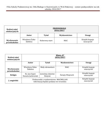 Filia Szkoły Podstawowej im. Orła Białego w Kurowicach z/s Woli Rakowej – zestaw podręczników na rok szkolny 2016/2017 PRZEDSZKOLE 2016/2017 Rodzaj zajęć edukacyjnych Wychowanie przedszkolne Autor Tytuł Wydawnictwo Uwagi Wiesława ŻabaŻabińsa Kolorowy start MAC Książki kupuje nauczyciel Klasa „O” 2016/2017 Rodzaj zajęć edukacyjnych Wychowanie przedszkolne Religia J. angielski Autor Tytuł Wydawnictwo Uwagi Wiesława ŻabaŻabińsa Mały elementarz MAC Książki kupuje nauczyciel Ks. Jan Szpet Danuta Jackowiak Jesteśmy dziećmi Bożymi Święty Wojciech Podręczniki z wydawnictwa MACMILLAN Informacja będzie podana we wrześniu Książki kupuje nauczyciel Książki kupuje nauczyciel Filia Szkoły Podstawowej im. Orła Białego w Kurowicach z/s Woli Rakowej – zestaw podręczników na rok szkolny 2016/2017 Rodzaj zajęć edukacyjnych Klasa I 2016/2017 Autor Religia Tytuł Podręcznik i Jesteśmy w ćwiczenia kupują (red.) J. Szpet, D. rodzinie Pana Wydawnictwo Święty rodzice (można Jackowiak Jezusa Wojciech, Poznań odkupić podręcznik od uczniów z klasy starszej). Pozostałe podręczniki są bezpłatne, wypożyczone z biblioteki szkolnej. Ćwiczenia uczniowie otrzymują bezpłatnie na początku roku szkolnego. Rodzaj zajęć edukacyjnych Klasa II 2016/2017 Autor Religia Wydawnictwo (red.) J. Szpet, D. Jackowiak Tytuł Kochamy Pana Jezusa Wydawnictwo Wydawnictwo Święty Wojciech, Poznań Podręcznik i ćwiczenia kupują rodzice (można odkupić podręcznik od uczniów z klasy starszej). Pozostałe podręczniki są bezpłatne, wypożyczone z biblioteki szkolnej. Ćwiczenia uczniowie otrzymują bezpłatnie na początku roku szkolnego. Rodzaj zajęć edukacyjnych Religia Klasa III 2016/2017 Autor Tytuł Wydawnictwo (red.) J. Szpet, D. Jackowiak Przyjmujemy Pana Jezusa Wydawnictwo Święty Wojciech, Poznań Podręcznik i ćwiczenia kupują rodzice (można odkupić podręcznik od uczniów z klasy starszej). Pozostałe podręczniki są bezpłatne, wypożyczone z biblioteki szkolnej. Ćwiczenia uczniowie otrzymują bezpłatnie na początku roku szkolnego.