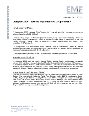 Warszawa, 01.12.2006 r. Listopad 2006 – istotne wydarzenia w Grupie EM&F Nowe sklepy w Polsce W listopadzie 2006 r. Grupa EM&F otworzyła 7 nowych sklepów / punktów usługowych o łącznej powierzchni 3 005 m2: - 4 nowe salony Empik - w Puławach (Galeria Zielona), sklep o powierzchni 405m2; w Tarnowie (CH Zenit), sklep o powierzchni 419m2; w Płocku (Auchan), sklep o powierzchni 405m2; w Legnicy (Galeria Piastów), sklep o powierzchni 416m2, powiększając tym samym sieć sprzedaży do 87 placówek; - 2 sklepy Smyk - w Rzeszowie (Galeria Graffica), sklep o powierzchni 730m2; w Legnicy (Galeria Piastów), sklep o powierzchni 630m2; powiększając tym samym sieć sprzedaży do 38 placówek (włączając sklep marki Smyk w Berlinie); - 1 szkołę języka angielskiego Speak Up w Olsztynie, powiększając sieć do 12 placówek. Inwestycja na Ukrainie 22 listopada 2006 podmiot zależny Grupy EM&F, spółka Empik, sfinalizowała transakcję nabycia 65% udziałów w cypryjskiej spółce Magalla Holdings Limited właściciela 100% udziałów w ukraińskiej spółce “Closed Joint Stock Company - Network of bookstores BUKVA", która prowadzi na Ukrainie sieć 27 księgarni Bukva. Grupa zamiarza przeprowadzić modernizacje przejętych sklepów i dalszą rozbudową konceptu handlowego Empik na rynku ukraińskim. Mapic Award 2006 dla sieci SMYK Podczas tegorocznych Międzynarodowych Targów Nieruchomości Handlowych Mapic 2006 w Cannes (the International Market for Retail Real Estate), spółka SMYK, należąca do Grupy EM&F, otrzymała prestiżową nagrodę Mapic Award 2006 w kategorii „Leisure”, wyprzedzając takie marki jak: Game Spain (Hiszpania), Game France (Francja), Go Sport (Zjednoczone Emiraty Arabskie i Polska). Międzynarodowe jury doceniło nie tylko unikalną koncepcję sieci, ale także ambitne plany rozwoju poza granicami Polski, których zwiastunem jest pierwszy sklep Smyk w Berlinie otwarty w marcu bieżącego roku.