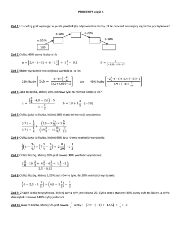 PROCENTY część 1 Zad 1 Uzupełnij graf wpisując w puste prostokąty odpowiednie liczby. O ile procent zmniejszy się liczba początkowa? o 20% o 10% o 10% o 20 % 100 Zad 2 Oblicz 40% sumy liczby a i b ( * ) + ( )( ) ( ) Zad 3 Które wyrażenie ma większa wartośd o i o ile; ( 25% liczby [ ( ) )( ] ) 45% liczby [ czy ( ( ) ) ] Zad 4 Jaka to liczba, której 10% stanowi tyle co różnica liczby a i b? ( ) ( ) Zad 5 Oblicz jaka to liczba, której 18% stanowi wartośd wyrażenia: ( ) ( ) Zad 6 Oblicz jaka to liczba, której 60% jest równe wartości wyrażenia: [( ) ( ) ] Zad 7 Oblicz liczbę, której 20% jest równe 30% wartości wyrażenia: Zad 8 Oblicz liczbę, której 1,25% jest równe tyle, ile 20% wartości wyrażenia: ( ) ( ) Zad 9 Znajdź liczbę trzycyfrową, której suma cyfr jest równa 20. Cyfra setek stanowi 40% sumy cyfr tej liczby, a cyfra dziesiątek stanowi 140% cyfry jedności . Zad 10 Jaka to liczba, której 5% jest równe liczby : [ ( ) ]