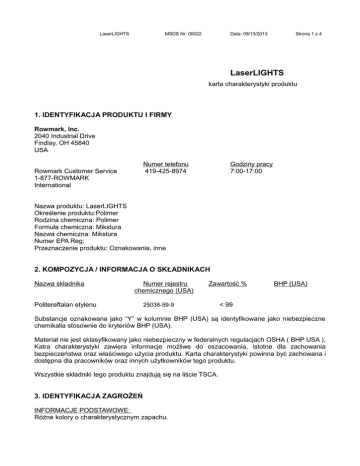 LaserLIGHTS MSDS Nr: 00022 Data: 09/13/2013 Strona 1 z 4 LaserLIGHTS karta charakterystyki produktu 1. IDENTYFIKACJA PRODUKTU I FIRMY Rowmark, Inc. 2040 Industrial Drive Findlay, OH 45840 USA Numer telefonu 419-425-8974 Rowmark Customer Service 1-877-ROWMARK International Godziny pracy 7:00-17:00 Nazwa produktu: LaserLIGHTS Określenie produktu:Polimer Rodzina chemiczna: Polimer Formuła chemiczna: Mikstura Nazwa chemiczna: Mikstura Numer EPA Reg: Przeznaczenie produktu: Oznakowania, inne 2. KOMPOZYCJA / INFORMACJA O SKŁADNIKACH Nazwa składnika Numer rejestru chemicznego (USA) Politereftalan etylenu Zawartość % 25038-59-9 BHP (USA) < 99 Substancje oznakowana jako “Y” w kolumnie BHP (USA) są identyfikowane jako niebezpieczne chemikalia stosownie do kryteriów BHP (USA). Materiał nie jest sklasyfikowany jako niebezpieczny w federalnych regulacjach OSHA ( BHP USA ), Katra charakterystyki zawiera informacje możliwe do oszacowania, istotne dla zachowania bezpieczeństwa oraz właściwego użycia produktu. Karta charakterystyki powinna być zachowana i dostępna dla pracowników oraz innych użytkowników tego produktu. Wszystkie składniki tego produktu znajdują się na liście TSCA. 3. IDENTYFIKACJA ZAGROŻEŃ INFORMACJE PODSTAWOWE: Różne kolory o charakterystycznym zapachu. LaserLIGHTS MSDS Nr: 00022 Data: 09/13/2013 Strona 2 z 4 POTENCJALNE NIEBEZPIECZEŃSTWA DLA ZDROWIA: OCZY: Opiłki lub pył mogą powodować rozdrażnienie lub uszkodzenie. SKÓRA: Zasadniczo nie oddziałuje na skórę. Może jedynie powodować uszkodzenia mechaniczne. W normalnych warunkach obróbki materiał jest ogrzewany, kontakt z materiałem może powodować oparzenia. Nie powoduje niepożądanych efektów poprzez kontakt ze skórą. SPOŻYCIE: Bardzo niska toksyczność przy połknięciu. Połknięcie małej ilości nie powoduje szkodliwych efektów. INHALACJA: Pył może spowodować podrażnienie górnego obszaru układu oddechowego (nos i gardło). 4. PIERWSZA POMOC JEŻELI DOSTANIE SIĘ DO OCZU, natychmiast przemyć dużą ilością wody. Jeżeli podrażnienie nie ustąpi, należy zgłosić się do lekarza. W WYPADKU KONTAKTU, przemyć miejscowo dużą ilością wody. Zdjąć zanieczyszczone ubranie i buty. Uprać ubranie przed ponownym użyciem. Jeżeli podrażnienie nie ustąpi, należy zgłosić się do lekarza. W WYPADKU WDYCHANIA, wyjść na świeże powietrze. Jeżeli nie oddycha, zrobić sztuczne oddychanie. Jeżeli oddychanie jest utrudnione, podać tlen. 5. WŁAŚCIWOŚCI PALNE I WYBUCHOWE WŁAŚCIWOŚCI PALNE I WYBUCHOWE: Temperatura samozapłonu nie dotyczy Temperatura zapłonu nie dotyczy Limit palny Dolny – nie dotyczy Górny – nie dotyczy ŚRODKI GAŚNICZE: Należy użyć mgły wodnej, dwutlenku węgla, piany lub suchych chemikaliów. INSTRUKCJE PRZECIWPOŻAROWE: Strażacy lub inne osoby biorące udział w akcji gaśniczej powinni być ubrani w kompletny kombinezon strażacki oraz aparaturę tlenową. Wyposażenie strażackie powinno być odkażone po użyciu. NIEBEZPIECZEŃSTWO OGNIA I WYBUCHU: Podgrzany materiał może wytwarzać palne opary. 6. POSTĘPOWANIE W PRZYPADKU UWOLNIENIA AWARYJNEGO OCHRONA OSÓB: Wióry lub pył mogą stanowić ryzyko poślizgnięcia. CZYSZCZENIE: Zebrać wióry lub pył w pojemniku na odpady. Spłukać wodą. LaserLIGHTS MSDS Nr: 00022 Data: 09/13/2013 Strona 3 z 4 7. PRZECHOWYWANIE I MAGAZYNOWANIE OBSŁUGA: Utrzymanie porządku i kontrola pyłów są niezbędne do bezpiecznego użytkowania produktu. Pracownicy powinni być chronieni przed możliwością kontaktu ze stopioną żywicą podczas produkcji. Duża ilość stopionego polimeru przechowywana przez dłuższy czas w podwyższonej temperaturze może doprowadzić do samozapłonu. MAGAZYNOWANIE: Magazynować w pozycji poziomej w suchym miejscu. 8. OCHRONA PRACOWNIKA PODSTAWOWE ZASADY OCHRONY: Odpowiednia wentylacja pomieszczenia jest niezbędna podczas procesu produkcji aby ograniczyć pylenie i parowanie. NIEZBĘDNE WYPOSAŻENIE OCHRONNE: OCHRONA OCZU / TWARZY: Należy używać okularów ochronnych lub maski ochronnej. Jeżeli występuje narażenie na kontakt z pyłem, należy używać okularów przeciw chemicznych. OCHRONA SKÓRY: Nie są wymagane żadne specjalne środki ostrożności. Według potrzeb termicznych należy używać rękawic. OCHRONA DRÓG ODDECHOWYCH: W atmosferze pyłu należy używać masek ochronnych. 9. WŁAŚCIWOŚCI FIZYCZNE I CHEMICZNE WYGLĄD / ZAPACH: TEMPERATURA WRZENIA: CIŚNIENIE PARY: GĘSTOŚĆ PARY: WŁASNA SIŁA CIĘŻKOŚCI: Różne kolory, charakterystyczny zapach nie dotyczy nie dotyczy nie dotyczy nie dotyczy 10. STABILNOŚĆ I REAKTYWNOŚĆ STABILNOŚĆ CHEMICZNA: Stabilny NALEŻY UNIKAĆ: CO, CO2, kwasy organiczne, aldehydy i alkohole - mogą mieć wpływ na degradację produktu 11. INFORMACJE TOKSYKOLOGICZNE Brak 12. INFORMACJE EKOLOGICZNE W otaczającym środowisku, materiał rozpada się i jest konsystencji gruntu, a w środowisku wodnym tonie i wyglądem przypomina osad. Nierozpuszczalny w wodzie polimer jest bezwonny i obojętny dla środowiska. Foto degradacja LaserLIGHTS MSDS Nr: 00022 Data: 09/13/2013 Strona 4 z 4 astępuje przy wystawieniu materiału na działanie promieni słonecznych. Ciągła, niezauważalna biodegradacja. Ogólnie nietoksyczny. Opiłki materiału, jeżeli dostaną się do pokarmu, mogą mieć niekorzystny ( mechaniczny ) wpływ na ptactwo i zwierzęta wodne. 13. WARUNKI LIKWIDACJI Likwidacja musi być zgodna z odpowiednimi rozporządzeniami państwowymi. 14. INFORMACJE TRANSPORTOWE Brak danych 15. INFORMACJA O REGULACJACH PRAWNYCH (Wyselekcjonowane regulacje) UWAGA: Poniższe informacje przedstawione zostały w dobrej wierze. Nie są one jednak gwarancją ani sugestią. Regulacje mogą różnić się w poszczególnych stanach, a obowiązkiem użytkownika jest dostosowanie do przepisów w miejscu zastosowania materiałów. Celem poniższych informacji jest przedstawienie regulacji odpowiednich dla licznych stanów federalnych, 