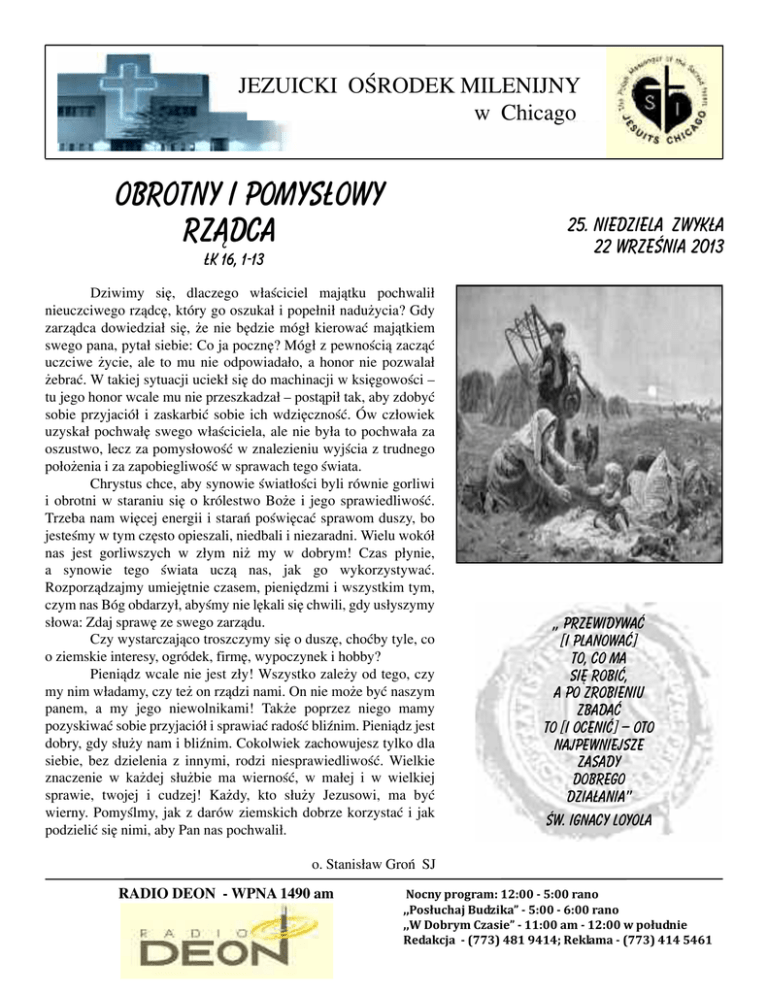 JEZUICKI OŚRODEK MILENIJNY w Chicago obrotny i pomysłowy rządca 25. NIEDZIELA ZWYKŁA 22 września 2013 Łk 16, 1-13 Dziwimy się, dlaczego właściciel majątku pochwalił nieuczciwego rządcę, który go oszukał i popełnił nadużycia? Gdy zarządca dowiedział się, że nie będzie mógł kierować majątkiem swego pana, pytał siebie: Co ja pocznę? Mógł z pewnością zacząć uczciwe życie, ale to mu nie odpowiadało, a honor nie pozwalał żebrać. W takiej sytuacji uciekł się do machinacji w księgowości – tu jego honor wcale mu nie przeszkadzał – postąpił tak, aby zdobyć sobie przyjaciół i zaskarbić sobie ich wdzięczność. Ów człowiek uzyskał pochwałę swego właściciela, ale nie była to pochwała za oszustwo, lecz za pomysłowość w znalezieniu wyjścia z trudnego położenia i za zapobiegliwość w sprawach tego świata. Chrystus chce, aby synowie światłości byli równie gorliwi i obrotni w staraniu się o królestwo Boże i jego sprawiedliwość. Trzeba nam więcej energii i starań poświęcać sprawom duszy, bo jesteśmy w tym często opieszali, niedbali i niezaradni. Wielu wokół nas jest gorliwszych w złym niż my w dobrym! Czas płynie, a synowie tego świata uczą nas, jak go wykorzystywać. Rozporządzajmy umiejętnie czasem, pieniędzmi i wszystkim tym, czym nas Bóg obdarzył, abyśmy nie lękali się chwili, gdy usłyszymy słowa: Zdaj sprawę ze swego zarządu. Czy wystarczająco troszczymy się o duszę, choćby tyle, co o ziemskie interesy, ogródek, firmę, wypoczynek i hobby? Pieniądz wcale nie jest zły! Wszystko zależy od tego, czy my nim władamy, czy też on rządzi nami. On nie może być naszym panem, a my jego niewolnikami! Także poprzez niego mamy pozyskiwać sobie przyjaciół i sprawiać radość bliźnim. Pieniądz jest dobry, gdy służy nam i bliźnim. Cokolwiek zachowujesz tylko dla siebie, bez dzielenia z innymi, rodzi niesprawiedliwość. Wielkie znaczenie w każdej służbie ma wierność, w małej i w wielkiej sprawie, twojej i cudzej! Każdy, kto służy Jezusowi, ma być wierny. Pomyślmy, jak z darów ziemskich dobrze korzystać i jak podzielić się nimi, aby Pan nas pochwalił. ,, Przewidywać [i planować] to, co ma się robić, a po zrobieniu zbadać to [i ocenić] – oto najpewniejsze zasady dobrego działania” św. Ignacy loyola o. Stanisław Groń SJ RADIO DEON - WPNA 1490 am Nocny program: 12:00 - 5:00 rano ,,Posłuchaj Budzika” - 5:00 - 6:00 rano ,,W Dobrym Czasie” - 11:00 am - 12:00 w południe Redakcja - (773) 481 9414; Reklama - (773) 414 5461 PORZĄDEK MSZY ŚWIĘTYCH Poniedziałek - pi¹tek: 8:00, 18:00, 19:00 (radiowa: WCEV 1450) I piątek miesiąca: 8:00, 19:00, 20:30 Środa: 19:00 - nowenna do Matki Bożej Nieustającej Pomocy Sobota: 8:00, tylko w I sobotę miesiąca o 17:00 dla chorych, 19:00 Niedziela: 8:00 (radiowa), 9:30, 11:00, 13:00, 19:00, 20:30 -=- SpowiedŸ św.: od poniedziałku do soboty - 7:30 i 18:30, w niedzielę - pó³ godziny przed ka¿d¹ Msz¹ Œwiêt¹, w1. pi¹tek miesi¹ca - od 18:30 do 21:00 Adoracja Najświętszego Sakramentu - od poniedziałku do czwartku - od 18:30 do 19:00 sobota - od 18:00 do 19:00 Sanktuarium Najświętszego Serca Pana Jezusa Jezuicki Ośrodek Milenijny 5835 W. Irving Park Rd.; Chicago, IL 60634, Tel. 773 777 7000; fax 773 427 0126 www.jezuici.org e-mail: [email protected] Audycje Radia DEON: Redakcja tel. 773 481 9414; Reklama tel. 773 414 5461 fax 773 283 2425 Biuro czynne: od poniedziałku do piątku: 8:30 - 9:00, 15:30 - 20:30 sobota: 9:30 - 20:30, niedziela: 8:30 - 14:30, 18:30 - 21:30 Biblioteka czynna: sobota: 18:00 - 19:00; niedziela: 10:30 - 14:30; 19:00 - 21:00 Kawiarenka czynna: niedz.: 10:00 - 15:00, 19:00 - 22:00 Sacred Heart Mission House 4105 N. Avers Ave., Chicago, IL 60618 Tel. 773 588 74 76; fax 773 588 65 17 Rektor Sanktuarium i Przełożony Jezuitów o. Jerzy Sermak, SJ (773-588-7476 - ext. 224) o. Józef Birecki, SJ (773-777-7000 - ext. 121) o. Jerzy Mordarski, SJ (773-588-7476 - ext. 234) o. Jerzy Karpiński, SJ (773-588-7476 - ext. 237) o. Piotr Kochanowicz, SJ (773-588-7476 - ext. 227) br. Adam Poręba, SJ (773-777-7000 - ext. 122) Wszelkie ofiary i donacje prosimy kierowaæ na adres Sanktuarium. Donacje s¹ wolne od podatku i mo¿na je odpisywaæ przy rozliczeniu z IRS. TRANSMISJE RADIOWE I INTERNETOWE od poniedziałku do piątku,transmisja Mszy Św. z godz. 19:00 Radio WCEV 1450 (www.wcev1450.com) w niedziele: godz 8-9, Radio WCEV 1450, oraz Polskie Radio Chicago 1030 WNVR (www.polskieradio.com) Codziennie przez całą dobę: Kamera internetowa z Sanktuarium (obraz i dźwięk; używać Internet Explorer): www.jezuici.org - link „Transmisje na żywo” – wpisać jako użytkownik i hasło: 5835 INTENCJE MSZY ŚWIĘTYCH Niedziela, 22 IX 2013 8:00 + Zofia Krupka w 4. rocznicę śmierci, + Józef Krupka 9:30 Zbiorowa 11:00 za zmarłych członków z rodziny Makowskich, Sawickich i Osickich 13:00 + + Józef, Stefania, Henryk, Bogusław i Małgorzata Polak 19:00 Zbiorowa 20:30 + + Zofia i Władysław Roszkowscy Poniedziałek, 23 IX - św. Ojca Pio 8:00 o błogosławieństwo i zdrowie dla Daniela Ziółkowskiego z rodziną 18:00 dziękczynna- błagalna o uzdrowienie relacji w rodzinie i uwolnienie od wszelkiego zła 19:00 Zbiorowa Wtorek, 24 IX 8:00 dziękczynno-błagalna w intencji Daniela Ziółkowskiego i Daniela Sobór z okazji urodzin 18:00 + + Marianna i Władysław Grudzień w 5. rocznicę, + Marcel Szydłowski i zmarli z rodziny 19:00 Zbiorowa Środa, 25 IX - bł. Władysława z Gielniowa 8:00 Za Dobroczyńców Jezuickiego Ośrodka Milenijnego 18:00 + Józef Kadłub w 10. rocznicę śmierci 19:00 Zbiorowa Czwartek, 26 IX 8:00 o zdrowie i Boże błogosławieństwo dla rodziny Grygo oraz potrzebne łaski z okazji urodzin 18:00 o zdrowie dla mamy Janiny 19:00 Zbiorowa Piątek, 27 IX - św. Wincentego à Paulo, patrona dzieł miłosierdzia 8:00 + Stefania Dąbrowska, + Wacław Morozewicz o zdrowie i błogosł