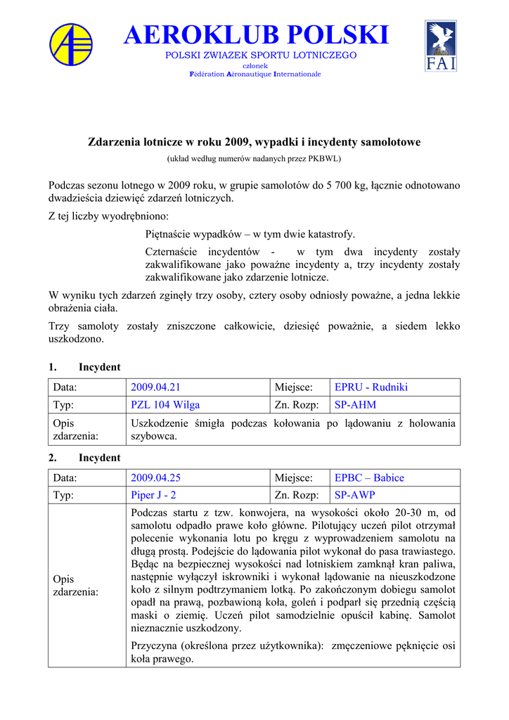 AEROKLUB POLSKI POLSKI ZWIĄZEK SPORTU LOTNICZEGO członek Fédération Aéronautique Internationale Zdarzenia lotnicze w roku 2009, wypadki i incydenty samolotowe (układ według numerów nadanych przez PKBWL) Podczas sezonu lotnego w 2009 roku, w grupie samolotów do 5 700 kg, łącznie odnotowano dwadzieścia dziewięć zdarzeń lotniczych. Z tej liczby wyodrębniono: Piętnaście wypadków – w tym dwie katastrofy. Czternaście incydentów w tym dwa incydenty zostały zakwalifikowane jako poważne incydenty a, trzy incydenty zostały zakwalifikowane jako zdarzenie lotnicze. W wyniku tych zdarzeń zginęły trzy osoby, cztery osoby odniosły poważne, a jedna lekkie obrażenia ciała. Trzy samoloty zostały zniszczone całkowicie, dziesięć poważnie, a siedem lekko uszkodzono. 1. Incydent Data: 2009.04.21 Miejsce: EPRU - Rudniki Typ: PZL 104 Wilga Zn. Rozp: SP-AHM Opis zdarzenia: Uszkodzenie śmigła podczas kołowania po lądowaniu z holowania szybowca. 2. Incydent Data: 2009.04.25 Miejsce: EPBC – Babice Typ: Piper J - 2 Zn. Rozp: SP-AWP Opis zdarzenia: Podczas startu z tzw. konwojera, na wysokości około 20-30 m, od samolotu odpadło prawe koło główne. Pilotujący uczeń pilot otrzymał polecenie wykonania lotu po kręgu z wyprowadzeniem samolotu na długą prostą. Podejście do lądowania pilot wykonał do pasa trawiastego. Będąc na bezpiecznej wysokości nad lotniskiem zamknął kran paliwa, następnie wyłączył iskrowniki i wykonał lądowanie na nieuszkodzone koło z silnym podtrzymaniem lotką. Po zakończonym dobiegu samolot opadł na prawą, pozbawioną koła, goleń i podparł się przednią częścią maski o ziemię. Uczeń pilot samodzielnie opuścił kabinę. Samolot nieznacznie uszkodzony. Przyczyna (określona przez użytkownika): zmęczeniowe pęknięcie osi koła prawego. 3. Wypadek Data: 2009.04.28 Miejsce: EPWS - Kruszyn Typ: AT - 3 Zn. Rozp: SP-CUH Opis zdarzenia: Pilot samolotu Aero AT-3 wystartował z pasa 14 EPWS do lotu patrolowego - p.pożarowego. Start przebiegał normalnie, aż do wysokości 15-20 m, którą osiągnął nad końcem pasa startowego. W tej pozycji nastąpił spadek mocy silnika i obrotów do wartości 2200 obr/min. Spadek mocy trwał, aż do samoczynnego wyłączenia silnika, które nastąpiło przed przyziemieniem. Sytuacja zmusiła pilota do przymusowego lądowania i wyboru odpowiedniego przygodnego miejsca do lądowania. W tym celu dla ominięcia zabudowań miejscowości Szymanów oraz przeszkód terenowych, pilot wykonał płytkie odchylenie w lewo (około 30o), a następnie w prawo (około 50o). Lądowanie nastąpiło pod wiatr z kursem około 160 o na klapach pełnych. Na dobiegu nastąpiło urwanie koła przedniego, a następnie złamanie przedniej goleni podwozia i uszkodzenie śmigła. 4. Poważny incydent Data: 2009.04.30 Miejsce: EPBC - Babice Typ: Cessna 152 Zn. Rozp: SP-DCM Opis zdarzenia: Podczas próby silnika, przed wkołowaniem na pas startowy instruktor nie mogła nawiązać kontaktu głosowego z uczniem-pilotem. Stan zdrowia ucznia-pilota był zły (utrata przytomności połączona z drgawkami).Za pomocą radia natychmiast powiadomiono kierownika lotów, znajdującego się w kwadracie lotniskowym, skąd wysłano osoby, które wyniosły ucznia-pilota z samolotu. Na miejsce zdarzenia wezwano Lotnicze Pogotowie Ratunkowe. Ratownik medyczny udzielił pierwszej pomocy poszkodowanemu i wezwał karetkę, która odwiozła uczniapilota do szpitala. Według oświadczenia instruktora, w czasie przygotowania naziemnego do lotu i przed rozpoczęciem czynności lotniczych w kabinie przed hangarem oraz w trakcie kołowania do startu, uczeń-pilot nie wykazywał żadnych oznak świadczących o wystąpieniu jakiejkolwiek niedyspozycji zdrowotnej. Komunikat: Komunikat Prezesa ULC nr. 76 / 2009 5. Wypadek Data: 2009.05.09 Miejsce: EPGY - Grądy Typ: PZL - 104 Wilga Zn. Rozp: SP-AHK Opis zdarzenia: Podczas kołowania do startu po DS o nawierzchni asfaltowej z tylnym wiatrem, pilot w wyniku podmuchu termicznego nie utrzymał kierunku kołowania i doszło do obrotu samolotu o 180o. Spowodowało to utratę kierunku w prawo, a następnie podparcie skrzydłem oraz lewą stroną statecznika i steru wysokości o nawierzchnię trawiastą. W wyniku wypadku skrzydło, lewa strona statecznika i steru wysokości zostały uszkodzone. Badania lekarskie wykazały trzeźwość pilota. 6. Wypadek Data: 2009.05.19 Miejsce: EPLS - Leszno Typ: PZL - 104 Wilga Zn. Rozp: SP-EAO Opis zdarzenia: Pilot samolotu PZL-104 "Wilga" w końcowej fazie dobiegu doprowadził do obrotu samolotu o około 180o. Samolot podparł się skrzydłem i statecznikiem poziomym. Pilot nie odniósł żadnych obrażeń. 7. Incydent Data: 2009.06.10 Miejsce: EPZR - Żar Typ: Jak 12 Zn. Rozp: SP-AAC Opis zdarzenia: Podczas lotu zespołu samolot - szybowiec, na wysokości około 230m nastąpiła utrata mocy połączona z drganiami silnika samolotu holującego. Pilot samolotu podał komendę do wyczepienia szybowca, wykonał manewr do lądowania i bezpiecznie wylądował na lotnisku. Kołowanie pod hangar wykonał na zmniejszonych obrotach, następnie wyłączył silnik i zgłosił zdarzenie mechanikowi. Po wyłączeniu silnika śmigło natychmiast zatrzymało się i zostało zablokowane bez możliwości obrócenia. 8. Incydent Data: 2009.06.19 Miejsce: TMA EPRZ Rzeszów Typ: Piper PA - 28 12 Zn. Rozp: SP-ASP Opis zdarzenia: Naruszenie przestrzeni kontrolowanej TMA EPRZ przez wlot samolotu bez zezwolenia ATC. 9. Incydent Data: 2009.06.20 Miejsce: EPLL Lublinek Zn. Rozp: SP-DNG Typ: AN - 2 Opis zdarzenia: Podczas lotu na wysokości około 3000m ze skoczkami na pokładzie i oczekiwaniu na wyrzut skoczków nastąpiło zerwanie mocowania liny desantowej. Prawdopodobną przyczyną uszkodzenia było nadmierne obciążenie liny. 10. Wypadek – katastrofa, w której śmierć poniosły 2 osoby Data: 2009.06.28 Miejsce: Kraków - Czyżyny Typ: Cessna 172 Zn. Rozp: SP-ZAP Opis zdarzenia: Pilo