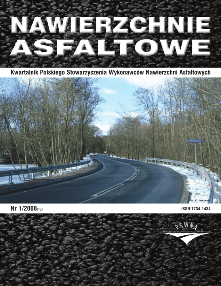 Kwartalnik Polskiego Stowarzyszenia Wykonawców Nawierzchni Asfaltowych Fot. K. Jab∏oƒski Nr 1/2008(13) ISSN 1734-1434 Spis treÊci XVIII Seminarium techniczne PSWNA Metody badaƒ mma, Zak∏adowa Kontrola Produkcji i Badania Typu – to has∏a, jakimi zapraszamy Paƒstwa do dyskusji na XVIII Seminarium PSWNA . . . . . . . . . . . . . . . . . . . . . . . . . . . . . . . 1 Oznaczanie g´stoÊci mma z u˝yciem wody Wynik badaƒ mi´dzylaboratoryjnych z u˝yciem mieszanki SMA, pozwala zalecaç zastosowanie wody, do oznaczania g´stoÊci mma w laboratoriach drogowych . . . . . . . . . . . . . . . . . . . . . . . . . . . . . . . . . . . . . . . . 2 NAWIERZCHNIE A S FA LT O W E Kwartalnik Polskiego Stowarzyszenia Wykonawców Nawierzchni Asfaltowych Informacja o Komisjach PSWNA – cz´Êç 1 Komisja ds. Kruszyw zaopiniowa∏a do Ministerstwa Transportu projekt Rozporzàdzenia Ministra Transportu w sprawie warunków dla kruszyw do mieszanek mineralno-asfaltowych (...). Komisja ds. Asfaltów rozpocz´∏a prace nad opracowaniem dokumentu aplikacyjnego do ustanowionej normy europejskiej EN 14023 „Wymagania dla asfaltów modyfikowanych” . . . . . . . . . . . . . . 4 eSeMA’2008 i 10 lat dzia∏alnoÊci Rettenmaier Polska Sp. z o.o. Tegoroczne Seminarium eSeMAí’2008 by∏o po∏àczone z jubileuszm dziesi´ciolecia firmy Rettenmaier Polska . 5 ASPHALT PAVEMENTS Quarterly of the Polish Asphalt Pavements Association Wp∏yw nawierzchni jezdni na ha∏as drogowy – cz´Êç 1 Historie badaƒ wp∏ywu nawierzchni na ha∏as drogowy prezentuje prof. Jerzy A. Ejsmont . . . . . . . . . . . . . . . . . 8 Nowe metody, nowa aparatura do oceny w∏aÊciwoÊci asfaltów oraz mieszanek mineralno-asfaltowych wg PN-EN Katedra In˝ynierii Materia∏ów Budowlanych na Wydziale In˝ynierii Làdowej Politechniki Warszawskiej . . . . . . . 11 Walne Zebranie Cz∏onków PSWNA . . . . . . . . . . . . . . . . . . . . . . . . . . . . . . . . . . . . . . . . . . . . . . . . . . . . . 14 TOP TOWER (materia∏ promocyjny firmy FAYAT Sp. z o.o.) . . . . . . . . . . . . . . . . . . . . . . . . . . . . . . . . . . . . . 14 Od redakcji Polskie Stowarzyszenie Wykonawców Nawierzchni Asfaltowych dzia∏a od 1999 r., a od 2000 r. jest cz∏onkiem EAPA (Europejskiego Stowarzyszenia Nawierzchni Asfaltowych). Celem PSWNA jest promowanie nawierzchni asfaltowych, rozwój technologii nawierzchni podatnych, a tak˝e transfer wiedzy i informacji w Êrodowisku drogowym w Polsce. Stowarzyszenie zrzesza osoby prawne i fizyczne zainteresowane rozwojem nawierzchni asfaltowych w Polsce. Szanowni Czytelnicy! Oddajemy w Paƒstwa r´ce pierwsze tegoroczne wydanie kwartalnika NAWIERZCHNIE ASFALTOWE. Wydawa∏oby si´, ˝e doÊç póêno, bo rok nabra∏ ju˝ tempa, ale na pewno w por´, bo jeszcze przed wkroczeniem w zasadniczy sezon robót drogowych. Dlatego chcemy zwróciç Paƒstwa uwag´ m.in. na badania, jakie w zakresie oznaczania g´stoÊci mma z u˝yciem wody opisuje Hanna K. Wal´cka. Ich efekt pos∏u˝y nie tylko jakoÊci dróg, ale przyczyni si´ te˝ do ochrony Êrodowiska naturalnego. Zwracamy tak˝e uwag´ na sygnalizowane podczas seminarium „eSeMA’2008” technologiczne rozwiàzania w zakresie SMA. Seminarium zosta∏o zorganizowane przez obchodzàcà swoje dziesi´ciolecie firm´ Rettenmaier Polska. Wyra˝amy nadziej´, ˝e prezentowane w kwartalniku informacje przydadzà si´ Paƒstwu w pracy zawodowej. Równie˝ – tradycyjnie – zapraszamy naszych Czytelników do dzielenia si´ z nami w∏asnymi doÊwiadczeniami oraz opiniami. W imieniu zespo∏u redakcyjnego kwartalnika NAWIERZCHNIE ASFALTOWE naszym Czytelnikom, Sympatykom, Wspó∏pracownikom oraz Cz∏onkom PSWNA sk∏adamy ˝yczenia spokojnych i pogodnych Âwiàt Wielkanocnych. REDAKCJA Czasopismo jest wspomagane finansowo przez: WYDAWCA Polskie Stowarzyszenie Wykonawców Nawierzchni Asfaltowych 02-261 Warszawa, ul. Trojaƒska 7 tel./fax (48 22) 57 44 374 tel. (48 22) 57 44 352 e-mail: [email protected] REDAKCJA Maria Jóêwiak – Redaktor Naczelny Hanna K. Wal´cka Adres Redakcji: 02-261 Warszawa, ul. Trojaƒska 7 tel./fax (48 22) 57 44 374 tel. (48 22) 57 44 352 e-mail: [email protected] www.pswna.pl ISSN 1734-1434 Szanowni Paƒstwo, PSWNA ma zaszczyt zaprosiç Paƒstwa na XVIII Seminarium Techniczne pod has∏em: „Europejskie normy metod badaƒ mma, ZKP i Badania Typu. Nowoczesne technologie w drogownictwie” organizowane w HOTELU PANORAMA w Mszczonowie k/Warszawy w dniach 10-11 kwietnia 2008 r. Do udzia∏u w Seminarium zostali zaproszeni cz∏onkowie zwyczajni i wspierajàcy PSWNA, przedstawiciele administracji drogowej oraz wszyscy zainteresowani rozwojem infrastruktury drogowej. Organizatorzy zapraszajà do udzia∏u w obradach, co nada temu spotkaniu w∏aÊciwà rang´, jak równie˝ majà nadziej´, ˝e prezentacje oraz dyskusje b´dà interesujàce, a uzyskane informacje przydatne w pracy. Ramowy Program XVIII Seminarium PSWNA Czwartek 10 kwietnia 2008 godz. 1200 – 1400 godz. 1400 Przyjazd uczestników, zakwaterowanie, obiad Otwarcie seminarium Ocena certyfikacji mma – Jolanta Ochnik, Micha∏ Przymanowski (Polskie Centrum Badaƒ i Certyfikacji S.A.) G∏ówne za∏o˝enia Badania Typu mma wg normy EN 13108-20 – Jacek Boratyƒski (TPA) ZKP wg EN 13108-21 jako narz´dzie poprawy jakoÊci i zarzàdzania kosztami produkcji mma – Bartosz Wojczakowski (Ammann Polska) Dotychczasowe doÊwiadczenia w zakresie wdro˝enia ZKP dla producentów mma – Dariusz Samsel, Tomasz Barto (TQM) Nowa metoda oceny mikrostruktury polimeroasfaltów drogowych wg PN-EN 13632 – Jan Król (Politechnika Warszawska) godz. 1930 Uroczysta Kolacja Piàtek 11 kwietnia 2008 godz. 800 – 900 godz. 900 Âniadanie Omówienie nowych norm badaƒ laboratoryjnych na ZKP i Badania Typu. Zastosowanie w praktyce! – Maria Bogacka, Halina Sarliƒska Nowe technologie stosowane w Europie – Egbert Beuving (EAPA) Mieszanki mineralno-asfaltowe „na ciep∏o“ – Ryszard Stach