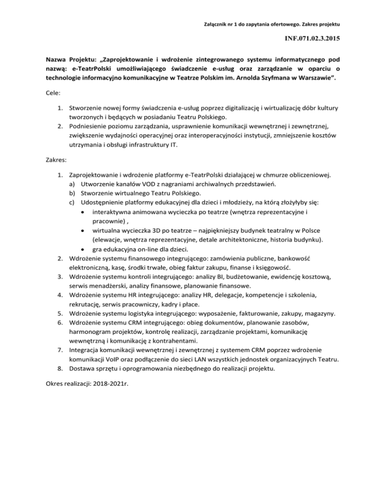 Załącznik nr 1 do zapytania ofertowego. Zakres projektu INF.071.02.3.2015 Nazwa Projektu: „Zaprojektowanie i wdrożenie zintegrowanego systemu informatycznego pod nazwą: e-TeatrPolski umożliwiającego świadczenie e-usług oraz zarządzanie w oparciu o technologie informacyjno komunikacyjne w Teatrze Polskim im. Arnolda Szyfmana w Warszawie”. Cele: 1. Stworzenie nowej formy świadczenia e-usług poprzez digitalizację i wirtualizację dóbr kultury tworzonych i będących w posiadaniu Teatru Polskiego. 2. Podniesienie poziomu zarządzania, usprawnienie komunikacji wewnętrznej i zewnętrznej, zwiększenie wydajności operacyjnej oraz interoperacyjności instytucji, zmniejszenie kosztów utrzymania i obsługi infrastruktury IT. Zakres: 1. Zaprojektowanie i wdrożenie platformy e-TeatrPolski działającej w chmurze obliczeniowej. a) Utworzenie kanałów VOD z nagraniami archiwalnych przedstawień. b) Stworzenie wirtualnego Teatru Polskiego. c) Udostępnienie platformy edukacyjnej dla dzieci i młodzieży, na którą złożyłyby się: interaktywna animowana wycieczka po teatrze (wnętrza reprezentacyjne i pracownie) , wirtualna wycieczka 3D po teatrze – najpiękniejszy budynek teatralny w Polsce (elewacje, wnętrza reprezentacyjne, detale architektoniczne, historia budynku). gra edukacyjna on-line dla dzieci. 2. Wdrożenie systemu finansowego integrującego: zamówienia publiczne, bankowość elektroniczną, kasę, środki trwałe, obieg faktur zakupu, finanse i księgowość. 3. Wdrożenie systemu kontroli integrującego: analizy BI, budżetowanie, ewidencję kosztową, serwis menadżerski, analizy finansowe, planowanie finansowe. 4. Wdrożenie systemu HR integrującego: analizy HR, delegacje, kompetencje i szkolenia, rekrutację, serwis pracowniczy, kadry i płace. 5. Wdrożenie systemu logistyka integrującego: wyposażenie, fakturowanie, zakupy, magazyny. 6. Wdrożenie systemu CRM integrującego: obieg dokumentów, planowanie zasobów, harmonogram projektów, kontrolę realizacji, zarządzanie projektami, komunikację wewnętrzną i komunikację z kontrahentami. 7. Integracja komunikacji wewnętrznej i zewnętrznej z systemem CRM poprzez wdrożenie komunikacji VoIP oraz podłączenie do sieci LAN wszystkich jednostek organizacyjnych Teatru. 8. Dostawa sprzętu i oprogramowania niezbędnego do realizacji projektu. Okres realizacji: 2018-2021r.
