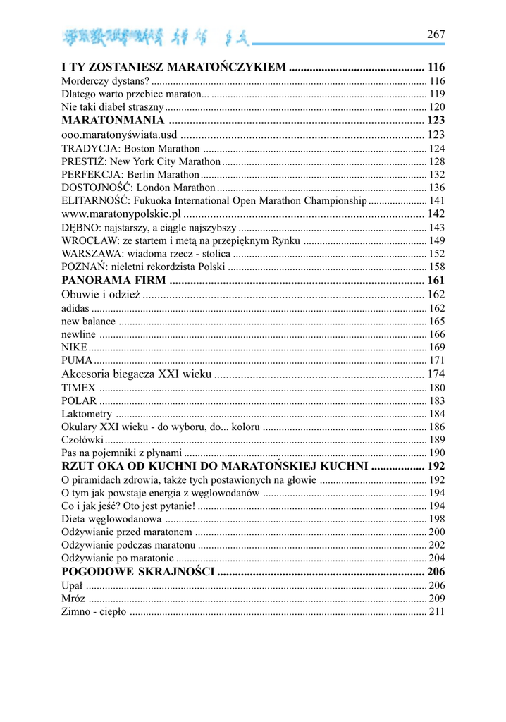 267 I TY ZOSTANIESZ MARATOÑCZYKIEM .............................................. 116 Morderczy dystans? ...................................................................................................... 116 Dlatego warto przebiec maraton... ................................................................................ 119 Nie taki diabe³ straszny ................................................................................................. 120 MARATONMANIA ...................................................................................... 123 ooo.maratonyœwiata.usd .................................................................................. 123 TRADYCJA: Boston Marathon ................................................................................... 124 PRESTI¯: New York City Marathon ............................................................................ 128 PERFEKCJA: Berlin Marathon .................................................................................... 132 DOSTOJNOŒÆ: London Marathon .............................................................................. 136 ELITARNOŒÆ: Fukuoka International Open Marathon Championship ...................... 141 www.maratonypolskie.pl ................................................................................. 142 DÊBNO: najstarszy, a ci¹gle najszybszy ...................................................................... 143 WROC£AW: ze startem i met¹ na przepiêknym Rynku .............................................. 149 WARSZAWA: wiadoma rzecz - stolica ........................................................................ 152 POZNAÑ: nieletni rekordzista Polski .......................................................................... 158 PANORAMA FIRM ...................................................................................... 161 Obuwie i odzie¿ ............................................................................................... 162 adidas ............................................................................................................................ 162 new balance .................................................................................................................. 165 newline ......................................................................................................................... 166 NIKE ............................................................................................................................. 169 PUMA ........................................................................................................................... 171 Akcesoria biegacza XXI wieku ....................................................................... 174 TIMEX ......................................................................................................................... 180 POLAR ......................................................................................................................... 183 Laktometry ................................................................................................................... 184 Okulary XXI wieku - do wyboru, do... koloru ............................................................. 186 Czo³ówki ....................................................................................................................... 189 Pas na pojemniki z p³ynami .......................................................................................... 190 RZUT OKA OD KUCHNI DO MARATOÑSKIEJ KUCHNI .................. 192 O piramidach zdrowia, tak¿e tych postawionych na g³owie ........................................ 192 O tym jak powstaje energia z wêglowodanów ............................................................. 194 Co i jak jeœæ? Oto jest pytanie! ..................................................................................... 194 Dieta wêglowodanowa ................................................................................................. 198 Od¿ywianie przed maratonem ...................................................................................... 200 Od¿ywianie podczas maratonu ..................................................................................... 202 Od¿ywianie po maratonie ............................................................................................. 204 POGODOWE SKRAJNOŒCI ...................................................................... 206 Upa³ .............................................................................................................................. 206 Mróz ............................................................................................................................. 209 Zimno - ciep³o .............................................................................................................. 211