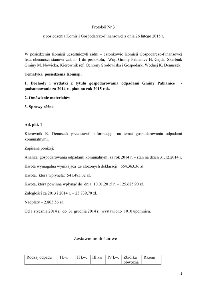 Protokół Nr 3 z posiedzenia Komisji Gospodarczo-Finansowej z dnia 26 lutego 2015 r. W posiedzeniu Komisji uczestniczyli radni – członkowie Komisji Gospodarczo-Finansowej lista obecności stanowi zał. nr 1 do protokołu, Wójt Gminy Pabianice H. Gajda, Skarbnik Gminy M. Nowicka, Kierownik ref. Ochrony Środowiska i Gospodarki Wodnej K. Denuszek. Tematyka posiedzenia Komisji: 1. Dochody i wydatki z tytułu gospodarowania odpadami Gminy Pabianice podsumowanie za 2014 r., plan na rok 2015 rok. - 2. Omówienie materiałów 3. Sprawy różne. Ad. pkt. 1 Kierownik K. Denuszek przedstawił informację komunalnymi. na temat gospodarowania odpadami Zapisana poniżej: Analiza gospodarowania odpadami komunalnymi za rok 2014 r. – stan na dzień 31.12.2014 r. Kwota wymagalna wynikająca ze złożonych deklaracji: 664.363,36 zł. Kwota, która wpłynęła: 541.483,02 zł. Kwota, która powinna wpłynąć do dnia 10.01.2015 r. – 125.685,90 zł. Zaległości za 2013 i 2014 r. – 23.739,70 zł. Nadpłaty – 2.805,56 zł. Od 1 stycznia 2014 r. do 31 grudnia 2014 r. wystawiono 1010 upomnień. Zestawienie ilościowe Rodzaj odpadu I kw. II kw. III kw. IV kw. Zbiórka obwoźna Razem 1 Komunalne zmieszane Opakowaniowe suche Szkło 330,5 372,3 344,9 307,7 _______ 1355,4 38,4 49,2 55,8 47,3 _______ 190,7 33,8 35,3 37,4 32,6 _______ 139,1 Wielkogabaryty 4,7 11,24 12,752 13,12 86,46 128,272 Odp. budowlane 16,36 12,88 32,32 _______ 87,62 26,06 15,52 Biodegradowalne 1,28 4,92 2,78 6,54 _______ Papa odpadowa ______ 8,42 12,24 10,42 _______ 31,08 Freon 0,205 ____ ____ _____ _______ 0,205 Pozostałe 0,21 ____ 3,028 0,18 _______ 3,418 Łącznie 425,455 494,26 501,22 443,92 86,46 1951,315 Razem Gmina: Razem PSZOK: 1685,20 Mg 266,155 Mg Kierownik poinformował, że na koniec roku 2014 sprawozdanie złożyła również Sp- Eco – Region Z przeprowadzonego przetargu i planu na rok 2015 wynika, że opłata w związku z gospodarowaniem odpadami komunalnymi wzrosła w skali miesiąca i wynosi 51 tys. zł. W roku 2014 wynosiła ona 40,5 tys. zł. Powyższy rachunek ekonomiczny wskazuje na to aby wystąpić ze zmianą uchwały wyboru metody opłaty za gospodarowanie odpadami komunalnymi oraz ustalenia wysokości tej opłaty, terminu, częstotliwości i trybu jej uiszczania proponuje się podniesienie stawki opłaty za śmieci segregowane w wysokości 9 zł. a niesegregowane w kwocie 13 zł. od osoby. Wówczas dochody będą mogły się zbilansować, co wynika z ustawy. Ponadto kierownik poinformował, że w roku bieżącym nie planuje się zbiórki odpadów wielkogabarytowych na terenie gminy. Funkcjonuje Punkt Selektywnej Zbiórki Odpadów Komunalnych do którego mieszkańcy mogą dowozić odpady wielo gabarytowe w punkcie przyjmuje się ich dość dużo, co świadczy o tym, że działalność punktu sprawdza się. W roku ubiegłym w ramach dopłat do utylizacji i odbioru azbestu wypłacona została kwota 7. 400 zł. tys. zł. dla 5 zainteresowanych osób, którzy wystąpili z takim wnioskiem, program ten będzie działał również w roku bieżącym. 2 Poinformował, że na koszt gminy został uprzątnięty przez pracowników gminy ze śmieci teren będący własnością Agencji Nieruchomości Skarbu Państwa, jest to teren przy lesie w Okołowicach wykorzystywany jako parking przez przyjezdnych. Kierownik przekazał także wiadomość do rozpropagowania, że zgłosiła się do niego fundacja „ Rytm Ziemi”, która poszukuje 5 ha. ziemi pod uprawę konopii przemysłowej. W dyskusji głos zabrał Ł. Drewniak, zapytał ile trafiło odpadów komunalnych w ubiegłym roku do PSZOK a ile zostało zebranych podczas przeprowadzonej zbiórki odpadów wielkogabarytowych, na które kierownik odpowiedział, że w ramach zbiórki zostało zebrane 86 ton odpadów, a do PSZOK przywieziono 42 tony odpadów. Radny Ł. Drewniak powiedział, że liczba taka wskazuje na to aby jednak utrzymać zbiórkę odpadów wielkogabarytowych na terenie gminy, natomiast radny H. Szafrański zasugerował, aby przeprowadzać taką zbiórkę raz na 2 lata. Kierownik poinformował, że są na terenie gminy osoby, które w ogóle nie złożyły deklaracji „śmieciowej” i są to osoby od których jest niemożliwe ściągnięcie komornicze należnych opłat, ponieważ nie pracują, nie pobierają zasiłków z Gminnego Ośrodka Pomocy Społecznej. Radny K. Kowalski zabierając głos powiedział, że z informacji kierownika wynika, iż jest 17 tys. zł zaległości w związku z niepłaceniem opłat za odpady komunalne. Zapytał, czy wszystkie zaległości przypadają na osoby, które nie złożyły deklaracji śmieciowych. Kierownik odpowiedział, że nie są to tylko takie osoby ale również te które nie zapłaciły należności. Sądzi, że grupa która nie złożyła deklaracji kształtuje się na 15 % poziomie. Nie potrafi jednak podać dokładnej kwoty przypadającej na tę grupę. Radny K. Kowalski zapytał na czym polega problem z wyegzekwowaniem należności. Kierownik odpowiedział, że do tej pory gmina pozostawała na dostarczaniu upomnień, nie podejmowano drogi egzekucyjnej. Radny stwierdził, że jego zadaniem gmina w obliczu deficytu nie powinna podchodzić do tego problemu w sposób tak liberalny. Kierownik uwagę przyjął do wiadomości i odpowiedział, że rozpocznie drogę egzekucyjną w powyższej sprawie. Na kolejne pytania radnego K. Kowalskiego: - czy gmina jest w posiadaniu danych statystycznych dot. liczby właścicieli nieruchomości z podziałem na kwartały zawierające poniesione kwoty opłat za odpady- kierownik odpowiedział, że takie sprawozdanie za rok 2014 będzie wykonane na dzień 30 marca 2015 r. - czy w czasie kiedy był ogłaszany przetarg na odbiór odpadów komunalnych z terenu gminy i do którego przystąpił tylko jeden oferent, były także wysyłane zapytania i oferty do innych firm, kierownik odpowiedział, że były one czynione, między innymi do Dąbrowy Górniczej, 3 z zapytaniami wystąpiły f