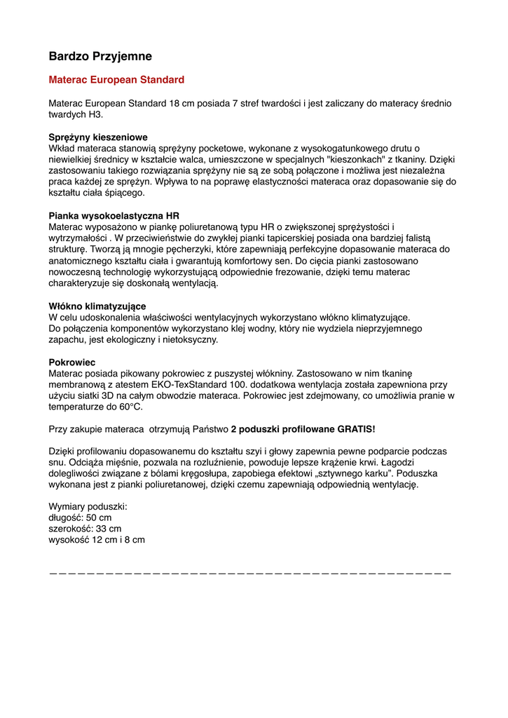 Bardzo Przyjemne Materac European Standard Materac European Standard 18 cm posiada 7 stref twardości i jest zaliczany do materacy średnio twardych H3. Sprężyny kieszeniowe Wkład materaca stanowią sprężyny pocketowe, wykonane z wysokogatunkowego drutu o niewielkiej średnicy w kształcie walca, umieszczone w specjalnych "kieszonkach" z tkaniny. Dzięki zastosowaniu takiego rozwiązania sprężyny nie są ze sobą połączone i możliwa jest niezależna praca każdej ze sprężyn. Wpływa to na poprawę elastyczności materaca oraz dopasowanie się do kształtu ciała śpiącego. Pianka wysokoelastyczna HR Materac wyposażono w piankę poliuretanową typu HR o zwiększonej sprężystości i wytrzymałości . W przeciwieństwie do zwykłej pianki tapicerskiej posiada ona bardziej falistą strukturę. Tworzą ją mnogie pęcherzyki, które zapewniają perfekcyjne dopasowanie materaca do anatomicznego kształtu ciała i gwarantują komfortowy sen. Do cięcia pianki zastosowano nowoczesną technologię wykorzystującą odpowiednie frezowanie, dzięki temu materac charakteryzuje się doskonałą wentylacją. Włókno klimatyzujące W celu udoskonalenia właściwości wentylacyjnych wykorzystano włókno klimatyzujące. Do połączenia komponentów wykorzystano klej wodny, który nie wydziela nieprzyjemnego zapachu, jest ekologiczny i nietoksyczny. Pokrowiec Materac posiada pikowany pokrowiec z puszystej włókniny. Zastosowano w nim tkaninę membranową z atestem EKO-TexStandard 100. dodatkowa wentylacja została zapewniona przy użyciu siatki 3D na całym obwodzie materaca. Pokrowiec jest zdejmowany, co umożliwia pranie w temperaturze do 60°C. Przy zakupie materaca otrzymują Państwo 2 poduszki profilowane GRATIS! Dzięki profilowaniu dopasowanemu do kształtu szyi i głowy zapewnia pewne podparcie podczas snu. Odciąża mięśnie, pozwala na rozluźnienie, powoduje lepsze krążenie krwi. Łagodzi dolegliwości związane z bólami kręgosłupa, zapobiega efektowi „sztywnego karku”. Poduszka wykonana jest z pianki poliuretanowej, dzięki czemu zapewniają odpowiednią wentylację. Wymiary poduszki: długość: 50 cm szerokość: 33 cm wysokość 12 cm i 8 cm ———————————————————————————————————————————