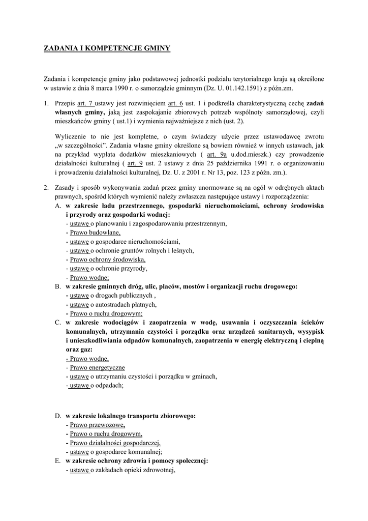 ZADANIA I KOMPETENCJE GMINY Zadania i kompetencje gminy jako podstawowej jednostki podziału terytorialnego kraju są określone w ustawie z dnia 8 marca 1990 r. o samorządzie gminnym (Dz. U. 01.142.1591) z późn.zm. 1. Przepis art. 7 ustawy jest rozwinięciem art. 6 ust. 1 i podkreśla charakterystyczną cechę zadań własnych gminy, jaką jest zaspokajanie zbiorowych potrzeb wspólnoty samorządowej, czyli mieszkańców gminy ( ust.1) i wymienia najważniejsze z nich (ust. 2). Wyliczenie to nie jest kompletne, o czym świadczy użycie przez ustawodawcę zwrotu „w szczególności”. Zadania własne gminy określone są bowiem również w innych ustawach, jak na przykład wypłata dodatków mieszkaniowych ( art. 9a u.dod.mieszk.) czy prowadzenie działalności kulturalnej ( art. 9 ust. 2 ustawy z dnia 25 października 1991 r. o organizowaniu i prowadzeniu działalności kulturalnej, Dz. U. z 2001 r. Nr 13, poz. 123 z późn. zm.). 2. Zasady i sposób wykonywania zadań przez gminy unormowane są na ogół w odrębnych aktach prawnych, spośród których wymienić należy zwłaszcza następujące ustawy i rozporządzenia: A. w zakresie ładu przestrzennego, gospodarki nieruchomościami, ochrony środowiska i przyrody oraz gospodarki wodnej: - ustawę o planowaniu i zagospodarowaniu przestrzennym, - Prawo budowlane, - ustawę o gospodarce nieruchomościami, - ustawę o ochronie gruntów rolnych i leśnych, - Prawo ochrony środowiska, - ustawę o ochronie przyrody, - Prawo wodne; B. w zakresie gminnych dróg, ulic, placów, mostów i organizacji ruchu drogowego: - ustawę o drogach publicznych , - ustawę o autostradach płatnych, - Prawo o ruchu drogowym; C. w zakresie wodociągów i zaopatrzenia w wodę, usuwania i oczyszczania ścieków komunalnych, utrzymania czystości i porządku oraz urządzeń sanitarnych, wysypisk i unieszkodliwiania odpadów komunalnych, zaopatrzenia w energię elektryczną i cieplną oraz gaz: - Prawo wodne, - Prawo energetyczne - ustawę o utrzymaniu czystości i porządku w gminach, - ustawę o odpadach; D. w zakresie lokalnego transportu zbiorowego: - Prawo przewozowe, - Prawo o ruchu drogowym, - Prawo działalności gospodarczej, - ustawę o gospodarce komunalnej; E. w zakresie ochrony zdrowia i pomocy społecznej: - ustawę o zakładach opieki zdrowotnej, - ustawę o wychowaniu w trzeźwości i przeciwdziałaniu alkoholizmowi, - ustawę o zapobieganiu narkomanii, - ustawę o pomocy społecznej; F. w zakresie zaspokajania potrzeb mieszkaniowych: - Prawo budowlane, - Prawo działalności gospodarczej, - ustawę o gospodarce komunalnej, - ustawę o ochronie praw lokatorów, mieszkaniowym zasobie gminy; G. w zakresie edukacji publicznej, kultury oraz kultury fizycznej i turystyki - ustawę o systemie oświaty, - ustawę o bibliotekach, - ustawę o ochronie dóbr kultury, - ustawę o muzeach, - ustawę o organizowaniu i prowadzeniu działalności kulturalnej, - ustawę o kulturze fizycznej, - przepisy o turystyce, H. w zakresie zieleni komunalnej i zadrzewień: - Prawo ochrony środowiska, - ustawę o ochronie przyrody; I. w zakresie cmentarzy gminnych: - ustawę o cmentarzach chowaniu zmarłych, - ustawę o grobach i cmentarzach wojennych (w przypadku przejęcia przez gminę opieki nad tego rodzaju cmentarzami); J. w zakresie porządku publicznego i bezpieczeństwa obywateli oraz ochrony przeciwpożarowej i przeciwpowodziowe: - ustawę o ochronie przeciwpożarowej, - ustawę o stanie klęski żywiołowej. 3. Art. 7 ust. 2 stanowi podstawę podziału zadań własnych gminy na obowiązkowe i fakultatywne. U podstaw tej regulacji leży próba zagwarantowania społecznościom lokalnym świadczeń publicznych na poziomie minimalnym. Realizacja obowiązku szkolnego, elementarne świadczenia z zakresu opieki społecznej to przykłady zadań, które każda gmina w cywilizowanym świecie powinna spełniać. Ustawodawca nie formułuje katalogu zadań obligatoryjnych. Odsyła w tym zakresie do prawa materialnego. Zgodnie z ust. 2 obowiązkowy charakter zadań własnych określają ustawy. Jeżeli zatem ustawodawca określi konkretne zadanie jako obowiązkowe, to wówczas na gminie (jej organach) ciąż obowiązek ich wykonania, a obywatelowi przysługuje z tego powodu roszczenie (Z. Niewiadomski, W. Grzelczak: Komentarz, s. 12-13). Zapis, iż ustawy zawierają ustalenia, które zadania należą do obligatoryjnych zadań gminy, ma doniosłe konsekwencje prawne. Oznacza, że obarczyć gminy zadaniem obowiązkowym nie może żaden inny akt prawny, decyzja administracyjna czy wyrok sądowy. Przeciw takim działaniom gminie służy ochrona, o której mowa w art. 2 ust. 3 u.sam.gmin. 4. Obok zadań już przez gminy wykonanych ustawy mogą nakładać na gminy nowe zadania własne. Warunkiem legalności (i skuteczności) takich poczynań jest jednak zapewnienie gminom środków finansowych koniecznych do realizacji tych zadań. Może to polegać na zwiększeniu dochodów własnych albo na przyznaniu subwencji (na przykład subwencja oświatowa związana z prowadzenie szkół przez gminy). W sprawach tych stosuje się odpowiednio przepisy art. 8 ust. 4 i 5 u.sam.gmin. (zob. objaśnienia do tych przepisów). 5. Poza zadaniami własnymi gmina wykonuje także na rzecz swoich mieszkańców tzw. Zadania zlecone. Zadania zlecone to te, które gmina jako jednostka samorządowa przyjmuję na siebie realizację zadań w imieniu administracji państwowej. Są to zadania: - ewidencji ludności - dowodów osobistych - urzędu stanu cywilnego - rejestru wyborców - obrony narodowej - zarządzania kryzysowego Zadania te są nałożone na gminę do realizacji stosowanymi ustawami. Gminy otrzymują środki na ich wykonywanie. 6. Istnieje także kategoria zadań „powierzonych” W tej grupie znajdują się zadania które gmina nie musi ale chce wykonywać. Podstawą prawną do ich realizacji jest zawarcie porozumienia między gminą a inną jednostką samorządową (np. powiatem) i ich rea