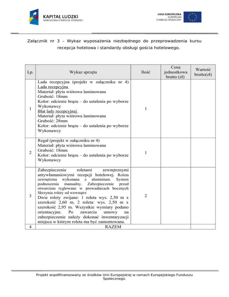 Załącznik nr 3 – Wykaz wyposażenia niezbędnego do przeprowadzenia kursu recepcja hotelowa i standardy obsługi gościa hotelowego. Lp. 1 2 Wykaz sprzętu Lada recepcyjna (projekt w załączniku nr 4) Lada recepcyjna Materiał: płyta wiórowa laminowana Grubość: 18mm Kolor: odcienie brązu – do ustalenia po wyborze Wykonawcy Blat lady recepcyjnej Materiał: płyta wiórowa laminowana Grubość: 28mm Kolor: odcienie brązu – do ustalenia po wyborze Wykonawcy Regał (projekt w załączniku nr 4) Materiał: płyta wiórowa laminowana Grubość: 18mm Kolor: odcienie brązu – do ustalenia po wyborze Wykonawcy Ilość Cena jednostkowa brutto (zł) 1 1 Zabezpieczenie roletami zewnętrznymi antywłamaniowymi recepcji hotelowej. Roleta 3 4 zewnętrzna wykonana z aluminium. System podnoszenia manualny. Zabezpieczenie przed otwarciem ryglowane w prowadnicach bocznych Skrzynia rolety od wewnątrz Dwie rolety zwijane: 1 roleta wys. 2,50 m x szerokość 2,60 m, 2 roleta: wys. 2,50 m x szerokość 2,95 m. Wszystkie wymiary podano orientacyjne. Po zawarciu umowy na zabezpieczenie należy dokonać inwentaryzacji miejsca w którym roleta ma być zamontowana. RAZEM 2 Projekt współfinansowany ze środków Unii Europejskiej w ramach Europejskiego Funduszu Społecznego. Wartość brutto(zł)