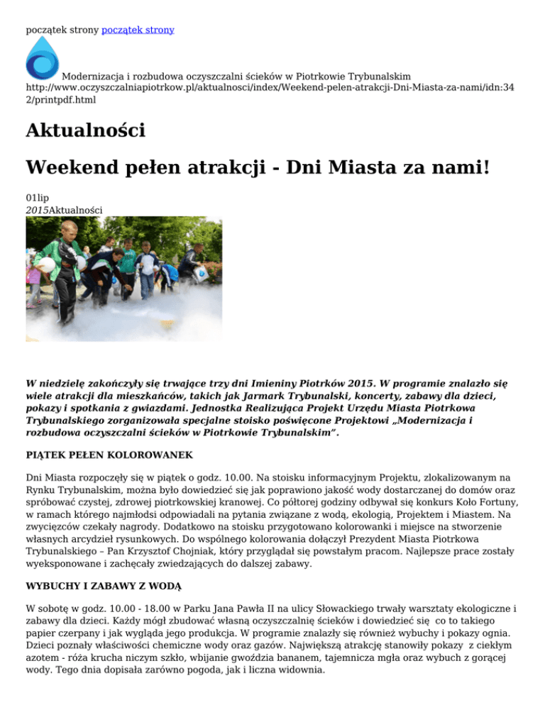 początek strony początek strony Modernizacja i rozbudowa oczyszczalni ścieków w Piotrkowie Trybunalskim http://www.oczyszczalniapiotrkow.pl/aktualnosci/index/Weekend-pelen-atrakcji-Dni-Miasta-za-nami/idn:34 2/printpdf.html Aktualności Weekend pełen atrakcji - Dni Miasta za nami! 01lip 2015Aktualności W niedzielę zakończyły się trwające trzy dni Imieniny Piotrków 2015. W programie znalazło się wiele atrakcji dla mieszkańców, takich jak Jarmark Trybunalski, koncerty, zabawy dla dzieci, pokazy i spotkania z gwiazdami. Jednostka Realizująca Projekt Urzędu Miasta Piotrkowa Trybunalskiego zorganizowała specjalne stoisko poświęcone Projektowi „Modernizacja i rozbudowa oczyszczalni ścieków w Piotrkowie Trybunalskim”. PIĄTEK PEŁEN KOLOROWANEK Dni Miasta rozpoczęły się w piątek o godz. 10.00. Na stoisku informacyjnym Projektu, zlokalizowanym na Rynku Trybunalskim, można było dowiedzieć się jak poprawiono jakość wody dostarczanej do domów oraz spróbować czystej, zdrowej piotrkowskiej kranowej. Co półtorej godziny odbywał się konkurs Koło Fortuny, w ramach którego najmłodsi odpowiadali na pytania związane z wodą, ekologią, Projektem i Miastem. Na zwycięzców czekały nagrody. Dodatkowo na stoisku przygotowano kolorowanki i miejsce na stworzenie własnych arcydzieł rysunkowych. Do wspólnego kolorowania dołączył Prezydent Miasta Piotrkowa Trybunalskiego – Pan Krzysztof Chojniak, który przyglądał się powstałym pracom. Najlepsze prace zostały wyeksponowane i zachęcały zwiedzających do dalszej zabawy. WYBUCHY I ZABAWY Z WODĄ W sobotę w godz. 10.00 - 18.00 w Parku Jana Pawła II na ulicy Słowackiego trwały warsztaty ekologiczne i zabawy dla dzieci. Każdy mógł zbudować własną oczyszczalnię ścieków i dowiedzieć się co to takiego papier czerpany i jak wygląda jego produkcja. W programie znalazły się również wybuchy i pokazy ognia. Dzieci poznały właściwości chemiczne wody oraz gazów. Największą atrakcję stanowiły pokazy z ciekłym azotem - róża krucha niczym szkło, wbijanie gwoździa bananem, tajemnicza mgła oraz wybuch z gorącej wody. Tego dnia dopisała zarówno pogoda, jak i liczna widownia. W niedzielę przygotowano zabawy i animacje dla dzieci. Mimo deszczowej aury, w kolejkę na malowanie buzi ustawiło się wiele dzieci. W efekcie Park zamienił się w istne „zoo”, pełne kolorowych motylków, tygrysów, lwów, kotów i pająków. Oprócz działań oferowanych w ramach akcji promocyjnej Projektu „Modernizacja i rozbudowa oczyszczalni ścieków w Piotrkowie Trybunalskim” na mieszkańców czekało wiele innych atrakcji, przygotowanych przez Miasto. Stoisko projektowe podczas Dni Miasta to jedna z akcji promocyjnych realizowanych w ramach projektu „Modernizacja i rozbudowa oczyszczalni ścieków w Piotrkowie Trybunalskim”, współfinansowanego przez Unię Europejską ze środków Funduszu Spójności w ramach Programu Infrastruktura i Środowisko. Szczegółowe informacje o Projekcie oraz fotorelacją z wydarzenia na stronie: www.oczyszczalniapiotrkow.pl wszystkie
