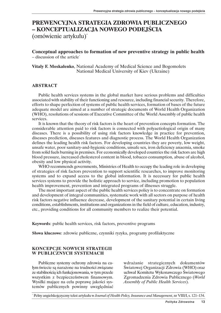 Prewencyjna strategia zdrowia publicznego – konceptualizacja nowego podejÊcia PREWENCYJNA STRATEGIA ZDROWIA PUBLICZNEGO – KONCEPTUALIZACJA NOWEGO PODEJÂCIA (omówienie artyku∏u)* Conceptual approaches to formation of new preventive strategy in public health – discussion of the article* Vitaly F. Moskalenko, National Academy of Medical Science and Bogomolets National Medical University of Kiev (Ukraine) ABSTRACT Public health services systems in the global market have serious problems and difficulties associated with stability of their functioning and resource, including financial security. Therefore, efforts to shape perfection of systems of public health services, formation of bases of the future adequate model are aimed at a number of strategic documents of World Health Organization (WHO), resolutions of sessions of Executive Committee of the World Assembly of public health services. It is known that the theory of risk factors is the heart of prevention concepts formation. The considerable attention paid to risk factors is connected with polyaetiological origin of many diseases. There is a possibility of using risk factors knowledge in practice for prevention, diseases prediction, diseases features and diagnostic process. The World Health Organization defines the leading health risk factors. For developing countries they are poverty, low weight, unsafe water, poor sanitary-and-hygienic conditions, unsafe sex, iron deficiency anaemia, smoke from solid fuels burning in premises. For economically developed countries the risk factors are high blood pressure, increased cholesterol content in blood, tobacco consumption, abuse of alcohol, obesity and low physical activity. WHO recommends governments, Ministries of Health to occupy the leading role in developing of strategies of risk factors prevention to support scientific researches, to improve monitoring systems and to expand access to the global information. It is necessary for public health services systems to provide the holistic approach to service, including promotion to population health improvement, prevention and integrated programs of illnesses struggle. The most important aspect of the public health services policy is to concentrate on formation and development of integral communities, systematic work with all sectors on purpose of health risk factors negative influence decrease, development of the sanitary potential in certain living conditions, establishments, institutions and organizations in the field of culture, education, industry, etc., providing conditions for all community members to realize their potential. Keywords: public health services, risk factors, preventive programs S∏owa kluczowe: zdrowie publiczne, czynniki ryzyka, programy profilaktyczne KONCEPCJE NOWYCH STRATEGII W PUBLICZNYCH SYSTEMACH Publiczne systemy ochrony zdrowia na ca∏ym Êwiecie sà nara˝one na trudnoÊci zwiàzane ze stabilnoÊcià ich funkcjonowania, w tym przede wszystkim z bezpieczeƒstwem finansowym. Wysi∏ki majàce na celu popraw´ jakoÊci systemów publicznych powinny uwzgl´dniaç * wdra˝anie strategicznych dokumentów Âwiatowej Organizacji Zdrowia (WHO) oraz uchwa∏ Komitetu Wykonawczego Âwiatowego Zgromadzenia Zdrowia Publicznego (World Assembly of Public Health Services). Pe∏ny angielskoj´zyczny tekst artyku∏u w Journal of Health Policy, Insurance and Management, nr VIII/I, s. 121–134. Polityka Zdrowotna 13 Vitaly F. Moskalenko Profesor Vitaly F. Moskalenko zak∏ada, i˝ teoria czynników ryzyka stanowi podstaw´ skutecznej profilaktyki i wià˝e si´ z etiologià wielu schorzeƒ. JednoczeÊnie, zgodnie z zaleceniami World Health Organization (WHO), autor klasyfikuje g∏ówne czynniki ryzyka, którymi dla krajów rozwijajàcych si´ sà: ubóstwo, niska masa cia∏a, ska˝enie wody pitnej, z∏e warunki sanitarno-higieniczne, seks z przypadkowymi partnerami, niedokrwistoÊç z niedoboru ˝elaza oraz dym z paliw sta∏ych stosowanych do ogrzewania pomieszczeƒ. W krajach rozwini´tych czynniki te to: nadciÊnienie, podwy˝szony poziom cholesterolu we krwi, palenie tytoniu, nadu˝ywanie alkoholu, oty∏oÊç oraz ma∏à aktywnoÊç fizyczna. WHO zaleca, by ministerstwa zdrowia ponosi∏y odpowiedzialnoÊç za opracowywanie strategii profilaktyki zdrowotnej, opartej na teorii czynników ryzyka, gdy˝ stanowi to wsparcie dla prowadzenia badaƒ naukowych oraz jest celem poprawy systemów monitorowania i upowszechniania informacji. G∏ównym celem publicznych systemów ochrony zdrowia powinno byç ca∏oÊciowe (holistyczne) pojmowanie poszczególnych procedur w obr´bie promocji zdrowia, zapobieganie oraz funkcjonowanie zintegrowanych programów walki z chorobami cywilizacyjnymi. Profesor Vitaly F. Moskalenko apeluje, i˝ najwa˝niejszym aspektem zdrowia publicznego jest skoncentrowanie si´ na tworzeniu i integralnym rozwoju spo∏eczeƒstw, systematyczna praca na poziomie wszystkich sektorów w zakresie eliminacji czynników ryzyka, poprawa warunków sanitarno-higienicznych w zak∏adach, instytucjach i organizacjach dzia∏ajàcych na rzecz kultury, edukacji, przemys∏u oraz zapewnienie równego dost´pu do dóbr wszystkim cz∏onkom spo∏ecznoÊci. Autor zaznacza, i˝ poziom rozwoju gospodarczego kraju, spo∏eczeƒstwa i ka˝dego obywatela ma istotny wp∏yw na zdrowie. Za g∏ówny kierunek polityki spo∏ecznej uznaje popraw´ stanu zdrowia. Wnioskuje, aby w dobie ogólnoÊwiatowego kryzysu gospodarczego przewidywaç skutki tego kryzysu, w przeciwnym razie b´dà one wywiera∏y negatywny wp∏yw na funkcjonowanie publicznych systemów ochrony zdrowia. 1 W oparciu o dokumentacj´ WHO 1 dotyczàcà koncepcji doskonalenia publicznych systemów ochrony zdrowia (karta Tallin, karta Bangkok, uchwa∏y sesji Komitetu Wykonawczego Âwiatowego Zgromadzenia Zdrowia Publicznego) zauwa˝a koniecznoÊç podnoszenia jakoÊci us∏ug w sektorze publicznym. Wi´kszoÊç krajów przeprowadzi∏o wszechstronne reformy w
