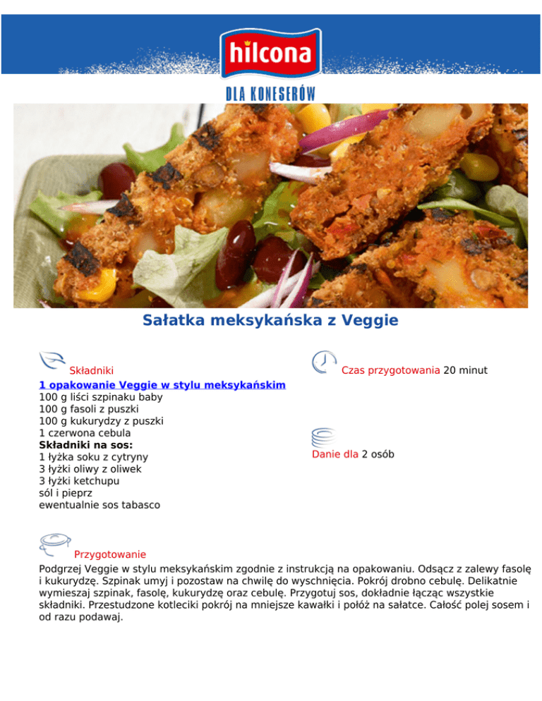 Sałatka meksykańska z Veggie Składniki 1 opakowanie Veggie w stylu meksykańskim 100 g liści szpinaku baby 100 g fasoli z puszki 100 g kukurydzy z puszki 1 czerwona cebula Składniki na sos: 1 łyżka soku z cytryny 3 łyżki oliwy z oliwek 3 łyżki ketchupu sól i pieprz ewentualnie sos tabasco Czas przygotowania 20 minut Danie dla 2 osób Przygotowanie Podgrzej Veggie w stylu meksykańskim zgodnie z instrukcją na opakowaniu. Odsącz z zalewy fasolę i kukurydzę. Szpinak umyj i pozostaw na chwilę do wyschnięcia. Pokrój drobno cebulę. Delikatnie wymieszaj szpinak, fasolę, kukurydzę oraz cebulę. Przygotuj sos, dokładnie łącząc wszystkie składniki. Przestudzone kotleciki pokrój na mniejsze kawałki i połóż na sałatce. Całość polej sosem i od razu podawaj.