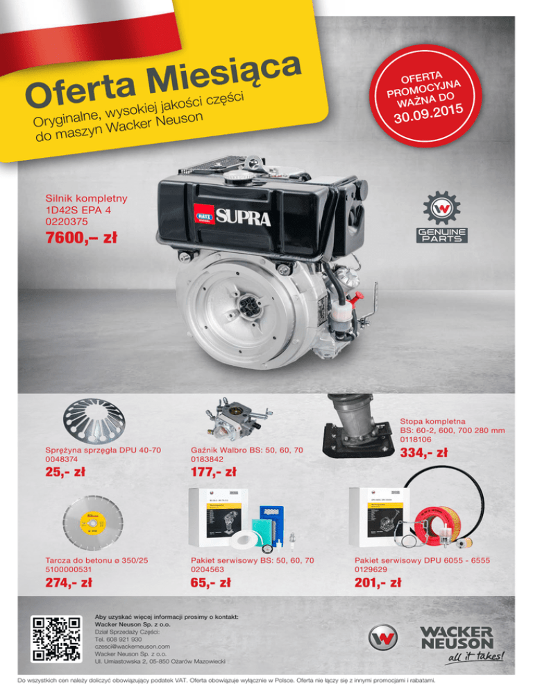 a c ą i s e i M a t r Ofe części i c ś o k ja wysokiej uson , e ln a in g Or y acker Ne W n y z s a do m A OFERT NA Y C O J PROM A DO WAŻN 015 30.09.2 Silnik kompletny 1D42S EPA 4 0220375 7600,– zł Sprężyna sprzęgła DPU 40-70 0048374 Gaźnik Walbro BS: 50, 60, 70 0183842 Tarcza do betonu ø 350/25 5100000531 Pakiet serwisowy BS: 50, 60, 70 0204563 25,- zł 274,- zł 177,- zł 65,- zł Stopa kompletna BS: 60-2, 600, 700 280 mm 0118106 334,- zł Pakiet serwisowy DPU 6055 - 6555 0129629 201,- zł Aby uzyskać więcej informacji prosimy o kontakt: Wacker Neuson Sp. z o.o. Dział Sprzedaży Części: Tel. 608 921 930 [email protected] Wacker Neuson Sp. z o.o. Ul. Umiastowska 2, 05-850 Ożarów Mazowiecki Do wszystkich cen należy doliczyć obowiązujący podatek VAT. Oferta obowiązuje wyłącznie w Polsce. Oferta nie łączy się z innymi promocjami i rabatami.