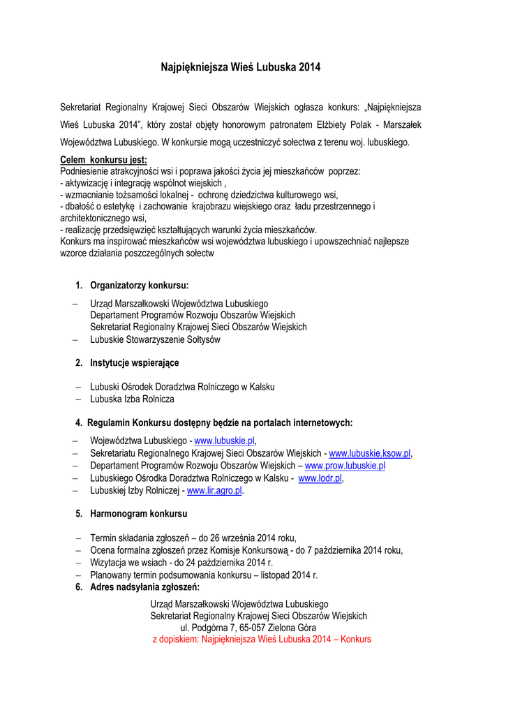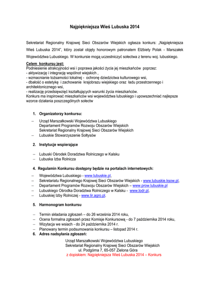 Najpiękniejsza Wieś Lubuska 2014 Sekretariat Regionalny Krajowej Sieci Obszarów Wiejskich ogłasza konkurs: „Najpiękniejsza Wieś Lubuska 2014”, który został objęty honorowym patronatem Elżbiety Polak - Marszałek Województwa Lubuskiego. W konkursie mogą uczestniczyć sołectwa z terenu woj. lubuskiego. Celem konkursu jest: Podniesienie atrakcyjności wsi i poprawa jakości życia jej mieszkańców poprzez: - aktywizację i integrację wspólnot wiejskich , - wzmacnianie tożsamości lokalnej - ochronę dziedzictwa kulturowego wsi, - dbałość o estetykę i zachowanie krajobrazu wiejskiego oraz ładu przestrzennego i architektonicznego wsi, - realizację przedsięwzięć kształtujących warunki życia mieszkańców. Konkurs ma inspirować mieszkańców wsi województwa lubuskiego i upowszechniać najlepsze wzorce działania poszczególnych sołectw 1. Organizatorzy konkursu: Urząd Marszałkowski Województwa Lubuskiego Departament Programów Rozwoju Obszarów Wiejskich Sekretariat Regionalny Krajowej Sieci Obszarów Wiejskich Lubuskie Stowarzyszenie Sołtysów 2. Instytucje wspierające Lubuski Ośrodek Doradztwa Rolniczego w Kalsku Lubuska Izba Rolnicza 4. Regulamin Konkursu dostępny będzie na portalach internetowych: Województwa Lubuskiego - www.lubuskie.pl, Sekretariatu Regionalnego Krajowej Sieci Obszarów Wiejskich - www.lubuskie.ksow.pl, Departament Programów Rozwoju Obszarów Wiejskich – www.prow.lubuskie.pl Lubuskiego Ośrodka Doradztwa Rolniczego w Kalsku - www.lodr.pl, Lubuskiej Izby Rolniczej - www.lir.agro.pl. 5. Harmonogram konkursu 6. Termin składania zgłoszeń – do 26 września 2014 roku, Ocena formalna zgłoszeń przez Komisje Konkursową - do 7 października 2014 roku, Wizytacja we wsiach - do 24 października 2014 r. Planowany termin podsumowania konkursu – listopad 2014 r. Adres nadsyłania zgłoszeń: Urząd Marszałkowski Województwa Lubuskiego Sekretariat Regionalny Krajowej Sieci Obszarów Wiejskich ul. Podgórna 7, 65-057 Zielona Góra z dopiskiem: Najpiękniejsza Wieś Lubuska 2014 – Konkurs