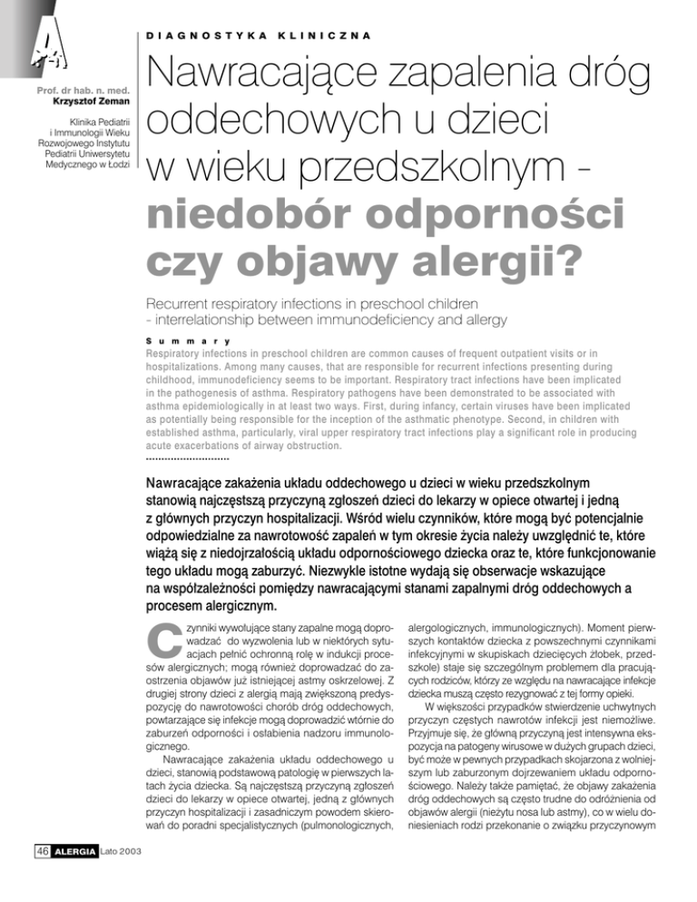 D I A G N O S T Y K A Prof. dr hab. n. med. Krzysztof Zeman Klinika Pediatrii i Immunologii Wieku Rozwojowego Instytutu Pediatrii Uniwersytetu Medycznego w Łodzi K L I N I C Z N A Nawracające zapalenia dróg oddechowych u dzieci w wieku przedszkolnym niedobór odporności czy objawy alergii? Recurrent respiratory infections in preschool children - interrelationship between immunodeficiency and allergy S u m m a r y Respiratory infections in preschool children are common causes of frequent outpatient visits or in hospitalizations. Among many causes, that are responsible for recurrent infections presenting during childhood, immunodeficiency seems to be important. Respiratory tract infections have been implicated in the pathogenesis of asthma. Respiratory pathogens have been demonstrated to be associated with asthma epidemiologically in at least two ways. First, during infancy, certain viruses have been implicated as potentially being responsible for the inception of the asthmatic phenotype. Second, in children with established asthma, particularly, viral upper respiratory tract infections play a significant role in producing acute exacerbations of airway obstruction. ........................... Nawracające zakażenia układu oddechowego u dzieci w wieku przedszkolnym stanowią najczęstszą przyczyną zgłoszeń dzieci do lekarzy w opiece otwartej i jedną z głównych przyczyn hospitalizacji. Wśród wielu czynników, które mogą być potencjalnie odpowiedzialne za nawrotowość zapaleń w tym okresie życia należy uwzględnić te, które wiążą się z niedojrzałością układu odpornościowego dziecka oraz te, które funkcjonowanie tego układu mogą zaburzyć. Niezwykle istotne wydają się obserwacje wskazujące na współzależności pomiędzy nawracającymi stanami zapalnymi dróg oddechowych a procesem alergicznym. C zynniki wywołujące stany zapalne mogą doprowadzać do wyzwolenia lub w niektórych sytuacjach pełnić ochronną rolę w indukcji procesów alergicznych; mogą również doprowadzać do zaostrzenia objawów już istniejącej astmy oskrzelowej. Z drugiej strony dzieci z alergią mają zwiększoną predyspozycję do nawrotowości chorób dróg oddechowych, powtarzające się infekcje mogą doprowadzić wtórnie do zaburzeń odporności i osłabienia nadzoru immunologicznego. Nawracające zakażenia układu oddechowego u dzieci, stanowią podstawową patologię w pierwszych latach życia dziecka. Są najczęstszą przyczyną zgłoszeń dzieci do lekarzy w opiece otwartej, jedną z głównych przyczyn hospitalizacji i zasadniczym powodem skierowań do poradni specjalistycznych (pulmonologicznych, 46 ALERGIA Lato 2003 alergologicznych, immunologicznych). Moment pierwszych kontaktów dziecka z powszechnymi czynnikami infekcyjnymi w skupiskach dziecięcych żłobek, przedszkole) staje się szczególnym problemem dla pracujących rodziców, którzy ze względu na nawracające infekcje dziecka muszą często rezygnować z tej formy opieki. W większości przypadków stwierdzenie uchwytnych przyczyn częstych nawrotów infekcji jest niemożliwe. Przyjmuje się, że główną przyczyną jest intensywna ekspozycja na patogeny wirusowe w dużych grupach dzieci, być może w pewnych przypadkach skojarzona z wolniejszym lub zaburzonym dojrzewaniem układu odpornościowego. Należy także pamiętać, że objawy zakażenia dróg oddechowych są często trudne do odróżnienia od objawów alergii (nieżytu nosa lub astmy), co w wielu doniesieniach rodzi przekonanie o związku przyczynowym D I A G N O S T Y K A tych zjawisk. Badania oparte na nowoczesnej diagnostyce zakażeń z identyfikacją czynników infekcyjnych wskazują, że w niektórych przypadkach udaje się taki związek przyczynowy znaleźć. Nawracające zapalenia dróg oddechowych u dzieci Określenie nawracających zakażeń układu oddechowego (w tym: zapalenia uszu, gardła, nosogardzieli, zatok, oskrzeli, płuc, migdałków podniebiennych) wg różnych definicji stosuje się, jeśli dochodzi do nich ponad 6-8 razy w roku, w zależności od ciężkości i przebiegu klinicznego choroby, wieku dziecka i wielu mających wpływ czynników środowiskowych (skupiska, warunki domowe, chorujące rodzeństwo, narażenie na bierne palenie, współistnienie innych chorób w tym alergii, itp.) (1). Przyjmuje się szacunkowo, że około 15% dzieci w wieku przedszkolnym spełnia te kryteria. Dlatego też, w celu ustalenia przyczyny nawracających zakażeń dróg oddechowych u dzieci, poza dokładnie zebranym wywiadem chorobowym i wnikliwą oceną kliniczną ważne są badania diagnostyczne i laboratoryjne pomagające wykluczyć choroby wrodzone i nabyte usposabiające do zakażeń dróg oddechowych, w tym: alergie, przewlekłe choroby płuc, niedobory enzymatyczne (niedobór a1-antytrypsyny), choroby metaboliczne (mukowiscydoza), wady anatomiczne układu oddechowego, refluks żołądkowo-przełykowy, niektóre choroby laryngologiczne i kardiologiczne, niektóre zakażenia pasożytnicze (askarioza, toksokaroza) oraz pierwotne i wtórne zaburzenia odporności (2). W patogenezie chorób układu oddechowego u dzieci najważniejszą i potwierdzoną wieloma badaniami rolę odgrywają wirusy, głównie oddechowe: pikornawirusy (Coxsackie A i B, ECHO, rynowirusy), adenowirusy, ortomiksowirusy (wirus grypy), paramyksowirusy (RSV, wirusy paragrypy), koronawirusy. Nie sposób pominąć roli bakterii głównie Haemophilus influenzae, Bordetella pertussis, Klebsiella pneumoniae, Streptococcus pneumoniae, Staphylococcus aureus. Typowymi czynnikami zakażeń nabytych w środowisku pozaszpitalnym (community aquired) u dzieci z normalną dla wieku odpornością immunologiczną są w chorobie przeziębieniowej rynowirusy, RSV i wirusy paragrypy, w ostrym nieżycie gardła lub anginie paciorkowce grupy A, adenowirusy, wirusy grypy i paragrypy, zapalenie oskrzeli i oskrzelików RSV i wirusy paragrypy; zapalenia płuc wiosną najczęściej powodu