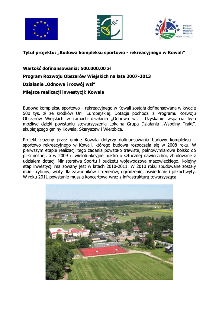 Tytuł projektu: „Budowa kompleksu sportowo - rekreacyjnego w Kowali” Wartość dofinansowania: 500.000,00 zł Program Rozwoju Obszarów Wiejskich na lata 2007-2013 Działanie „Odnowa i rozwój wsi” Miejsce realizacji inwestycji: Kowala Budowa kompleksu sportowo – rekreacyjnego w Kowali została dofinansowana w kwocie 500 tys. zł ze środków Unii Europejskiej. Dotacja pochodzi z Programu Rozwoju Obszarów Wiejskich w ramach działania „Odnowa wsi”. Uzyskanie wsparcia było możliwe dzięki powstaniu stowarzyszenia Lokalna Grupa Działania „Wspólny Trakt”, skupiającego gminy Kowala, Skaryszew i Wierzbica. Projekt złożony przez gminę Kowala dotyczy dofinansowania budowy kompleksu – sportowo rekreacyjnego w Kowali, którego budowa rozpoczęła się w 2008 roku. W pierwszym etapie realizacji tego zadania powstało trawiste, pełnowymiarowe boisko do piłki nożnej, a w 2009 r. wielofunkcyjne boisko o sztucznej nawierzchni, zbudowane z udziałem dotacji Ministerstwa Sportu i budżetu województwa mazowieckiego. Kolejny etap inwestycji realizowany jest w latach 2010-2011. W 2010 roku zbudowane zostały m.in. trybuny, wiaty dla zawodników i trenerów, ogrodzenie, oświetlenie i piłkochwyty. W roku 2011 powstanie muszla koncertowa wraz z infrastrukturą towarzyszącą.