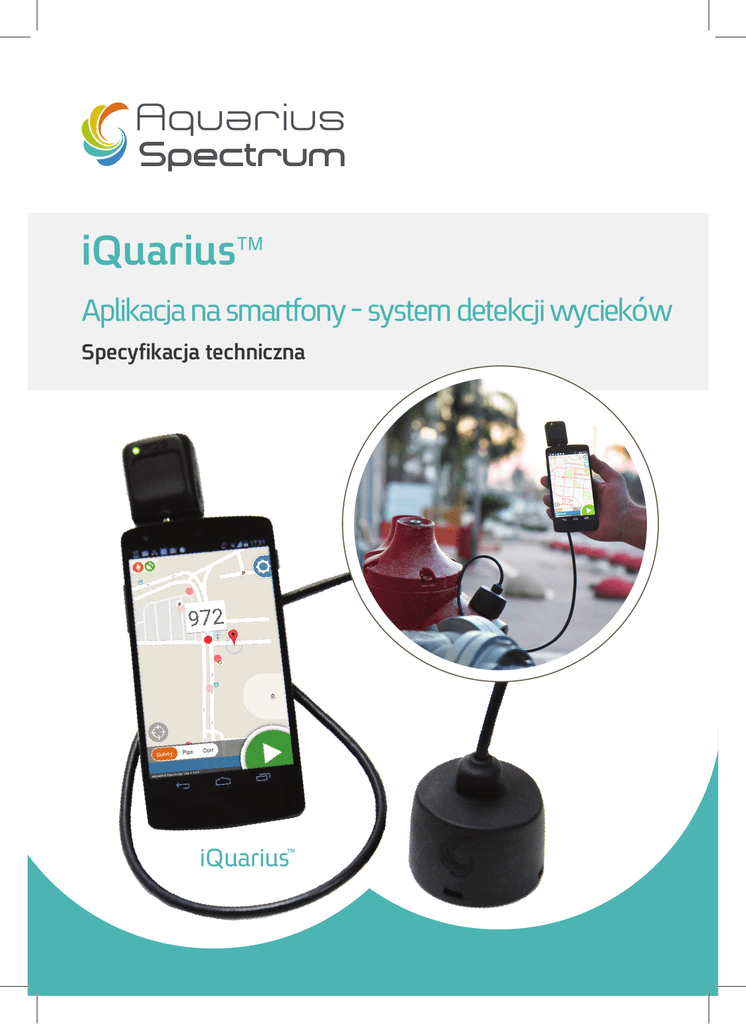 iQuariusTM Aplikacja na smartfony - system detekcji wycieków Specyfikacja techniczna Tryby pracy Akustyczny przegląd wycieków • Tryb 1: Korelacja między dwoma czujnikami współpracującymi ze smartfonami • Detekcja wycieków poprzez pomiar akustyczny • Tryb 2: Nieskorelowany pomiar przy użyciu jednego urządzenia • Adaptacyjne filtrowanie zakłóceń i hałasów • Zaawansowany przegląd cyfrowego przetwarzania sygnału wycieku poprzez rejestrowanie dźwięku i nakładnie go na mapę dzięki GPS • Trójnożny adapter dla twardych powierzchni • Wysięgnik nasłuchowy z zaokrągloną końcówką dla miękkich powierzchni (gleba,trawa) lub magnes • Pozycjonowanie na mapie dzięki GPS zewnętrznych • Graficzne urządzenie wyrównawcze • Nastawione filtrowanie dla różnych czujników/ wydłużeń Korelacja • Automatyczna korelacja wycieku między dwoma czujnikami i dwoma smartfonami Specyfikacja techniczna czujnikówAcoustic • Automatyczny pomiar długości rurociągu poprzez GPS Sensor: • Rozmieszczenie czujników na mapie • Typ piezo, czułość 1 mikro G • IP 67 • Zakres wykrywania na rurociągach metalowych do 300 m między czujnikami • Zakres temperatury: od -10o do 50oC • Precyzja lokalizacji do 20 cm • Podstawa magnetyczna dla podłączania do rur lub innych części infrastruktury • Adaptacyjne filtrowanie sygnałów • Długość kabla do adaptera: 1,6 m Prezentacja internetowa i na smartfonie• • • • • Akumulator litowo-jonowy zapewnia 10 h ciągłej pracy • Prezentacja wszystkich pomiarów na mapie wedle Supported Smartphones: • System Android V.4 lub nowszy • System iOS – w budowie zadania na platformie internetowej iQuarius™ • Prezentacja wszystkich warstw rurociągów na mapie • Szerokie możliwości raportowania online Sensor Adaptor: Działanie i kontrola • Standardowe złącze audio jack 3,5 mm dla smartfonów • Złącze do ładowarki: mikro USB • Wskaźnik LED potwierdzający podłączenie do telefonu • Zarządzanie projektami w oparciu o zadania Signal Processing: • Odbiór sygnału cyfrowego 16-bitowego • Wbudowane raportowanie o wykryciu wycieków • Wsparcie eksperckie online Certyfikaty IFIED O RT SI ISO 9001: 2008 MS • Odpowiedź częstotliwościowa czujnika: 10-4000 Hz CE • Zakres odbioru: 8-44 kHz • Dokładność sychronizacji korelacji <0,5 ms www.aquarius-spectrum.com Sejcom Sp. z o.o. - autoryzowany przedstawiciel Aquarius-Spectrum, ul. Jana Pawła II 214, 05-077 Warszawa Tel: +48 22 378 38 96, +48 32 722 06 99, Faks: +48 22 188 12 92, www.sejcom.eu, e-mail: [email protected]