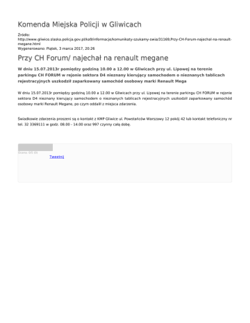 Komenda Miejska Policji w Gliwicach Źródło: http://www.gliwice.slaska.policja.gov.pl/ka9/informacje/komunikaty-szukamy-swia/31169,Przy-CH-Forum-najechal-na-renaultmegane.html Wygenerowano: Piątek, 3 marca 2017, 20:26 Przy CH Forum/ najechał na renault megane W dniu 15.07.2013r pomiędzy godziną 10.00 a 12.00 w Gliwicach przy ul. Lipowej na terenie parkingu CH FORUM w rejonie sektora D4 nieznany kierujący samochodem o nieznanych tablicach rejestracyjnych uszkodził zaparkowany samochód osobowy marki Renault Mega W dniu 15.07.2013r pomiędzy godziną 10.00 a 12.00 w Gliwicach przy ul. Lipowej na terenie parkingu CH FORUM w rejonie sektora D4 nieznany kierujący samochodem o nieznanych tablicach rejestracyjnych uszkodził zaparkowany samochód osobowy marki Renault Megane, po czym oddalił z miejsca zdarzenia. Świadkowie zdarzenia proszeni są o kontakt z KMP Gliwice ul. Powstańców Warszawy 12 pokój 42 lub kontakt telefoniczny nr tel. 32 3369111 w godz. 08.00 - 14.00 oraz 997 czynny całą dobę. Ocena: 0/5 (0) Tweetnij