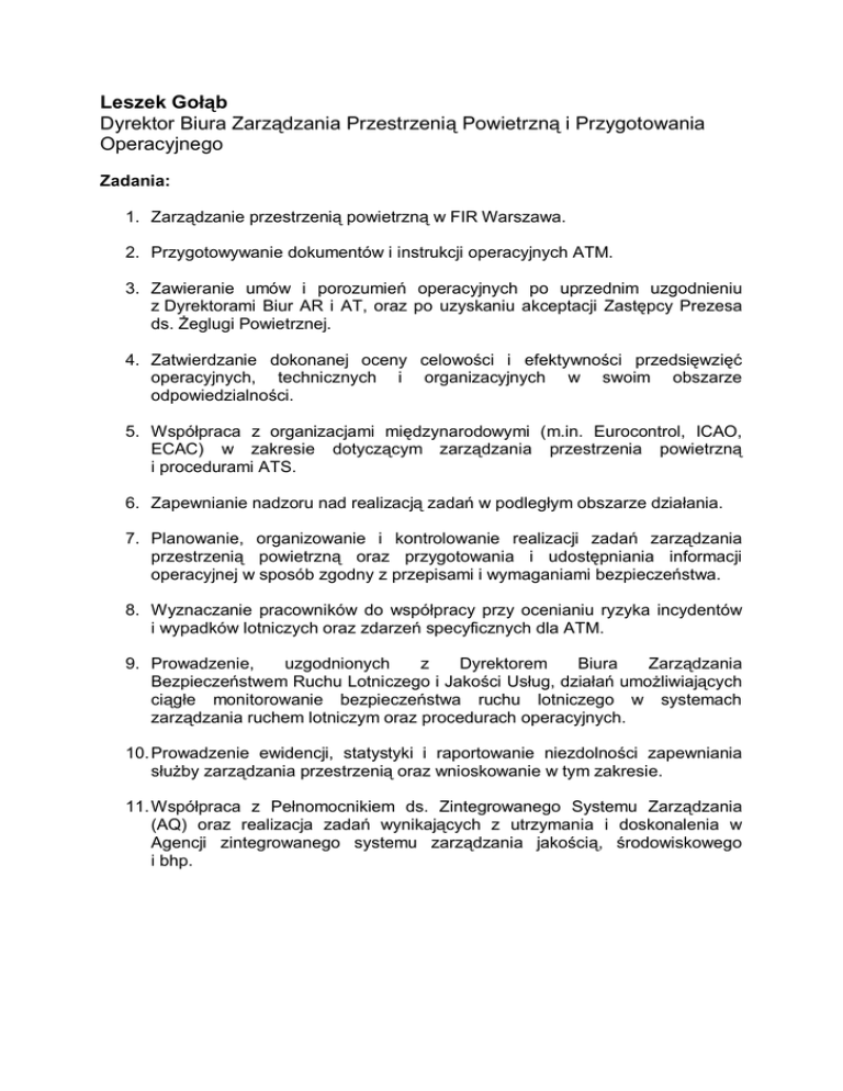 Leszek Go b Dyrektor Biura Zarz dzania Przestrzeni Powietrzn i Przygotowania Operacyjnego Zadania: 1. Zarz dzanie przestrzeni powietrzn w FIR Warszawa. 2. Przygotowywanie dokumentów i instrukcji operacyjnych ATM. 3. Zawieranie umów i porozumie operacyjnych po uprzednim uzgodnieniu z Dyrektorami Biur AR i AT, oraz po uzyskaniu akceptacji Zast pcy Prezesa ds. eglugi Powietrznej. 4. Zatwierdzanie dokonanej oceny celowo ci i efektywno ci przedsi wzi operacyjnych, technicznych i organizacyjnych w swoim obszarze odpowiedzialno ci. 5. Wspó praca z organizacjami mi dzynarodowymi (m.in. Eurocontrol, ICAO, ECAC) w zakresie dotycz cym zarz dzania przestrzenia powietrzn i procedurami ATS. 6. Zapewnianie nadzoru nad realizacj zada w podleg ym obszarze dzia ania. 7. Planowanie, organizowanie i kontrolowanie realizacji zada zarz dzania przestrzeni powietrzn oraz przygotowania i udost pniania informacji operacyjnej w sposób zgodny z przepisami i wymaganiami bezpiecze stwa. 8. Wyznaczanie pracowników do wspó pracy przy ocenianiu ryzyka incydentów i wypadków lotniczych oraz zdarze specyficznych dla ATM. 9. Prowadzenie, uzgodnionych z Dyrektorem Biura Zarz dzania Bezpiecze stwem Ruchu Lotniczego i Jako ci Us ug, dzia umo liwiaj cych ci e monitorowanie bezpiecze stwa ruchu lotniczego w systemach zarz dzania ruchem lotniczym oraz procedurach operacyjnych. 10. Prowadzenie ewidencji, statystyki i raportowanie niezdolno ci zapewniania by zarz dzania przestrzeni oraz wnioskowanie w tym zakresie. 11. Wspó praca z Pe nomocnikiem ds. Zintegrowanego Systemu Zarz dzania (AQ) oraz realizacja zada wynikaj cych z utrzymania i doskonalenia w Agencji zintegrowanego systemu zarz dzania jako ci , rodowiskowego i bhp.