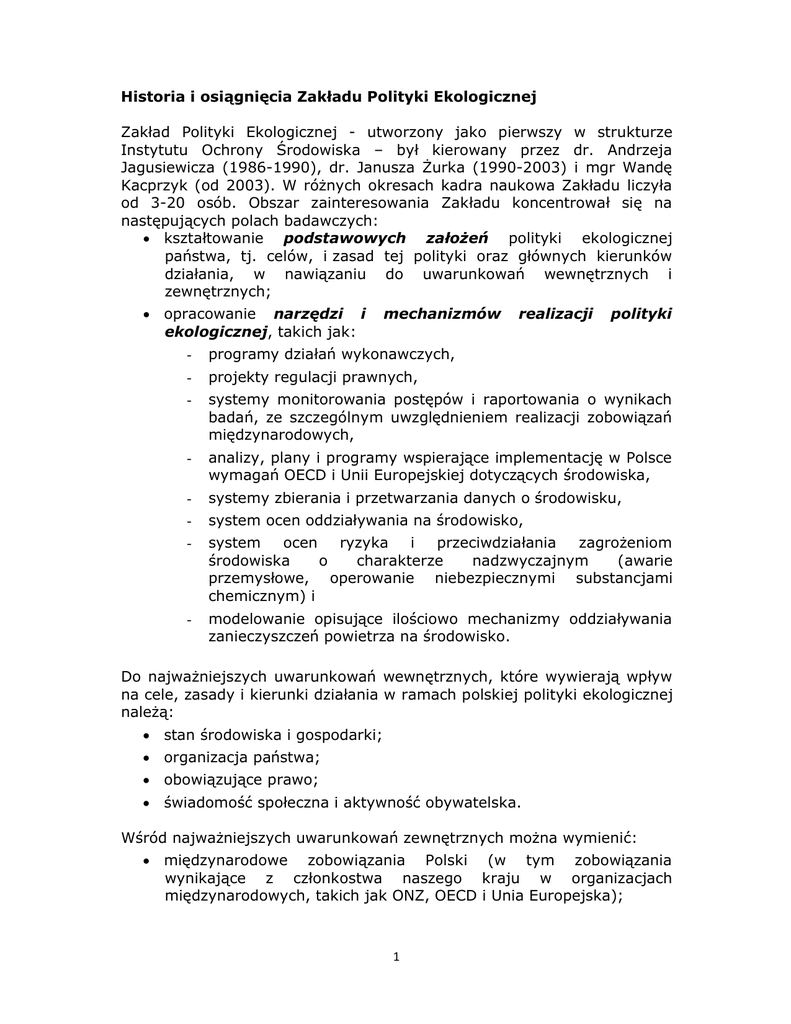 Historia i osiągnięcia Zakładu Polityki Ekologicznej Zakład Polityki Ekologicznej - utworzony jako pierwszy w strukturze Instytutu Ochrony Środowiska – był kierowany przez dr. Andrzeja Jagusiewicza (1986-1990), dr. Janusza Żurka (1990-2003) i mgr Wandę Kacprzyk (od 2003). W różnych okresach kadra naukowa Zakładu liczyła od 3-20 osób. Obszar zainteresowania Zakładu koncentrował się na następujących polach badawczych: • kształtowanie podstawowych założeń polityki ekologicznej państwa, tj. celów, i zasad tej polityki oraz głównych kierunków działania, w nawiązaniu do uwarunkowań wewnętrznych i zewnętrznych; • opracowanie narzędzi i ekologicznej, takich jak: mechanizmów realizacji polityki - programy działań wykonawczych, - projekty regulacji prawnych, - systemy monitorowania postępów i raportowania o wynikach badań, ze szczególnym uwzględnieniem realizacji zobowiązań międzynarodowych, - analizy, plany i programy wspierające implementację w Polsce wymagań OECD i Unii Europejskiej dotyczących środowiska, - systemy zbierania i przetwarzania danych o środowisku, - system ocen oddziaływania na środowisko, - system ocen ryzyka i przeciwdziałania zagrożeniom środowiska o charakterze nadzwyczajnym (awarie przemysłowe, operowanie niebezpiecznymi substancjami chemicznym) i - modelowanie opisujące ilościowo mechanizmy oddziaływania zanieczyszczeń powietrza na środowisko. Do najważniejszych uwarunkowań wewnętrznych, które wywierają wpływ na cele, zasady i kierunki działania w ramach polskiej polityki ekologicznej należą: • stan środowiska i gospodarki; • organizacja państwa; • obowiązujące prawo; • świadomość społeczna i aktywność obywatelska. Wśród najważniejszych uwarunkowań zewnętrznych można wymienić: • międzynarodowe zobowiązania Polski (w tym zobowiązania wynikające z członkostwa naszego kraju w organizacjach międzynarodowych, takich jak ONZ, OECD i Unia Europejska); 1 • aktualne trendy w polityce międzynarodowej i gospodarce światowej (np. takie jak wzrost znaczenia bezpieczeństwa energetycznego i ekologicznego, globalizacja gospodarcza i zwiększająca się swoboda wymiany handlowej); • regionalne i globalne tendencje w zakresie stanu środowiska. Zarówno w obszarze podstawowych założeń polskiej polityki ekologicznej, jak i w obszarze mechanizmów wspierających jej praktyczną realizację, Zakład może się pochwalić znaczącymi osiągnięciami, które przynamniej w części, biorąc pod uwagę czas, w którym osiągnięcia te miały miejsce, można uznać za dokonania o cechach innowacyjnych i pionierskich. W obszarze podstawowych założeń polityki ekologicznej, pierwszym spośród takich innowacyjnych projektów badawczych, w którym Zakład brał udział jako bezpośredni wykonawca i jednocześnie koordynator prac, był projekt „Narodowego programu ochrony środowiska przyrodniczego do 2010 roku”, opracowany w 1988 r. przez zespół pracowników Instytutu Ochrony Środowiska oraz Ministerstwa Ochrony Środowiska i Zasobów Naturalnych. Na wyjątkowość tego programu złożyło się kilka elementów: • był to pierwszy program działań na rzecz środowiska w Polsce, któremu nadano tak wysoką, ”narodową” rangę (w ślad za czym dysponował on np. pokaźnym budżetem, a w jego przygotowanie było zaangażowanych ponad 40 wiodących placówek naukowobadawczych i biur projektów zajmujących się problematyką środowiskową w skali kraju; powstało ponad 200 opracowań studialnym i programowych); • zastosowano nowoczesne, kompleksowe podejście do środowiska o 20-letnim horyzoncie czasowym. Program obejmował wszystkie najważniejsze komponenty (powietrze, wody powierzchniowe i podziemne, gleby i powierzchnię ziemi, zasoby kopalin, lasy oraz świat roślinny i zwierzęcy). Był on skierowany nie tylko do wąskiego grona decydentów i ludzi z tzw. branży, ale stał się przedmiotem szerszej, społecznej dyskusji, doceniając znaczenie, jakie dla skuteczności działań na rzecz środowiska ma edukacja społeczeństwa i społeczna świadomość ekologiczna. Wyrazem takiego podejścia było nie tylko uwzględnienie tych zagadnień w samej treści programu, ale także sposób ich prezentacji (z szerokim wykorzystaniem różnych form prezentacji graficznej i języka nietechnicznego) oraz przygotowanie w ramach projektu specjalnych zeszytów popularyzujących program. Program utorował drogę kolejnym przedsięwzięciom tego typu, realizowanym przez Zakład w nowych warunkach ustrojowych po roku 1989. W realiach gospodarki rynkowej były to już przedsięwzięcia o mniejszym rozmachu, ale konsekwentnie była w nich stosowana formuła kompleksowego, międzysektorowego podejścia do środowiska. Angażowały one interdyscyplinarne zespoły ekspertów z wielu znaczących w skali kraju placówek badawczych, a także doceniały znaczenie, jakie dla 2 skutecznej realizacji polityki ekologicznej państwa ma podnoszenie wiedzy i świadomości ekologicznej społeczeństwa. W nowych uwarunkowaniach, w których polska gospodarka nie była już gospodarką centralnie planowaną, aspekty te zostały dodatkowo uzupełnione o kolejne, istotne elementy, takie jak mechanizmy ekonomiczne i rynkowe oraz nowelizacja obowiązującego prawa. Wśród tych przedsięwzięć trzeba wymienić przede wszystkim: • dokument programowy o nazwie „Polityka ekologiczna państwa” (1990), który uzyskał aprobatę Rady Ministrów, a w 1991 r. Sejmu i Senatu; • „Plan realizacyjny celów krótkoterminowych polityki ekologicznej państwa na lata 1991-1993” (1991), który był uszczegółowieniem pierwszej polityki ekologicznej państwa powstałej po przemianach 1989 roku i nawiązującej do ustaleń „podstolika ekologicznego” w ramach rozmów Okrągłego Stołu; • „Nowelizację polityki ekologicznej państwa – projekt II Polityki ekologicznej państwa” (2000), uznawanej jak