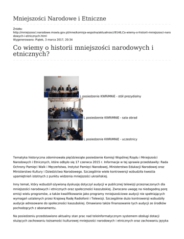 Mniejszości Narodowe i Etniczne Źródło: http://mniejszosci.narodowe.mswia.gov.pl/mne/komisja-wspolna/aktualnosci/9146,Co-wiemy-o-historii-mniejszosci-naro dowych-i-etnicznych.html Wygenerowano: Piątek, 3 marca 2017, 20:34 Co wiemy o historii mniejszości narodowych i etnicznych? L posiedzenie KWRiMNiE - stół prezydialny L posiedzenie KWRiMNiE - sala obrad L posiedzenie KWRiMNiE - uczestnicy Tematyka historyczna zdominowała pięćdziesiąte posiedzenie Komisji Wspólnej Rządu i Mniejszości Narodowych i Etnicznych, które odbyło się 17 czerwca 2015 r. Informacje w tej sprawie przedstawiły: Rada Ochrony Pamięci Walk i Męczeństwa, Instytut Pamięci Narodowej, Ministerstwo Edukacji Narodowej oraz Ministerstwo Kultury i Dziedzictwa Narodowego. Szczególnie wiele kontrowersji wzbudziła kwestia upamiętnień istotnych z punktu widzenia mniejszości ukraińskiej. Inny temat, który wzbudził ożywioną dyskusję dotyczył audycji w publicznej telewizji przeznaczonych dla mniejszości narodowych i etnicznych oraz społeczności kaszubskiej. Zwracano uwagę na niedogodną porę emisji wielu programów, a także kwalifikowanie jako programy mniejszościowe audycji nie spełniających wymagań ustalonych przez Krajową Radę Radiofonii i Telewizji. Szczególnie dużo kontrowersji wzbudziły audycje adresowane do społeczności kaszubskiej. Omawiano także finansowanie tych audycji ze środków pochodzących z abonamentu. Na posiedzeniu przedstawiono aktualny stan prac nad teleinformatycznym systemem obsługi dotacji służących zachowaniu tożsamości kulturowej mniejszości narodowych i etnicznych oraz zachowaniu języka regionalnego (ESOM 2). Z uwagi na powiązanie ESOM 2 z elektroniczną Platformą Usług Administracji Publicznej (ePUAP), a także obecny stan prac nad jej przebudową, konieczne było formalne przesunięcie terminu uruchomienia systemu ESOM 2 na 1 stycznia 2016 r. Tym samym wnioski na przyszły rok składane będą w dotychczasowej formie. Zaprezentowano także wyniki prac grupy roboczej do spraw podręczników. Grupa robocza spotkała się czterokrotnie: 4 lipca 2014 r., 17 października 2014 r., 16 stycznia 2015 r. i 21 maja 2015 r. Ustalono, że podstawową metodą uzupełnienia brakujących podręczników będzie, tak jak do tej pory, wydawanie ich w oparciu o art. 13 ust. 5 ustawy o systemie oświaty. W oparciu o te przepisy podręczniki są opracowywane przez autorów wywodzących się ze środowisk mniejszościowych, a następnie zakupywane przez Ministerstwo Edukacji Narodowej i bezpłatnie przekazywane uczniom. Uzupełnieniem może być tryb przewidziany w art. 22 c ustawy o systemie oświaty, w oparciu o który Ministerstwo Edukacji Narodowej może ogłosić konkurs na wydanie podręczników. Efektem prac grupy roboczej jest swoista „mapa drogowa” wydawania podręczników na najbliższe lata. Jej zrealizowanie powinno doprowadzić do sytuacji, w której za kilka lat wszyscy uczniowie należący do mniejszości będą korzystali z podręczników do swojego języka ojczystego, własnej historii i kultury oraz geografii. Posiedzenie prowadzili współprzewodniczący: Sekretarz Stanu w Ministerstwie Administracji i Cyfryzacji Pan Stanisław Huskowski i reprezentujący stronę mniejszościową Pan Rafał Bartek. Wstecz Drukuj Generuj PDF Powiadom znajomego
