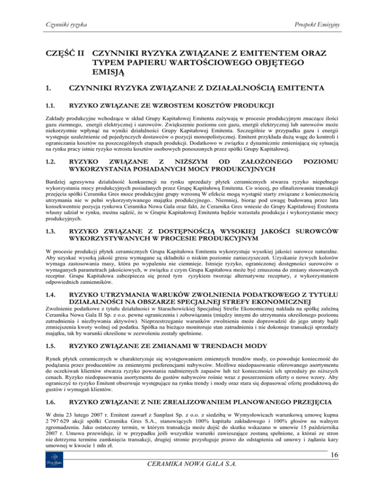 Czynniki ryzyka Prospekt Emisyjny CZĘŚĆ II CZYNNIKI RYZYKA ZWIĄZANE Z EMITENTEM ORAZ TYPEM PAPIERU WARTOŚCIOWEGO OBJĘTEGO EMISJĄ 1. CZYNNIKI RYZYKA ZWIĄZANE Z DZIAŁALNOŚCIĄ EMITENTA 1.1. RYZYKO ZWIĄZANE ZE WZROSTEM KOSZTÓW PRODUKCJI Zakłady produkcyjne wchodzące w skład Grupy Kapitałowej Emitenta zużywają w procesie produkcyjnym znaczące ilości gazu ziemnego, energii elektrycznej i surowców. Zwiększenie poziomu cen gazu, energii elektrycznej lub surowców może niekorzystnie wpłynąć na wyniki działalności Grupy Kapitałowej Emitenta. Szczególnie w przypadku gazu i energii występuje uzależnienie od pojedynczych dostawców o pozycji monopolistycznej. Emitent przykłada dużą wagę do kontroli i ograniczania kosztów na poszczególnych etapach produkcji. Dodatkowo w związku z dynamicznie zmieniającą się sytuacją na rynku pracy istnie ryzyko wzrostu kosztów osobowych ponoszonych przez spółki Grupy Kapitałowej. 1.2. RYZYKO ZWIĄZANE Z NIŻSZYM OD ZAŁOŻONEGO WYKORZYSTANIA POSIADANYCH MOCY PRODUKCYJNYCH POZIOMU Bardziej agresywna działalność konkurencji na rynku sprzedaży płytek ceramicznych stwarza ryzyko niepełnego wykorzystania mocy produkcyjnych posiadanych przez Grupę Kapitałową Emitenta. Co wiecej, po sfinalizowaniu transakcji przejęcia spółki Ceramika Gres moce produkcyjne grupy wzrosną W efekcie mogą wystąpić starty związane z koniecznością utrzymania nie w pełni wykorzystywanego majątku produkcyjnego.. Niemniej, biorąc pod uwagę budowaną przez lata konsekwentnie pozycja rynkowa Ceramika Nowa Gala oraz fakt, że Ceramika Gres wniesie do Grupy Kapitałowej Emitenta własny udział w rynku, można sądzić, że w Grupie Kapitałowej Emitenta będzie wzrastała produkcja i wykorzystanie mocy produkcyjnych. 1.3. RYZYKO ZWIĄZANE Z DOSTĘPNOŚCIĄ WYSOKIEJ JAKOŚCI SUROWCÓW WYKORZYSTYWANYCH W PROCESIE PRODUKCYJNYM W procesie produkcji płytek ceramicznych Grupa Kapitałowa Emitenta wykorzystuje wysokiej jakości surowce naturalne. Aby uzyskać wysoką jakość gresu wymagane są składniki o niskim poziomie zanieczyszczeń. Uzyskanie żywych kolorów wymaga zastosowania masy, która po wypaleniu nie ciemnieje. Istnieje ryzyko, ograniczonej dostępności surowców o wymaganych parametrach jakościowych, w związku z czym Grupa Kapitałowa może być zmuszona do zmiany stosowanych receptur. Grupa Kapitałowa zabezpiecza się przed tym ryzykiem tworząc alternatywne receptury, z wykorzystaniem odpowiednich zamienników. 1.4. RYZYKO UTRZYMANIA WARUKÓW ZWOLNIENIA PODATKOWEGO Z TYTUŁU DZIAŁALNOŚCI NA OBSZARZE SPECJALNEJ STREFY EKONOMICZNEJ Zwolnienie podatkowe z tytułu działalności w Starachowickiej Specjalnej Strefie Ekonomicznej nakłada na spółkę zależną Ceramika Nowa Gala II Sp. z o.o. pewne ograniczenia i zobowiązania (między innymi do utrzymania określonego poziomu zatrudnienia i niezbywania aktywów). Nieprzestrzeganie warunków zwolnienia może doprowadzić do jego utraty bądź zmniejszenia kwoty wolnej od podatku. Spółka na bieżąco monitoruje stan zatrudnienia i nie dokonuje transakcji sprzedaży majątku, tak by warunki określone w zezwoleniu zostały spełnione. 1.5. RYZYKO ZWIĄZANE ZE ZMIANAMI W TRENDACH MODY Rynek płytek ceramicznych w charakteryzuje się występowaniem zmiennych trendów mody, co powoduje konieczność do podążania przez producentów za zmiennymi preferencjami nabywców. Możliwe niedopasowanie oferowanego asortymentu do oczekiwań klientów stwarza ryzyko powstania nadmiernych zapasów lub też konieczności ich sprzedaży po niższych cenach. Ryzyko niedopasowania asortymentu do gustów nabywców rośnie wraz z poszerzeniem oferty o nowe wzory. Aby ograniczyć to ryzyko Emitent obserwuje występujące na rynku trendy i mody oraz stara się dopasować ofertę produktową do gustów i wymagań klientów. 1.6. RYZYKO ZWIĄZANE Z NIE ZREALIZOWANIEM PLANOWANEGO PRZEJĘCIA W dniu 23 lutego 2007 r. Emitent zawarł z Sanplast Sp. z o.o. z siedzibą w Wymysłowicach warunkową umowę kupna 2 797 629 akcji spółki Ceramika Gres S.A., stanowiących 100% kapitału zakładowego i 100% głosów na walnym zgromadzeniu. Jako ostateczny termin, w którym transakcja może dojść do skutku wskazano w umowie 15 października 2007 r. Umowa przewiduje, iż w przypadku jeśli wszystkie warunki zawieszające zostaną spełnione, a któraś ze stron nie dotrzyma terminu zamknięcia transakcji, drugiej stronie przysługuje prawo do odstąpienia od umowy i żądania kary umownej w kwocie 1 mln zł. 16 CERAMIKA NOWA GALA S.A. Czynniki ryzyka Prospekt Emisyjny Umowa o zakup akcji Ceramika Gres zawiera warunki zawieszające wśród których jest dojście do skutku emisji akcji serii U. Jeśli mimo dojścia do skutku emisji nie zostanie sfinalizowana transakcja zakupu akcji Emitent będzie poszukiwał innych podmiotów przejęcia z branży płytek ceramicznych lub innych materiałów budowlanych. 1.7. RYZYKO ZWIĄZANE Z NIŻSZYMI OD ZAŁOŻONYCH KORZYŚCI Z PRZEJĘCIA Emitent zakłada osiągnięcie efektów synergii obniżających jednostkowe koszty produkcji, dzięki przejęciu kontroli nad spółką Ceramika Gres S.A. Ponadto Emitent zamierza osiągnąć korzyści z połączenia kanałów dystrybucyjnych przejmowanej spółki i własnych – głównie hurtownie i markety budowlane – oraz wprowadzenie produktów przejmowanej spółki do oferty Grupy Kapitałowej Emitenta, a także udział w przyszłych zyskach Ceramika Gres SA Emitent nie może wykluczyć, iż Grupa Kapitałowa Ceramika Nowa Gala nie osiągnie zakładanych korzyści lub też będą one mniejsze od planowanych lub wystąpią w późniejszym okresie. 1.8. RYZYKO UJAWNIENIA SIĘ ZOBOWIĄZAŃ i STRAT W CERAMIKA GRES S.A. Spółka, której akcje zamierza nabyć Emitent nie znajdowała się nigdy do tej pory pod zarządem Emitenta wobec czego, po przejęciu nad nią kontroli istnieje ryzyko ujawnienia się nie znanych wcześniej zobowiąz