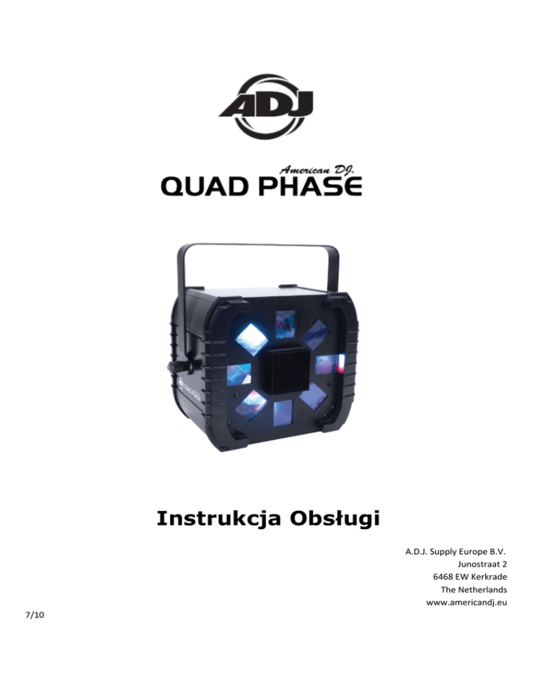 Instrukcja Obsługi A.D.J. Supply Europe B.V. Junostraat 2 6468 EW Kerkrade The Netherlands www.americandj.eu 7/10 Spistreści WSTĘP ..................................................................................................................................................................................... 3 CHARAKTERYSTYKA ................................................................................................................................................................. 3 ŚRODKI BEZPIECZEŃSTWA ...................................................................................................................................................... 4 USTAWIENIA ........................................................................................................................................................................... 5 MENU SYSTEMU ..................................................................................................................................................................... 7 DZIAŁANIE ............................................................................................................................................................................... 9 KONTROLA UC3 ..................................................................................................................................................................... 10 CECHY DMX ........................................................................................................................................................................... 10 CZYSZCZENIE ......................................................................................................................................................................... 11 TROUBLE SHOOTING ............................................................................................................................................................. 11 SPECYFIKACJA ....................................................................................................................................................................... 12 ROHS – WAŻNY WKŁAD W OCHRONĘ ŚRODOWISKA .......................................................................................................... 13 WEEE – UTYLIZACJA ODPADÓW ELEKTRYCZNYCH I ELEKTRONICZNYCH.............................................................................. 14 NOTATKI ................................................................................................................................................................................ 15 A.D.J. Supply Europe B.V. – www.americandj.eu – Quad Phase Instrukcja Obsługi Str. 2 WSTĘP Wypakowanie: Dziękujemy za zakup urządzenia świetlnego Quad Phase™ firmy American DJ®. Każdy egzemplarz Quad Phase™ został gruntownie przetestowany, co jest gwarancją jego prawidłowego funkcjonowania. Przed rozpakowaniem należy sprawdzić czy opakowanie nie zostało uszkodzone w czasie transportu. W razie stwierdzenia uszkodzenia opakowania, dokładnie sprawdź, czy nie nastąpiło uszkodzenie sprzętu oraz upewnij się, że wszystkie części konieczne do obsługi urządzenia przybyły w stanie nienaruszonym. W razie stwierdzenia usterek lub braku części, należy skontaktować się z bezpłatnym biurem obsługi klienta w celu uzyskania dalszych instrukcji. Prosimy o taki kontakt przed podjęciem decyzji o zwrocie urządzenia do sprzedawcy. Wstęp: Quad Phase™ jest inteligentnym czterokanałowym urządzeniem świetlnym kompatybilnym z systemem DMX. Pracuje ono samodzielnie (Stand Alone) lub w konfiguracji Master/Slave. Quad Phase™ posiada dwa tryby operacyjne: tryb reakcji na dźwięk (Sound Active Mode) oraz tryb DMX. Może ono być używane samodzielnie (Stand Alone) lub w konfiguracji Master/Slave. W celu osiągnięcia lepszych efektów poprzez poprawienie widoczności projektowanej wiązki światła, należy użyć maszyny mgielnej lub dymu do efektów specjalnych. Obsługa klienta: W razie jakichkolwiek problemów, prosimy o kontakt z zaufanym punktem sprzedaży American Audio. Istnieje również możliwość bezpośredniego kontaktu z nami. Można to zrobić poprzez naszą stronę internetową www.americandj.eu oraz pisząc na adres: [email protected] Ostrzeżenie! Aby zapobiec lub zmniejszyć ryzyko porażenia prądem lub pożaru, nie włączaj urządzenia w warunkach deszczowych lub przy podwyższonej wilgotności powietrza. Ostrzeżenie! Urządzenie może poważnie uszkodzić wzrok. Nie należy patrzeć bezpośrednio na źródło światła. WSKAZÓWKI OGÓLNE Aby w pełni wykorzystać możliwości urządzenia, prosimy o przeczytanie instrukcji obsługi i zapoznanie się z podstawowymi funkcjami urządzenia. Instrukcja zawiera ważne informacje dotyczące bezpieczeństwa obsługi oraz sposobu konserwacji urządzenia. Prosimy o zachowanie instrukcji obsługi w celu ponownego użycia. CHARAKTERYSTYKA • Protokół DMX-512 (4 Kanały DMX) • RGBW (Czerwony, Zielony, Niebieski i Biały) • Jasna Lampa LED o mocy 10 Watt • 2 Tryby Operacyjne – Tryb Reakcji na Dźwięk (Sound Active) oraz Tryb DMX • Mikrofon Wewnętrzny • Wyświetlacz cyfrowy • Praca z konsolą UC3 (sprzedawana osobno) • Szeregowe Połączenie urządzeń UWAGI DOTYCZĄCE OBSŁUGI Uwaga! Urządzenie nie zawiera żadnych elementów przeznaczonych do serwisowania przez użytkownika. Gwarancja na urządzenie traci ważność, jeśli użytkownik zdecyduje się na samowolną naprawę którejkolwiek części. Jeżeli jakaś część wymaga naprawy to należy się skontaktować z American DJ®. Nie należy dotykać urządzenia gołymi rękami w czasie jego pracy, ponieważ obudowa urządzenia może nagrzać się do bardzo wysokiej temperatury. Firma American DJ® nie ponosi żadnej odpowiedzialności za usterki powstałe w wyniku nie zapoznania się z treścią niniejszej instrukcji lub z powodu nieautoryzowanej modyfik