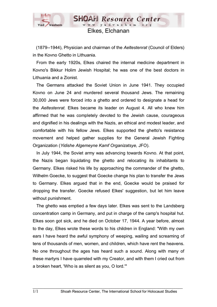 Elkes, Elchanan (1879--1944), Physician and chairman of the Aeltestenrat (Council of Elders) in the Kovno Ghetto in Lithuania. From the early 1920s, Elkes chaired the internal medicine department in Kovno's Bikkur Holim Jewish Hospital; he was one of the best doctors in Lithuania and a Zionist. The Germans attacked the Soviet Union in June 1941. They occupied Kovno on June 24 and murdered several thousand Jews. The remaining 30,000 Jews were forced into a ghetto and ordered to designate a head for the Aeltestenrat. Elkes became its leader on August 4. All who knew him affirmed that he was completely devoted to the Jewish cause, courageous and dignified in his dealings with the Nazis, an ethical and modest leader, and comfortable with his fellow Jews. Elkes supported the ghetto's resistance movement and helped gather supplies for the General Jewish Fighting Organization (Yidishe Algemeyne Kamf Organizatsye, JFO). In July 1944, the Soviet army was advancing towards Kovno. At that point, the Nazis began liquidating the ghetto and relocating its inhabitants to Germany. Elkes risked his life by approaching the commander of the ghetto, Wilhelm Goecke, to suggest that Goecke change his plan to transfer the Jews to Germany. Elkes argued that in the end, Goecke would be praised for dropping the transfer. Goecke refused Elkes' suggestion, but let him leave without punishment. The ghetto was emptied a few days later. Elkes was sent to the Landsberg concentration camp in Germany, and put in charge of the camp's hospital hut. Elkes soon got sick, and he died on October 17, 1944. A year before, almost to the day, Elkes wrote these words to his children in England: "With my own ears I have heard the awful symphony of weeping, wailing and screaming of tens of thousands of men, women, and children, which have rent the heavens. No one throughout the ages has heard such a sound. Along with many of these martyrs I have quarreled with my Creator, and with them I cried out from a broken heart, 'Who is as silent as you, O lord.'" __________________________________________________________________________ Shoah Resource Center, The International School for Holocaust Studies 1/1