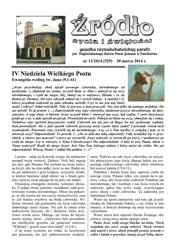 gazetka rzymskokatolickiej parafii pw. Najświętszego Serca Pana Jezusa w Raciborzu nr 13/2014 (529) 30 marca 2014 r. IV Niedziela Wielkiego Postu Ewangelia według św. Jana (9,1-41) „Jezus przechodząc obok ujrzał pewnego człowieka, niewidomego od urodzenia. (...)Splunął na ziemię, uczynił błoto ze śliny i nałoŜył je na oczy niewidomego, i rzekł do niego: Idź, obmyj się w sadzawce Siloam - co się tłumaczy: Posłany. On więc odszedł, obmył się i wrócił widząc. A sąsiedzi i ci, którzy przedtem widywali go jako Ŝebraka, mówili: CzyŜ to nie jest ten, który siedzi i Ŝebrze? Jedni twierdzili: Tak, to jest ten, a inni przeczyli: Nie, jest tylko do tamtego podobny. On zaś mówił: To ja jestem. (…) Zaprowadzili więc tego człowieka, niedawno jeszcze niewidomego, do faryzeuszów. A tego dnia, w którym Jezus uczynił błoto i otworzył mu oczy, był szabat. I znów faryzeusze pytali go o to, w jaki sposób przejrzał. Powiedział do nich: PołoŜył mi błoto na oczy, obmyłem się i widzę. Niektórzy więc spośród faryzeuszów rzekli: Człowiek ten nie jest od Boga, bo nie zachowuje szabatu. Inni powiedzieli: Ale w jaki sposób człowiek grzeszny moŜe czynić takie znaki? I powstało wśród nich rozdwojenie. Ponownie więc zwrócili się do niewidomego: A ty, co o Nim myślisz w związku z tym, Ŝe ci otworzył oczy? Odpowiedział: To prorok. (…)Na to dali mu taką odpowiedź: Cały urodziłeś się w grzechach, a śmiesz nas pouczać? I precz go wyrzucili. Jezus usłyszał, Ŝe wyrzucili go precz, i spotkawszy go rzekł do niego: Czy ty wierzysz w Syna Człowieczego? On odpowiedział: A któŜ to jest, Panie, abym w Niego uwierzył? Rzekł do niego Jezus: Jest Nim Ten, którego widzisz i który mówi do ciebie. On zaś odpowiedział: Wierzę, Panie! i oddał Mu pokłon. (…)” Laetare – raduj się Kościele święty, bo niebawem nastąpił twoja wolność. Zniknie Twój ból, zagoją się rany, gdy Mesjasz Pan weźmie na swoje ramiona krzyŜ, aby na nim oddać Ŝycie za nas. Raduj się, bo juŜ niebawem z góry Golgoty, wytryśnie źródło, w którym będziesz mógł obmyć się z brudu grzechu i ujrzysz świat jakiego do tej pory nie znałeś. Dzisiejszą ewangelię moŜemy rozumieć dwojako. Z jednej strony jesteśmy świadkami cudu przywrócenia wzroku niewidomego. Obraz ten pokazuje, Ŝe dla Jezusa nie ma rzeczy niemoŜliwych, oraz Ŝe jest bardzo wraŜliwy na biedę człowieka. Widzimy równieŜ, jak przemienia się Ŝycie człowieka dotkniętego przez Jezusa. Nie jest to zatem tylko uzdrowienie fizyczne, ale i duchowe, które przywraca wzrok serca. Dlatego, teŜ Jezus do faryzeuszów dzisiaj mówi: „Gdybyście byli niewidomi, nie mielibyście grzechu, ale poniewaŜ mówicie: "Widzimy", grzech wasz trwa nadal” (J 9,41). Z tej sceny wyraźnie teŜ widać, Ŝe nawrócenie jest procesem, nie jest jednorazowym wydarze- niem. Wpływa na całe Ŝycie człowieka, na wszystkie płaszczyzny jego Ŝycia, dlatego ludzie nie rozpoznają uzdrowionego człowieka, który niedawno był jeszcze kaleką (J 9,8-11). Podobnie i dzisiaj Jezus chce zaprosić ciebie do nowego Ŝycia. Pytanie tylko, czy jestem na to gotowy i chcę, aby Jezus mnie uzdrowił. Podobnie jak niewidomego, tak i kaŜdego z nas Jezus wysyła do sadzawki, gdzie bije Ŝywa woda, oczyszczająca serce, duszę i ciało człowieka. Tą sadzawką jest Sakrament Pokuty. Warto się zatem zastanowić nad tym, jak ja podchodzę do Sakramentu Pokuty, i czy widzę w nim miejsce, w którym dokonuje się moje oczyszczenie i przemiana. Warto zatem dziś zaprosić Ducha Świętego, aby oświeci swoją mocą mroki mojego serca. Panie Jezu, ześlij swego Ducha, na mnie. Niech wypełnia me serce swoją miłości. Niech oświeci mój umysł i serce, abym potrafił poznać prawdę o sobie i umiał w prawdzie stanąć przed Tobą Amen 2 Źródło - gazetka Poniedziałek – 31 marca 2014 J 4,43-54 630 Za † męŜa Zbigniewa Korpaczewskiego w 1. rocznicę śmierci 700 Za † Marię, †† dziadków z obu stron i wszystkich †† z rodziny Wolnik i Paskuda 1800 1. Za † mamę Marię Doruch w 4. rocznicę śmierci i wszystkich †† z rodziny 2. Msza Święta zbiorowa za zmarłych: za † Annę Kaniuch (od współlokatorów z ulicy Katowickiej 15), za † Urszulę Pietrzykowską (w 30. dzień), za † Juliannę Węgrzyn (w 30. dzień), za † Jadwigę Urbasik (w 30. dzień), za †† siostry Gizelę Niemiec i Irenę Wycisk, †† rodziców Jana i Annę Reichel oraz za †† z pokrewieństwa, za † ojca Karola Łamaza, za † ojca Eugeniusza Bielawskiego w 1. rocznicę śmierci, za † Julię Kwok (w 30. dzień), za † Jana Cichonia, za † Aleksandrę Grochowską-Sztuka (w 30. dzień), za † Michała Hunia (w 30. dzień), za † mamę Emilię Głuszek, †† dziadków Józefa i Helenę Ciepacz, za † męŜa i ojca Tadeusza Ciołek w rocznicę śmierci, za † dziadka Manfreda Czekała (od wnuka Adama i wnuczki Alicji), za † Wiktorię Janosz z okazji 80. rocznicy urodzin, † męŜa Henryka i †† braci, za †† Jana i Janinę Wysokińskich, za †† braci Stanisława (w 30. dzień), Antoniego w 1. rocznicę śmierci, rodzeństwo, rodziców z obu stron i dusze w czyśćcu cierpiące, za †† Urszulę Dąbek, męŜa Henryka i †† z pokrewieństwa Wtorek – 1 kwietnia 2014 J 5,1-3.5-16 630 Do Miłosierdzia BoŜego za † Witolda Mokrzyckiego w 50. rocznicę śmierci 800 W języku niemieckim: Für lebende und verstorbene Missionare 900 Do Miłosierdzia BoŜego w intencji Aliny z okazji urodzin z podziękowaniem za otrzymane łaski, z prośbą o dalsza BoŜą opiekę 1800 1. Z okazji 80. rocznicy urodzin Józefa z podziękowaniem za otrzymane łaski, z prośbą o dalsze BoŜe błogosławieństwo i zdrowie na dalsze lata Ŝycia oraz dla całej rodziny 2. Za † Julię Kwok oraz †† sąsiadów (od współlokatorów z ulicy Polnej 10) Środa – 2 kwietnia 2014 J 5,17-30 630 Do Miłosierd