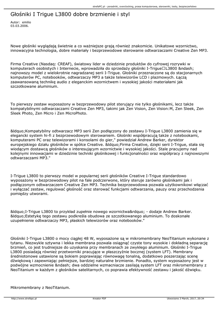strefaPC.pl - poradniki, overclocking, prasa komputerowa, sterowniki, testy, bezpieczeństwo Głośniki I Trigue L3800 dobre brzmienie i styl Autor: emilio 03.03.2006. Nowe głośniki wyglądają świetnie a co ważniejsze grają również znakomicie. Unikatowe wzornictwo, innowacyjna technologia, dobre materiały i bezprzewodowe sterowanie odtwarzaczami Creative Zen MP3. Firma Creative (Nasdaq: CREAF), światowy lider w dziedzinie produktów do cyfrowej rozrywki w komputerach osobistych i Internecie, wprowadziła do sprzedaży głośniki I-Trigue® L3800 – najnowszy model z wielokrotnie nagradzanej serii I-Trigue. Głośniki przeznaczone są do stacjonarnych komputerów PC, notebooków, odtwarzaczy MP3 a także telewizorów LCD i plazmowych. Łączą zaawansowaną technikę audio z eleganckim wzornictwem i wysokiej jakości materiałami jak szczotkowane aluminium. To pierwszy zestaw wyposażony w bezprzewodowy pilot sterujący nie tylko głośnikami, lecz także kompatybilnymi odtwarzaczami Creative Zen MP3, takimi jak Zen Vision, Zen Vision:M, Zen Sleek, Zen Sleek Photo, Zen Micro i Zen MicroPhoto. “Kompatybilny odtwarzacz MP3 serii Zen podłączony do zestawu I-Trigue L3800 zamienia się w elegancki system hi-fi z bezprzewodowym sterowaniem. Głośniki współpracują także z notebookami, komputerami PC oraz telewizorami i konsolami do gier," powiedział Andrew Barker, dyrektor europejskiego działu głośników w spółce Creative. “Firma Creative, dzięki serii I-Trigue, stała się wiodącym dostawcą głośników o interesującym wzornictwie i wysokiej jakości. Stale pracujemy nad kolejnymi innowacjami w dziedzinie techniki głośnikowej i funkcjonalności oraz współpracy z najnowszymi odtwarzaczami MP3." I-Trigue L3800 to pierwszy model w popularnej serii głośników Creative I-Trigue standardowo wyposażony w bezprzewodowy pilot na fale podczerwone, który steruje zarówno głośnikami jak i podłączonym odtwarzaczem Creative Zen MP3. Technika bezprzewodowa pozwala użytkownikowi włączać i wyłączać zestaw, regulować głośność oraz sterować funkcjami odtwarzania, pauzy oraz przechodzenia pomiędzy utworami. “I-Trigue L3800 to przykład zupełnie nowego wzornictwa” - dodaje Andrew Barker. “Estetykę tego zestawu podkreśla obudowa ze szczotkowanego aluminium. To doskonałe uzupełnienie odtwarzaczy MP3, płaskich telewizorów oraz notebooków." Głośniki I-Trigue L3800 o mocy ciągłej 48 W, wyposażone są w mikromembrany NeoTitanium wykonane z tytanu. Niezwykle sztywna i lekka membrana pozwala osiągnąć czyste tony wysokie i dokładną separację brzmień, co jest trudniejsze do uzyskania przy membranach ze zwykłego aluminium. Głośniki I-Trigue L3800 posiadają również przetworniki pracujące w płaszczyźnie bocznej (system LFT). Membrany średniotonowe ustawione są bokiem poprawiając równowagę tonalną, dodatkowo poszerzając scenę dźwiękową i zapewniając pełniejsze, bardziej naturalne brzmienie. Ponadto, system wyposażony jest w podwójne wzmocnienie – dwa oddzielne wzmacniacze zasilają system LFT oraz mikromembrany z NeoTitanium w każdym z głośników satelitarnych, co poprawia efektywność zestawu i jakość dźwięku. Mikromembrany z NeoTitanium. http://www.strefapc.pl Kreator PDF Utworzono 3 March, 2017, 20:34 strefaPC.pl - poradniki, overclocking, prasa komputerowa, sterowniki, testy, bezpieczeństwo Mikromembrany z NeoTitanium wyjątkowo klarownie i precyzyjnie odwzorowują dźwięk. Są to delikatne konstrukcje z tytanu (metalu szlachetnego, wykorzystywanego w statkach kosmicznych), poruszane cewkami poruszającymi się w silnym polu wytwarzanym przez magnesy neodymowe i precyzyjnie dostrojone przez inżynierów dźwięku Creative. Wynikiem jest jakość dźwięku przewyższająca standardowe konstrukcje aluminiowe. Wszystkie głośniki hi-fi Creative I-Trigue wykonane są w tej technologii dla zapewniania najlepszej jakości odtwarzanej muzyki. Głośniki Creative I-Trigue L3800 dostępne są w Polsce w cenie 599 PLN brutto. Creative (Nasdaq: CREAF) to światowy lider w dziedzinie rozrywki cyfrowej dla komputerów osobistych i Internetu. Sławny dzięki kartom dźwiękowym Sound Blaster i zapoczątkowaniu rewolucji w multimediach, Creative rozwija cyfrową rozrywkę na platformie PC poprzez takie produkty, jak sławne na całym świecie osobiste odtwarzacze audio Zen i MuVo. Innowacyjny sprzęt, oryginalne technologie, aplikacje i usługi oferowane przez firmę Creative wykorzystują możliwości oferowane przez Internet i pozwalają klientom korzystać z najwyższej jakości cyfrowej rozrywki - o każdej porze i w każdym miejscu. Założona w 1981 r., firma Creative Technology ma swoją siedzibę w Singapurze. Firma Creative Labs Europe została założona w 1993 r., aby zyskać większy udział w rosnącym rynku europejskim. Jej siedziba oraz Europejskie Centrum Techniczne (EOTC) mieszczą się w Dublinie (Irlandia) i zapewniają sprawne, dostosowane do potrzeb rynku europejskiego zaopatrzenie. Zapewniają też wsparcie techniczne klienta wspomagając pracę biur sprzedaży krajach Beneluksu, Danii, Francji, Niemczech, Włoszech, Polsce, Portugalii, Hiszpanii, Szwecji i Wielkiej Brytanii. Europejski oddział firmy Creative zatrudnia obecnie około 400 pracowników. Żródło:studentnews.pl http://www.strefapc.pl Kreator PDF Utworzono 3 March, 2017, 20:34
