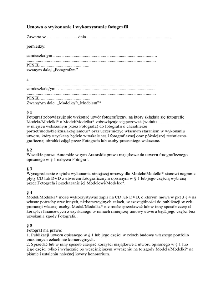 Umowa o wykonanie i wykorzystanie fotografii Zawarta w …....................... dnia .........................................................................., pomiędzy: ................................................................................................................... zamieszkałym ............................................................................................ ................................................................................................................... PESEL ........................................... zwanym dalej „Fotografem” a ................................................................................................................... zamieszkałą/ym. …................................................................................... ................................................................................................................... PESEL ............................................ Zwaną/ym dalej „Modelką”/„Modelem”* §1 Fotograf zobowiązuje się wykonać utwór fotograficzny, na który składają się fotografie Modela/Modelki* a Model/Modelka* zobowiązuje się pozować (w dniu................................ w miejscu wskazanym przez Fotografa) do fotografii o charakterze portret/moda/bielizna/akt/glamour* oraz uczestniczyć własnym staraniem w wykonaniu utworu, który uzyskany będzie w trakcie sesji fotograficznej oraz późniejszej technicznograficznej obróbki zdjęć przez Fotografa lub osoby przez niego wskazane. §2 Wszelkie prawa Autorskie w tym Autorskie prawa majątkowe do utworu fotograficznego opisanego w § 1 nabywa Fotograf. §3 Wynagrodzenie z tytułu wykonania niniejszej umowy dla Modela/Modelki* stanowi nagranie płyty CD lub DVD z utworem fotograficznym opisanym w § 1 lub jego częścią wybraną przez Fotografa i przekazanie jej Modelowi/Modelce*, §4 Model/Modelka* może wykorzystywać zapis na CD lub DVD, o którym mowa w pkt 3 § 4 na własne potrzeby oraz innych, niekomercyjnych celach, w szczególności do publikacji w celu promocji własnej osoby. Model/Modelka* nie może sprzedawać lub w inny sposób czerpać korzyści finansowych z uzyskanego w ramach niniejszej umowy utworu bądź jego części bez uzyskania zgody Fotografa.. §5 Fotograf ma prawo: 1. Publikacji utworu opisanego w § 1 lub jego części w celach budowy własnego portfolio oraz innych celach nie komercyjnych. 2. Sprzedać lub w inny sposób czerpać korzyści majątkowe z utworu opisanego w § 1 lub jego części tylko i wyłącznie po wcześniejszym wyrażeniu na to zgody Modela/Modelki* na piśmie i ustaleniu należnej kwoty honorarium. §6 Model/Modelka* oświadcza, że jest osobą pełnoletnią oraz, że posiada wszelkie prawa do złożenia deklaracji opisanej w § 7 niniejszej umowy. Za osobę niepełnoletnią powyższe oświadczenie składają prawni opiekunowie. §7 Strony zgodnie stwierdzają, że świadczenia określone w niniejszej umowie wyczerpują całkowicie zobowiązania Fotografa na rzecz Modela/Modelki* z tytułu pełnionych przez Modela/Modelkę* czynności objętych niniejszą umową. §8 W sprawach nie unormowanych niniejszą umową, a dotyczących jej przedmiotu, mają zastosowanie przepisy Ustawy z dnia 23 kwietnia 1964 r. Kodeks cywilny i Ustawy z dnia 4 lutego 1994 r. o prawie autorskim i prawach pokrewnych. §9 Wszelkie zmiany niniejszej umowy wymagają formy pisemnej i zgodnej woli stron. § 10 Umowę sporządzono w dwóch jednobrzmiących egzemplarzach, po jednym dla każdej ze stron. .......................................... Fotograf * niepotrzebne skreślić ........................................ M o d e l / M o d e l k a*