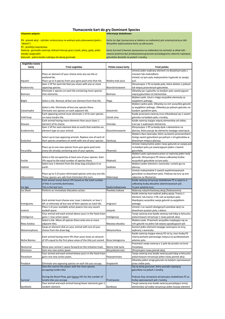 Używane pojęcia: Tłumaczenie kart do gry Dominant Species Informacje dodatkowe: PA -‐ pionek akcji -‐ cylinder umieszczany na wolnym polu planowania (pole z "okiem") PZ -‐ punkt(y) zwycięstwa Zwierzę -‐ gromada zwierząt, którymi kieruje gracz (ssaki, płazy, gady, ptaki, owady i pajęczaki) Gatunek -‐ jedna kostka należąca do danej gromady Angielska nazwa karty Treść angielska Biomass Place an element of your choice onto any sea tile or wetland tile. Place up to 4 species from your gene pool onto that tile. Gain 1 VP for each tile that you share with one or more opposing species. Eliminate 1 species on each tile containing more species than elements. Blight Select a tile. Remove all but one element from that tile. Aquatic Biodiversity Karta Ice Age (zaznaczona w tabelce na niebiesko) jest ostatnią kartą w talii. Wszystkie wykorzystane karty są odrzucane. Karta Survival (również zaznaczona na niebiesko) nie wchodzi w skład talii -‐ zawsze powinna być przekazywana graczowi posiadającemu obecnie najwięcej gatunków (kostek) na polach z tundrą. Polska nazwa karty Wodny tryb życia Biozróżnicowanie Biomasa Plaga Ecodiversity Select a tile. Elimimate all but one species there. Eliminate one species on each adjacent tile. Each opposing animal must eliminate 1 of its own species on every tundra tile. Each animal having more elements than yours loses 1 element of its choice. Gain 1 VP for each element disk on earth that matches an element type on your animal. Evolution Select up to two opposing animals. Replace one of each of their species anywhere on earth with one of your species. Ewolucja Fecundity Place up to one new species from your gene pool onto every tile already containing one of your species. Catastrophe Cold Snap Disease Fertile Habitat Hibernation Ice Age Ice Sheet Katastrofa Uścisk zimy Choroba Ekozróżnicowanie Plewność Select a tile occupied by at least one of your species. Gain VPs equal to the total number of species there. Płodność Select any 1 element from the draw bag and place it on earth. Siedlisko Place up to 5 of yoour eliminated species onto any one tile. These species are safe from Extinction this turn. Hibernacja Each animal scores bonus VPs based on the total number of tiles it currently dominates. This is the last turn. Epoka lodowcowa Perform an immediate Glaciation action. Powłoka lodowa Metamorphosis Each animal must choose one: Lose 1 element; or lose 1 AP; or eliminate all but one of their species on each tile. Imigranci Place 1 of your available action pawns into any vacant eyeball space. Instynkt Your animal and each animal above yours in the food chain gains 1 new action pawn. Inteligencja Select a tile. Move all species there onto one or more adjacent tiles. Masowy eksodus Swap an element disk on your animal with one of your choice from the draw bag. Metamorfoza Niche Biomes Each animal having more VPs than yours loses an amount of VPs equal to the first place value of the title just scored. Nisza biologiczna Immigrants Instinct Intelligence Mass Exodus Nocturnal Omnivore Parasitism Predator Survival Symbiotic Move your animal 1 space forward on the Initiative track. Nocny tryb życia Gain one new action pawn. Wszystkożerność Your animal and each animal below yours in the food chain gains one new action pawn. Pasożytnictwo Eliminate one opposing species on each tile you occupy. Give this card to the player with the most species occupying tundra tiles Drapieżnik During the Reset Phae, gain bonus VPs for the number of tundra tiles you occupy. Przetrwanie Your animal and each animal having fewer elements gain 1 random element. Symbioza Treść polska Umieść jeden wybrany element na dowolnym polu z morzem lub mokradłami. Umieść na tym polu maksymalnie 4 gatunki ze swojej puli. Otrzymujesz 1 PZ za każde pole, które dzielisz z jednym lub więcej przeciwnych gatunków. Zlikwiduj po 1 gatunku na każdym polu zawierającym więcej gatunków niż elementów. Wybierz pole. Usuń z niego wszystkie elementy za wyjątkiem jednego. Wybierz jedno pole. Zlikwiduj na nim wszystkie gatunki za wyjątkiem jednego. Zlikwiduj po jednym gatunku na każdym sąsiednim polu. Każde przeciwne zwierzę musi zlikwidować po 1 swoim gatunku na każdym polu z tundrą. Każde zwierzę mające więcej elementów od ciebie, traci po 1 wybranym elemencie. Otrzymujesz 1 PZ za każdy dysk z elementem na planszy, który pasuje do elementu twojego zwierzęcia. Wybierz dwa zwierzęta, które są twoimi przeciwnikami. Zastąp swoim gatunkiem po jednym z ich gatunków w dowolnym miejscu planszy. Umieść maksymalnie jeden nowy gatunek ze swojej puli na każdym polu już zawierającym jeden z twoich gatunków. Wybierz pole zajmowane przez co najmniej jeden twój gatunek. Otrzymujesz PZ równe całkowitej liczbie wszystkich gatunków na tym polu. Wybierz jeden element z woreczka i umieść go na planszy. Umieść maksymalnie 5 swoich wyeliminowanych gatunków na dowolnym polu. Podczas tej tury są one odporne na Wymarcie. Każde zwierzę otrzymuje dodatkowe PZ w oparciu o całkowitą liczbę aktualnie zdominowanych pól. To jest ostatnia tura. Wykonaj natychmiastową akcję Zlodowacenia. Każde zwierzę musi wybrać jedną opcję: Tracisz 1 element; lub tracisz 1 PA; lub na każdym polu likwidujesz wszystkie swoje gatunki za wyjątkiem jednego. Umieść 1 ze swoich dostępnych pionków akcji na dowolnym pustym polu z okiem. Twoje zwierzę oraz każde zwierzę nad tobą w łańcuchu pokarmowym otrzymuje 1 nowy pionek akcji. Wybierz pole. Przemieść wszystkie znajdujące się na nim gatunki na jedno lub więcej sąsiadujących pól. Zamień jeden element twojego zwierzęcia na inny, wybrany z woreczka. Każde zwierzę mające wiecej PZ niż ty, traci liczbę PZ równą wartości pierwszego miejsca na punktowanym właśnie polu. Przemieść swoje zwierzę o 1 pole do przodu na torze Inicjatywy. Otrzymujesz nowy pionek akcji. Twoje zwierzę oraz każd