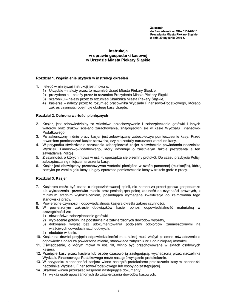 Załącznik do Zarządzenia nr ORo.0151-61/10 Prezydenta Miasta Piekary Śląskie z dnia 29 stycznia 2010 r. Instrukcja w sprawie gospodarki kasowej w Urzędzie Miasta Piekary Śląskie Rozdział 1. Wyjaśnienie użytych w instrukcji określeń 1. Ilekroć w niniejszej instrukcji jest mowa o: 1) Urzędzie – należy przez to rozumieć Urząd Miasta Piekary Śląskie, 2) prezydencie – należy przez to rozumieć Prezydenta Miasta Piekary Śląski, 3) skarbniku – należy przez to rozumieć Skarbnika Miasta Piekary Śląskie, 4) kasjerze – należy przez to rozumieć pracownika Wydziału Finansowo-Podatkowego, którego zakres czynności obejmuje obsługę kasy Urzędu. Rozdział 2. Ochrona wartości pieniężnych 2. Kasjer, jest odpowiedzialny za w łaściwe przechowywanie i zabezpieczenie gotówki i innych walorów oraz druków ścisłego zarachowania, znajdujących się w kasie Wydziału FinansowoPodatkowego. 3. Po zakończonym dniu pracy kasjer jest zobowiązany zabezpieczyć pomieszczenie kasy. Przed otwarciem pomieszczeń kasjer sprawdza, czy nie zostały naruszone zamki do kasy. 4. W przypadku stwierdzenia naruszenia zabezpiecze ń kasjer niezwłocznie powiadamia naczelnika Wydziału Finansowo-Podatkowego, który informuje o zaistniałym fakcie prezydenta a ten zawiadamia Policję. 5. Z czynności, o których mowa w ust. 4, sporządza się pisemny protokół. Do czasu przybycia Policji zabezpiecza się miejsca naruszenia kasy. 6. Kasjer jest obowiązany przechowywać wartości pieniężne w szafie pancernej (multisejfie), którą zamyka po zamknięciu kasy lub gdy opuszcza pomieszczenie kasy w trakcie godzi n pracy. Rozdział 3. Kasjer 7. Kasjerem może być osoba o nieposzlakowanej opinii, nie karana za przest ępstwa gospodarcze lub wykroczenia przeciwko mieniu oraz posiadaj ąca pełną zdolność do czynności prawnych, z minimum średnim wykształceniem, posiadająca wymagane kwalifikacje do zajmowania tego stanowiska pracy. 8. Powierzone czynności i odpowiedzialność kasjera określa zakres czynności. 9. W powierzonym zakresie obowiązków kasjer ponosi odpowiedzialno ść materialną w szczególności za: 1) niewłaściwe zabezpieczenie gotówki, 2) wypłacenie gotówki na podstawie nie zatwierdzonych dowodów wyp łaty, 3) dokonanie wypłat bez udokumentowania podpisami odbiorców zamieszczonymi na właściwych dowodach rozchodowych, 4) niedobór w kasie. 10. Kasjer na dowód przyjęcia odpowiedzialności materialnej musi złożyć pisemne oświadczenie o odpowiedzialności za powierzone mienie, stanowiące załącznik nr 1 do niniejszej instrukcji. 11. Oświadczenie, o którym mowa w ust. 10, winno być przechowywane w aktach osobowych kasjera. 12. Przejęcie kasy przez kasjera lub osobę czasowo ją zastępującą, wyznaczoną przez naczelnika Wydziału Finansowego-Podatkowego może nastąpić wyłącznie protokolarnie. 13. W przypadku nieobecności kasjera winno nastąpić protokolarne przekazanie kasy w obecno ści naczelnika Wydziału Finansowo-Podatkowego lub osoby go zastępującej. 14. Skarbnik winien przekazać kasjerom następujące dokumenty: 1) wykaz osób upoważnionych do zatwierdzania dowodów kasowych, 1 2) wzory bankowe podpisów osób upoważnionych do zatwierdzania dowodów stanowiących podstawę operacji kasowych, 3) instrukcję kasową. Rozdział 4. Gospodarka kasowa 15. Gotówkowe rozliczenia w Urzędzie prowadzone są za pośrednictwem kas. 16. Operacje kasowe wykonuje kasjer. 17. Za prawidłowe zorganizowanie gospodarki kasowej odpowiada naczelnik Wydziału FinansowoPodatkowego. 18. W kasie mogą być przechowywane: 1) gotówka podjęta z rachunku bankowego na pokrycie okre ślonych wydatków, 2) gotówka pochodząca z bieżących wpływów, 3) gotówka przechowywana w formie depozytu, 4) gotówka na bieżące wydatki – pogotowie kasowe. 19. Wysokość pogotowia kasowego ustala się w wysokości 1.500,- zł dla każdej z kas. 20. Pogotowie kasowe podejmowane jest na początku roku i ujmowane jako wydatek z dz. 750, rozdz. 75023, paragrafu 4210 . 21. W ostatnim dniu roku kalendarzowego pogotowie kasowe odprowadzane jest na konto banko we, z którego zostało podjęte. 22. Gotówka podejmowana do kasy z rachunku ba nkowego poza pogotowiem kasowym jest przeznaczona na określone cele. 23. Gotówka z banku pobierana jest przez kasjera na podstawie dokumentu wygenerowanego przez pracownika Referatu Finansowego Wydziału Finansowo-Budżetowego w systemie bankowości elektronicznej. 24. Dokument, o którym mowa w ust. 23, pracownik Referatu Finansowego Wydzia łu FinansowoBudżetowego sporządza na podstawie zatwierdzonych do wyp łaty dowodów. 25. Gotówka podjęta z banku na określone cele może być przechowywana w kasie przez okres nie dłuższy niż 10 dni roboczych. Powyższy termin nie dotyczy wypłat gotówkowych diet dla członków Komisji Wyborczych. 26. Po tym okresie gotówkę należy odprowadzić na odpowiedni rachunek bankowy. 27. Przyjmowane wpłaty winny być odprowadzane w dniu przyjęcia gotówki lub w dniu nast ępnym na odpowiedni rachunek bankowy , na zasadach określonych w umowie z bankiem. Rozdział 5. Dokumentacja obrotu kasowego 28. Kasjer dokonuje wypłat gotówkowych ze środków budżetowych podjętych z banku. 29. W przypadku zwrotów nienależnie uiszczonych należności budżetowych kasjer może dokonać wypłat gotówkowych z bieżących środków posiadanych w kasie na poszczególnych kontach . 30. Wypłaty gotówkowe z kasy mogą być dokonane jedynie na podstawie dokumentów źródłowych, takich jak: 1) lista płac, 2) faktury, rachunki, 3) wniosek o zaliczkę, 4) rozliczenie delegacji służbowej, 5) wnioski złożone przez klientów, 6) innych dowodów spełniających wymogi dowodów wypłat. 31. Przedkładane w kasie do realizacji dowody musz ą być sprawdzone pod względem merytorycznym i formalno-rachunkowym oraz zatwierdzone do wyp łaty. 32. Kasjer może odmówić przyjęcia do kasy dokumentów kasowych