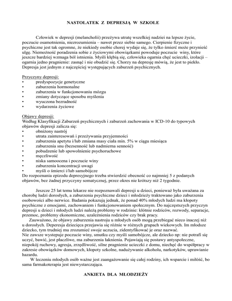 NASTOLATEK Z DEPRESJĄ W SZKOLE Człowiek w depresji (melancholii) przeżywa utratę wszelkiej nadziei na lepsze życie, poczucie osamotnienia, niezrozumienia – nawet przez siebie samego. Cierpienie fizyczne i psychiczne jest tak ogromne, że niekiedy osobie chorej wydaje się, że tylko śmierć może przynieść ulgę. Niemożność poradzenia sobie z życiowymi obowiązkami powoduje poczucie winy, które jeszcze bardziej wzmaga ból istnienia. Myśli kłębią się, człowieka ogarnia chęć ucieczki, izolacji – ogarnia jedno pragnienie: zasnąć i nie obudzić się. Chorzy na depresję mówią, że jest to piekło. Depresja jest jednym z najczęściej występujących zaburzeń psychicznych. Przyczyny depresji: • predyspozycje genetyczne • zaburzenia hormonalne • zaburzenia w funkcjonowaniu mózgu • zmiany dotyczące sposobu myślenia • wyuczona bezradność • wydarzenia życiowe Objawy depresji: Według Klasyfikacji Zaburzeń psychicznych i zaburzeń zachowania w ICD-10 do typowych objawów depresji zalicza się: • obniżony nastrój • utrata zainteresowań i przeżywania przyjemności • zaburzenia apetytu i/lub zmiana masy ciała min. 5% w ciągu miesiąca • zaburzenia snu (bezsenność lub nadmierna senność) • pobudzenie lub spowolnienie psychoruchowe • męczliwość • niska samoocena i poczucie winy • zaburzenia koncentracji uwagi • myśli o śmierci i/lub samobójcze Do rozpoznania epizodu depresyjnego trzeba stwierdzić obecność co najmniej 5 z podanych objawów, bez żadnej przyczyny somatycznej, przez okres nie krótszy niż 2 tygodnie. Jeszcze 25 lat temu lekarze nie rozpoznawali depresji u dzieci, ponieważ była uważana za chorobę ludzi dorosłych, a zaburzenia psychiczne dzieci i młodzieży traktowano jako zaburzenia osobowości albo nerwice. Badania pokazują jednak, że ponad 40% młodych ludzi ma kłopoty psychiczne z emocjami, zachowaniem i funkcjonowaniem społecznym. Do najczęstszych przyczyn depresji u dzieci i młodych ludzi należą problemy w rodzinie: kłótnie rodziców, rozwody, separacje, przemoc, problemy ekonomiczne, uzależnienia rodziców czy brak pracy. Zauważono, że objawy zaburzenia nastroju u młodych osób mogą przebiegać nieco inaczej niż u dorosłych. Deperesja dziecięca przejawia się różnie w różnych grupach wiekowych. Im młodsze dziecko, tym trudniej mu zrozumieć swoje uczucia, zidentyfikować je oraz nazwać. Nie zawsze wystepuje poczucie winy, smutku czy myśli samobójcze, ale dziecko np: nie potrafi się uczyć, bawić, jest płaczliwe, ma zaburzenia łaknienia. Pojawiają się postawy antyspołeczne, niepokój ruchowy, agresja, zrzędliwość, silne pragnienie ucieczki z domu, niechęć do współpracy w zakresie obowiązków domowych, kłopoty szkolne, nadużywanie alkoholu, narkotyków, uprawianie hazardu. W leczeniu młodych osób ważne jest zaangażowanie się całej rodziny, ich wsparcie i miłóść, bo sama farmakoterapia jest niewystarczająca. ANKIETA DLA MŁODZIEŻY Lp. Treść pytania TAK (Zaznacz odpowiedź TAK lub NIE) 1. Od ponad dwóch tygodni przez większą część dnia czujesz się przygnębiony lub rozdrażniony? 2. Złościsz się z błahych powodów? 3. Często czujesz się gorszy od innych? 4. Często myślisz, że nic Ci się nie uda? 5. Uważasz, że rodzice mniej Cię kochają niż rodzeństwo? 6. Nie potrafisz skupić się na lekacjach, zadaniach tak jak kiedyś? 7. Wyraźnie mniej rzeczy Cię cieszy i interesuje? 8. Obwiniasz siebie za różne sprawy? 9. Rzadziej spotykasz się ze znajomymi, mniej chętnie wychodzisz z domu? 10. Wolny czas spędzasz bezczynnie w swoim pokoju? 11. Znacznie mniej lub znacznie więcej śpisz? 12. Znacznie mniej lub znacznie więcej jesz? 13. Często coś Cię boli, miewasz różne dolegliwości? 14. Miewasz myśli, żeby zrobić sobie krzywdę? NIE