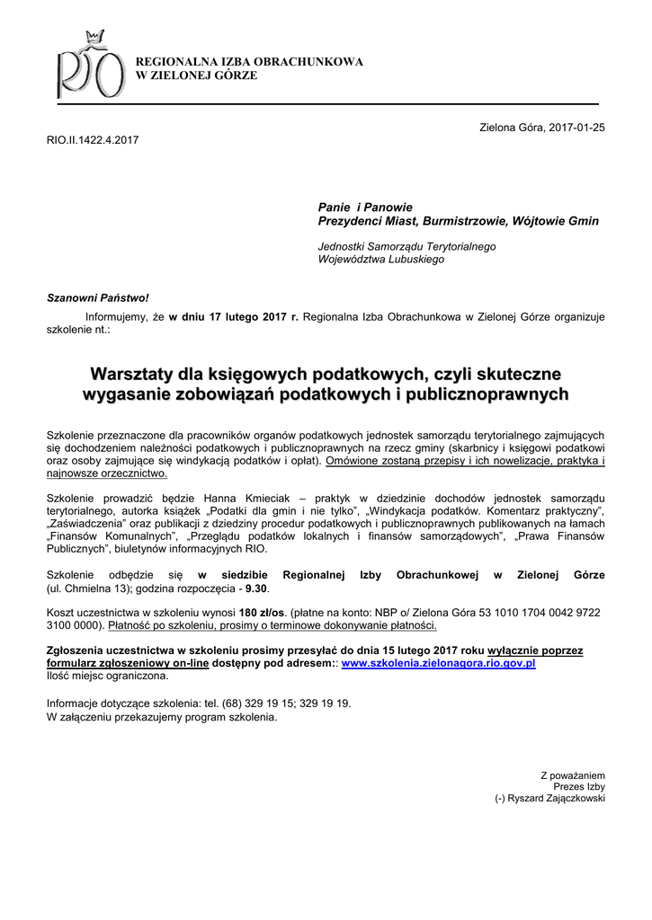 REGIONALNA IZBA OBRACHUNKOWA W ZIELONEJ GÓRZE Zielona Góra, 2017-01-25 RIO.II.1422.4.2017 Panie i Panowie Prezydenci Miast, Burmistrzowie, Wójtowie Gmin Jednostki Samorządu Terytorialnego Województwa Lubuskiego Szanowni Państwo! Informujemy, że w dniu 17 lutego 2017 r. Regionalna Izba Obrachunkowa w Zielonej Górze organizuje szkolenie nt.: Warsztaty dla księgow ych podatkow ych, czyli skuteczne wygasanie zobowiązań podatkowych i publicznoprawnych Szkolenie przeznaczone dla pracowników organów podatkowych jednostek samorządu terytorialnego zajmujących się dochodzeniem należności podatkowych i publicznoprawnych na rzecz gminy (skarbnicy i księgowi podatkowi oraz osoby zajmujące się windykacją podatków i opłat). Omówione zostaną przepisy i ich nowelizacje, praktyka i najnowsze orzecznictwo. Szkolenie prowadzić będzie Hanna Kmieciak – praktyk w dziedzinie dochodów jednostek samorządu terytorialnego, autorka książek „Podatki dla gmin i nie tylko”, „Windykacja podatków. Komentarz praktyczny”, „Zaświadczenia” oraz publikacji z dziedziny procedur podatkowych i publicznoprawnych publikowanych na łamach „Finansów Komunalnych”, „Przeglądu podatków lokalnych i finansów samorządowych”, „Prawa Finansów Publicznych”, biuletynów informacyjnych RIO. Szkolenie odbędzie się w siedzibie (ul. Chmielna 13); godzina rozpoczęcia - 9.30. Regionalnej Izby Obrachunkowej w Zielonej Górze Koszt uczestnictwa w szkoleniu wynosi 180 zł/os. (płatne na konto: NBP o/ Zielona Góra 53 1010 1704 0042 9722 3100 0000). Płatność po szkoleniu, prosimy o terminowe dokonywanie płatności. Zgłoszenia uczestnictwa w szkoleniu prosimy przesyłać do dnia 15 lutego 2017 roku wyłącznie poprzez formularz zgłoszeniowy on-line dostępny pod adresem:: www.szkolenia.zielonagora.rio.gov.pl Ilość miejsc ograniczona. Informacje dotyczące szkolenia: tel. (68) 329 19 15; 329 19 19. W załączeniu przekazujemy program szkolenia. Z poważaniem Prezes Izby (-) Ryszard Zajączkowski REGIONALNA IZBA OBRACHUNKOWA W ZIELONEJ GÓRZE Szkolenie Warsztaty dla księgowych podatkowych, czyli skuteczne wygasanie zobowiązań podatkowych i publicznoprawnych Termin: 17 luty 2017 r. Miejsce: RIO Zielona Góra (ul. Chmielna 13); godzina rozpoczęcia: 9.30 Prowadząca: Hanna Kmieciak Koszt uczestnictwa: 180 zł/os. UWAGA! Zgłoszenia uczestnictwa w szkoleniu prosimy przesyłać do dnia 15 lutego 2017 roku wyłącznie poprzez formularz zgłoszeniowy on-line dostępny pod adresem: www.szkolenia.zielonagora.rio.gov.pl PROGRAM SZKOLENIA 1. Zapłata podatku: Terminy zapłaty podatków, opłat i należności publicznoprawnych. Zapłata podatku przez podatników prowadzących działalność gospodarczą. Zarachowanie wpłaty. Rozliczenie wpłaty dokonanej po terminie płatności. Co to są działania informacyjne wierzyciela? Od kiedy liczymy koszty upomnienia? Czy koszty upomnienia podlegają umorzeniu? Kolejność zaliczania wpłat. Kiedy należy wydać postanowienie o zarachowaniu wpłaty? Kto może dokonać zapłaty podatku. Zapłata podatku u inkasenta – jak nie dopuścić do złamania tajemnicy skarbowej. Jakie dokumenty można udostępniać inkasentowi w celu poboru podatku. Ściąganie podatków przez firmy windykacyjne – czy jest to dozwolone? Zapłata zaległego podatku w organie egzekucyjnym. Na czym polega udział wójta, burmistrza w postępowaniu egzekucyjnym? Jak przyspieszyć egzekwowanie podatków przez organ egzekucyjny? Co zrobić, aby wójt nie płacił kosztów egzekucyjnych? Co z zaległościami dłużników nieściągalnych? Kiedy warto sięgać po egzekucję z nieruchomości? Jak prawidłowo postępować podczas egzekucji z nieruchomości? 2. Potrącenia: Potrącenie sposobem na dłużników będących jednocześnie wierzycielami gminy. Kiedy można dokonać potrącenia? Czy potrzebna jest zgoda podatnika? Potrącenie na wniosek dłużnika czy z urzędu? Na jaki dzień – w sytuacji potrącenia - liczymy odsetki? Postanowienie o dokonaniu potrącenia. Kiedy i w jaki sposób odmawiamy dokonania potrącenia? Czym różni się potrącenie podatku od potrącenia należności publicznoprawnej? 3. Nadpłata podatku: Co to jest nadpłata i kiedy powstaje? Kiedy organ podatkowy wydaje decyzję w sprawie nadpłaty? Czy nadpłata to tylko podatek czy również odsetki? Co z nadpłatą gdy podatnik ma inne zaległości? Czy podatnik powinien złożyć wniosek o zwrot nadpłaty? Kiedy zwrócić nadpłatę? W jakich przypadkach nie jest możliwe zwrócenie nadpłaty? Czy urząd może potrącić koszty zwrotu nadpłaty? Jaki jest termin zwrotu nadpłaty? W jaki sposób dokonujemy zwrotu nadpłaty? Jakich nadpłat nie zwracamy? Czy podatnikowi należą się odsetki od nadpłaty? Kiedy od nadpłaty liczymy odsetki (oprocentowanie nadpłaty)? Kiedy nie można orzekać w sprawie nadpłaty? Czy nadpłata się przedawnia? 4. Przeniesienie własności rzeczy lub praw majątkowych, czyli podatnik oddaje gminie swój majątek za długi: Komu przysługuje? Czy zawsze potrzebny jest wniosek podatnika? Czy konieczne jest zawarcie umowy z podatnikiem? Forma wyrażenia zgody lub jej odmowa. Czy do przejęcia nieruchomości w zamian za długi potrzebna jest uchwała rady gminy? Na jaki dzień – w sytuacji przeniesienia prawa w zamian za długi - liczymy odsetki? Czy konieczna jest w tej sprawie decyzja? 5. Umorzenie zaległości: Kiedy, kto i jak powinien składać wniosek o umorzenie? Co z wnioskami składanymi przed terminem płatności? Jakie dokumenty załączyć do wniosku? Co to znaczy ważny interes podatnika? Co nazywamy interesem publicznym? Czy organ podatkowy może czy musi umorzyć zaległość? Umorzenie podatku czy odsetek? Rozłożenie na raty podatku i umorzenie odsetek – co zrobić, gdy podatnik nie spłaca rat? Czy można umorzyć pod warunkiem? Umorzenie podatku a pomoc publiczna. Umorzenie zaległego podatku z urzędu. Czy można umorzyć podatek osobie trzeciej?