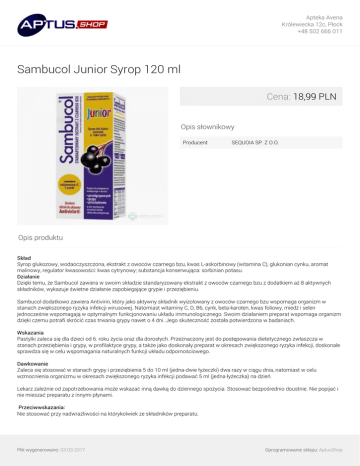 Apteka Avena Królewiecka 12c, Płock +48 502 666 011 Sambucol Junior Syrop 120 ml Cena: 18,99 PLN Opis słownikowy Producent SEQUOIA SP. Z O.O. Opis produktu Skład Syrop glukozowy, wodaoczyszczona, ekstrakt z owoców czarnego bzu, kwas L-askorbinowy (witamina C), glukonian cynku, aromat malinowy, regulator kwasowości: kwas cytrynowy; substancja konserwująca: sorbinian potasu. Działanie Dzięki temu, że Sambucol zawiera w swoim składzie standaryzowany ekstrakt z owoców czarnego bzu z dodatkiem aż 8 aktywnych składników, wykazuje świetne działanie zapobiegające grypie i przeziębieniu. Sambucol dodatkowo zawiera Antivirin, który jako aktywny składnik wyizolowany z owoców czarnego bzu wspomaga organizm w stanach zwiększonego ryzyka infekcji wirusowej. Natomiast witaminy C, D, B6, cynk, beta-karoten, kwas foliowy, miedź i selen jednocześnie wspomagają w optymalnym funkcjonowaniu układu immunologicznego. Swoim działaniem preparat wspomaga organizm dzięki czemu potrafi skrócić czas trwania grypy nawet o 4 dni. Jego skuteczność została potwierdzona w badaniach. Wskazania Pastylki zaleca się dla dzieci od 6. roku życia oraz dla dorosłych. Przeznaczony jest do postępowania dietetycznego zwłaszcza w stanach przeziębienia i grypy, w profilaktyce grypy, a także jako doskonały preparat w okresach zwiększonego ryzyka infekcji, doskonale sprawdza się w celu wspomagania naturalnych funkcji układu odpornościowego. Dawkowanie Zaleca się stosować w stanach grypy i przeziębienia 5 do 10 ml (jedna-dwie łyżeczki) dwa razy w ciągu dnia, natomiast w celu wzmocnienia organizmu w okresach zwiększonego ryzyka infekcji podawać 5 ml (jedna łyżeczka) na dzień. Lekarz zależnie od zapotrzebowania może wskazać inną dawką do dziennego spożycia. Stosować bezpośrednio doustnie. Nie popijać i nie mieszać preparatu z innymi płynami. Przeciwwskazania: Nie stosować przy nadwrażliwości na którykolwiek ze składników preparatu. Plik wygenerowano: 03-03-2017 Oprogramowanie sklepu: AptusShop Apteka Avena Królewiecka 12c, Płock +48 502 666 011 Produkt nie jest przeznaczony do stosowania pozajelitowego. Uwagi: Kobiety w ciąży i karmiące piersią powinny przyjmować preparat jedynie na wyraźne zalecenie lekarza. Preparat jest dietetycznym środkiem spożywczym specjalnego przeznaczenia medycznego. Nie stanowi wyłącznego źródła pożywienia, jedynie częściowe. Produkt powinien być przyjmowany pod nad nadzorem lekarza, nie jest przeznaczony do stosowania pozajelitowego. Pamiętaj, ze nie należy spożywać nieprzetworzonych owoców czarnego bzu lub produktów z czarnego bzu z niepewnych źródeł. Tylko dla dorosłych. W przypadku wystąpienia gorączki lub utrzymujących się objawów chorobowych należy niezwłocznie zasięgnąć porady lekarza. Preparat przechowywać w temperaturze pokojowej w sposób niedostępny dla małych dzieci. Plik wygenerowano: 03-03-2017 Powered by TCPDF (www.tcpdf.org) Oprogramowanie sklepu: AptusShop