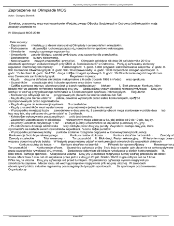 M�odzie�owy O�rodek Socjoterapii w Ostrowcu �wi�tokrzyskim Zaproszenie na Olimpiadê MOS Autor: Grzegorz Dominik Dyrektor, pracownicy oraz wychowankowie M³odzie¿owego O¶rodka Socjoterapii w Ostrowcu ¦wiêtokrzyskim maj± zaszczyt zaprosiæ na IV Olimpiadê MOS 2010 Cele imprezy: - Zapoznanie m³odzie¿y z ideami staro¿ytnej Olimpiady i ceremonia³em olimpijskim. - Podnoszenie aktywno¶ci ruchowej poprzez ró¿norodne formy sportowo-rekreacyjne. - Utrwalanie nawyku czynnego wypoczynku. - Umacnianie zasady „ czystej gry” oraz szacunku dla przeciwnika. - Doskonalenie kultury kibicowania. - Nawi±zywanie nowych znajomo¶ci i przyja¼ni. Olimpiada odbêdzie siê dnia 09 pa¼dziernika 2010 w obiektach sportowych zlokalizowanych przy MOS ul. Sienkiewicza 67 w Ostrowcu. Poni¿ej za³±czamy skrócony regulamin i harmonogram imprezy: Harmonogram: 1. godz. 8-830 przyjazd i zakwaterowanie zespo³ów 2. godz. 9930 Ceremonia Otwarcia Igrzysk 3 .godz. 930-10 odprawa kadry 4. godz. 1000 rozpoczêcie zmagañ sportowych 5. godz. 13-14 obiad 6. godz. 14-1730 druga czê¶æ zmagañ sportowych 9. godz. 18-19 wrêczanie nagród zwyciêzcom oraz Ceremonia zamkniêcia Igrzysk. Regulamin imprezy: - Ka¿da dru¿yna sk³adaæ siê bêdzie maksymalnie z 6 osób (rocznik 1992 i m³odsi) oraz opiekuna. - Uczestników obowi±zuje strój i obuwie sportowe oraz dobry humor - Czê¶æ sportowa imprezy planowana jest w trzech nastêpuj±cych blokach I. Blok pierwszy. Konkurs, który bêdzie mia³ za zadanie wy³onienie najlepszej dru¿yny „Dru¿ynowy piêciobój rekreacyjny” Dru¿yny startuj± w wed³ug przygotowanego terminarza w 5 konkurencjach sportowo- rekreacyjnych. Regulamin - Konkurencje odbywaj± siê na przygotowanych placach na terenie stadionu lub hali. - Ka¿da dru¿yna bierze udzia³ w piêciu, dowolnie wybranych przez siebie konkurencjach, spo¶ród zaproponowanych przez organizatorów. - Ka¿da dru¿yna do konkurencji wystawia 3 uczestników. - Ka¿dy z uczestników musi wystartowaæ przynajmniej w jednej konkurencji. - W przypadku mniejszej liczby zawodników w dru¿ynie ni¿ 3 zawodnicy obecni mog± startowaæ w próbie dwa lub trzy razy tak, aby zaliczono dru¿ynie udzia³ w 3 próbach. - Kolejno¶æ wykonywania poszczególnych prób jest dowolna. - Zawodnicy uczestnicz±cy w piêcioboju rekreacyjnym mog± zdobyæ w ka¿dej próbie od 0 do 10 pkt. ka¿dy. - Do próby uczestnik przystêpuje 1 raz i zdobyte punkty umieszczane s± na karcie punktowej dru¿yny. - Po zakoñczeniu komisja sêdziowska liczy zdobyte przez dru¿yny punkty. Zwyciêzc± zostaje dru¿yna, która zgromadzi³a na kartach swoich zawodników najwiêksz±, ³±czn± ilo¶æ punktów. - W przypadku jednakowej liczby punktów zostanie rozegrana dogrywka w losowowybranej konkurencji. Konkurencje 5-cio boju rekreacyjnego · Konkurs rzutów do kosza · Konkurs strza³ów na bramkê · Zawody si³ Zawody strzeleckie · Trial rowerowy · Tor przeszkód II. Blok drugi. Festyn rekreacyjny. W festynie mog± braæ u wszyscy obecni na p³ycie boiska W festynie proponujemy udzia³ w konkurencjach otwartych dla wszystkich chêtnych · Konkurs rzutów do kosza · Konkurs strza³ów na bramkê · Pi³karski tor sprawno¶ciowy · Rowerowy tor p Tor przeszkód · Konkurencje si³owe. Uczestnicy wykonuj± próby 5-cio boju w czasie gdy place nie s± wykorzystywane przez uczestników rywalizacji dru¿ynowej. Dodatkowo odbywaæ siê bêdzie rywalizacja w dwóch konkurencjach: III. Blok trzeci. Turnieje sportowe. Koszykówka uliczna Dru¿yny 3 osobowe rozgrywaj± turniej wed³ug przepisów do street kosza. Mecz trwa 5 min. lub do uzyskania przez jedn± z dru¿yn 20 pkt. Boisko 10x10 m gra odbywa siê na 1 kosz. Pi³ka no¿na uliczna Dru¿yny zg³aszaj± siê przed turniejem. Organizatorzy og³aszaj± system rozgrywek po zakoñczeniu zapisów. Mecze tocz± siê wed³ug przepisów rozgrywania pi³ki no¿nej ulicznej. W zawodach obowi±zywa³y bêd± aktualne regulaminy poszczególnych dyscyplin sportowych. Ze sportowym pozdrowieniem : Organizatorzy http://www.mos.ostrowiec.pl Kreator PDF Utworzono 3 March, 2017, 18:34