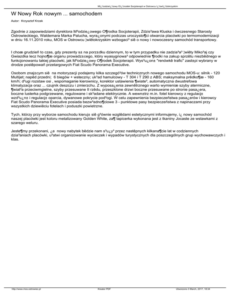 M�odzie�owy O�rodek Socjoterapii w Ostrowcu �wi�tokrzyskim W Nowy Rok nowym ... samochodem Autor: Krzysztof Krzak Zgodnie z zapowiedziami dyrektora M³odzie¿owego O¶rodka Socjoterapii, Zdzis³awa Kluska i ówczesnego Starosty Ostrowieckiego, Waldemara Marka Palucha, wyra¿onymi podczas uroczysto¶ci otwarcia placówki po termomodernizacji w dniu 16.11.2010 roku, MOS w Ostrowcu ¦wiêtokrzyskim wzbogaci³ siê o nowy i nowoczesny samochód transportowy. I choæ grudzieñ to czas, gdy prezenty s± na porz±dku dziennym, to w tym przypadku nie zadzia³a³ ¦wiêty Miko³aj czy Gwiazdka lecz hojno¶æ organu prowadz±cego, który wyasygnowa³ odpowiednie ¶rodki na zakup sprzêtu niezbêdnego w funkcjonowaniu takiej placówki, jak M³odzie¿owy O¶rodek Socjoterapii. Wys³u¿on± "renówkê trafic" zast±pi wybrany w drodze postêpowañ przetargowych Fiat Scudo Panorama Executive. Osobom znaj±cym siê na motoryzacji podajemy kilka szczegó³ów technicznych nowego samochodu MOS-u: silnik - 120 Multijet; napêd przedni; 6 biegów + wsteczny; uk³ad hamulcowy - T 304 i T 290 z ABS; maksymalna prêdko¶æ - 160 km/h; d³ugi rozstaw osi , wspomaganie kierownicy, korektor ustawienia ¶wiate³, automatyczna dwustrefowa klimatyzacja oraz ... czujnik deszczu i zmierzchu. Z wyposa¿enia zewnêtrznego warto wymieniæ szyby atermiczne, ¶wiat³a przeciwmgielne, szyby przesuwane II rzêdu, przeszklone drzwi boczne przesuwane po stronie pasa¿era, boczne lusterka podgrzewane, regulowane i sk³adane elektrycznie. A wewn±trz m.in. fotel kierowcy z regulacj± wzd³u¿n± i regulacj± oparcia, dywanowe pokrycie pod³ogi. W celu zapewnienia bezpieczeñstwa pasa¿erów i kierowcy Fiat Scudo Panorama Executive posiada bezw³adno¶ciowe 3 - punktowe pasy bezpieczeñstwa z napinaczami przy wszystkich dziewiêciu fotelach i poduszki powietrzne. Tych, którzy przy wyborze samochodu kieruj± siê g³ównie wzglêdami estetycznymi informujemy, i¿ nowy samochód naszej placówki jest koloru metalizowany Golden White, za¶ tapicerka wykonana jest z tkaniny Jocaste ze wstawkami z szarego weluru. Jeste¶my przekonani, ¿e nowy nabytek bêdzie nam s³u¿y³ przez nastêpnych kilkana¶cie lat w codziennych dzia³aniach placówki, u³atwi organizowanie wycieczek i wypadów turystycznych dla poszczególnych grup wychowawczych i klas. http://www.mos.ostrowiec.pl Kreator PDF Utworzono 3 March, 2017, 18:34